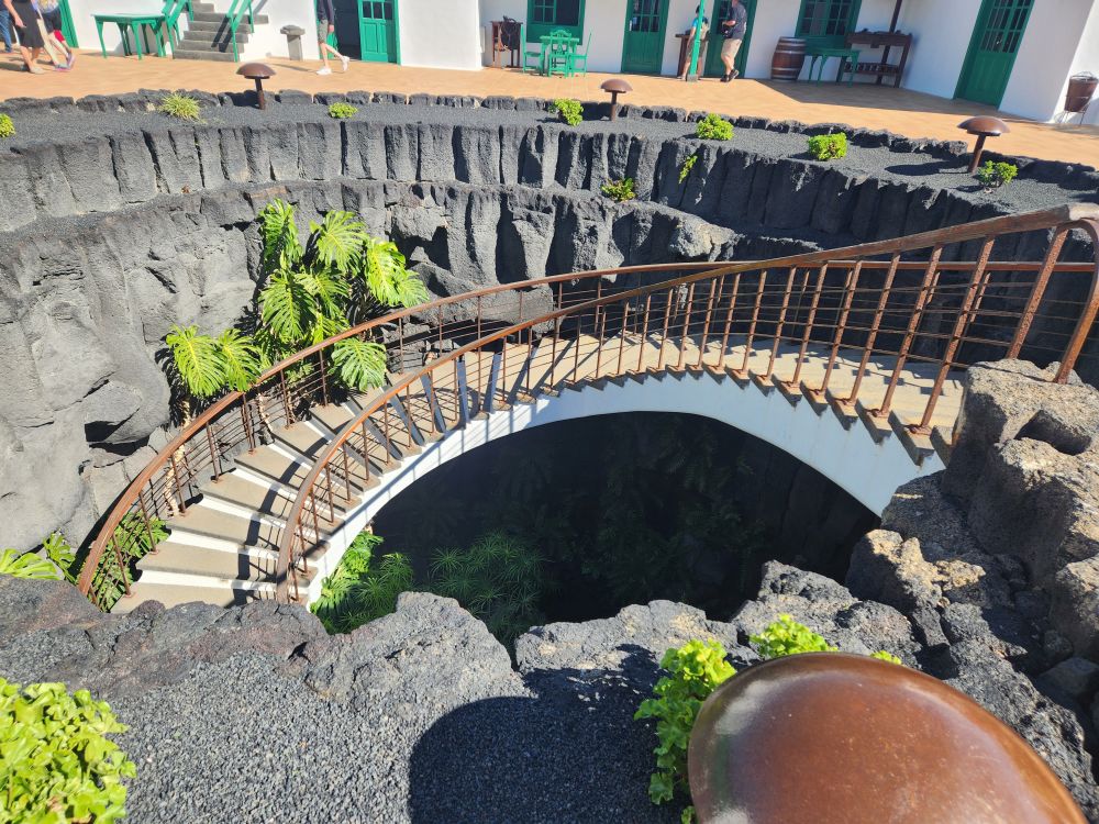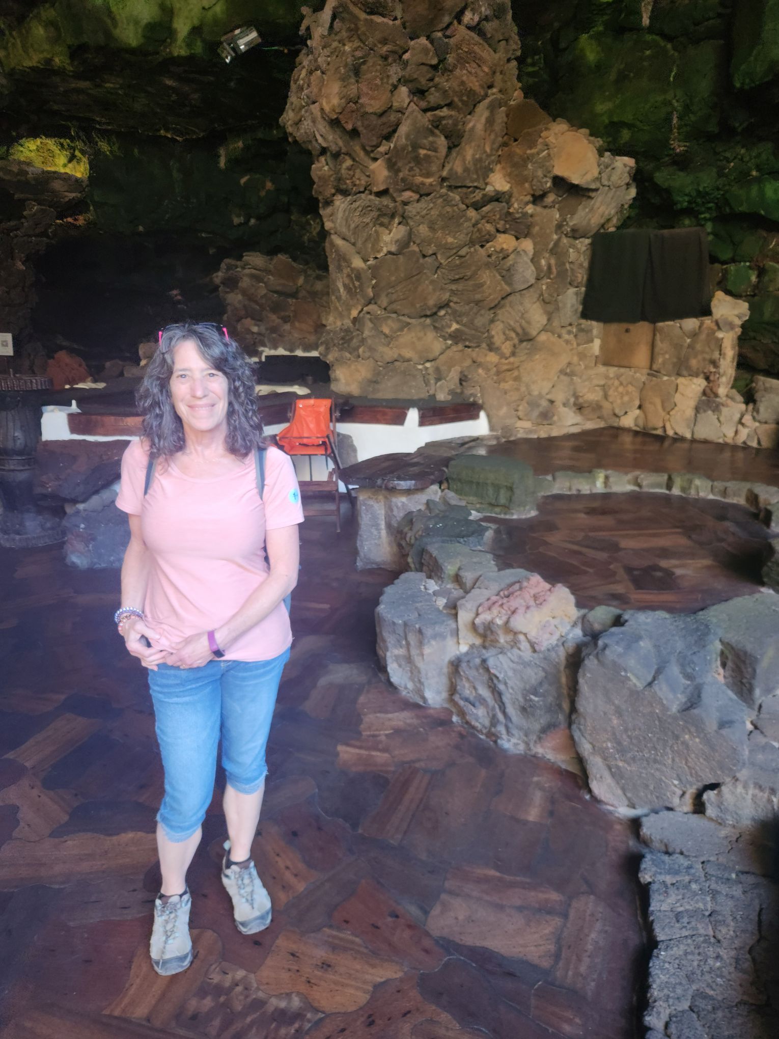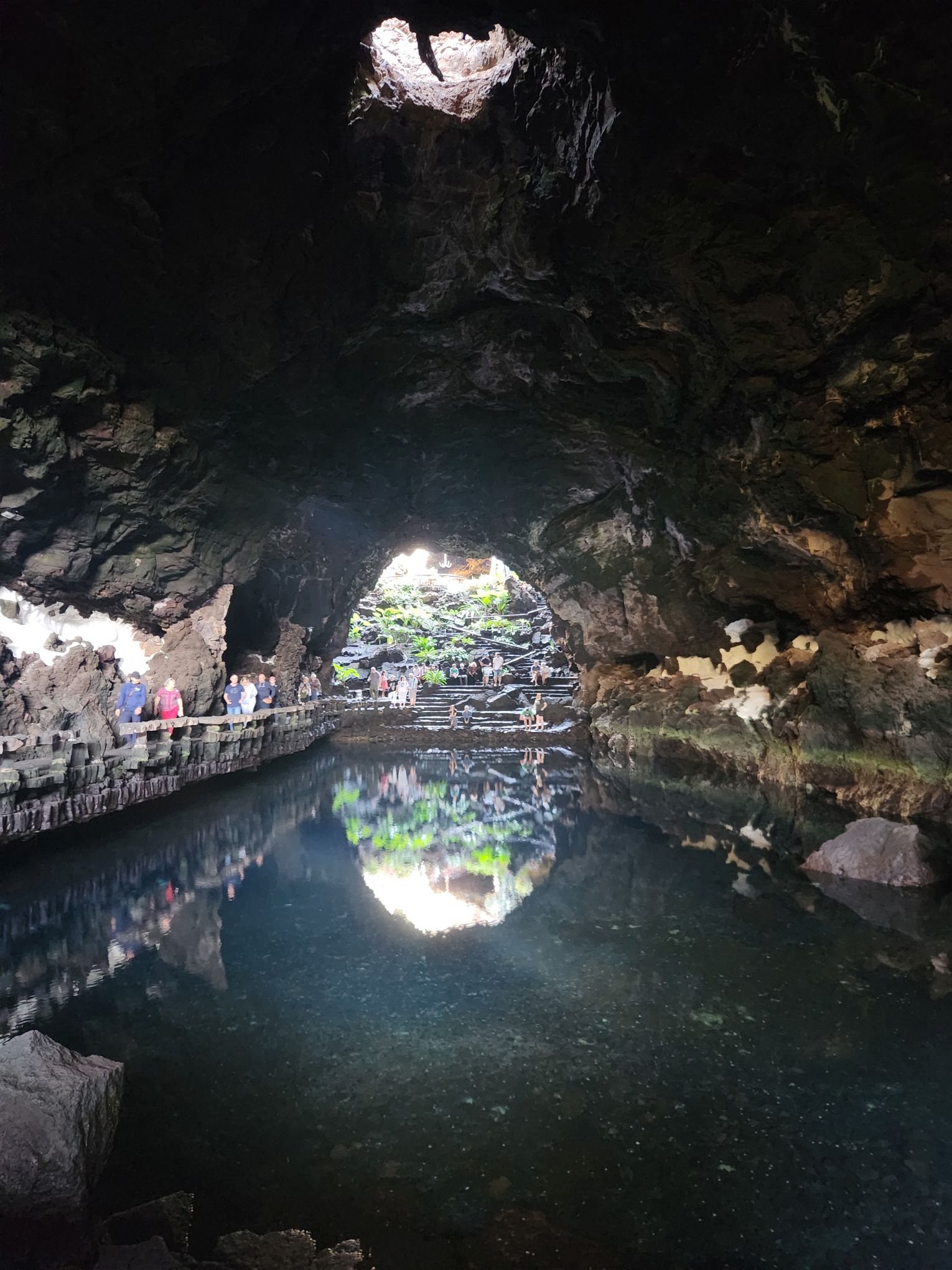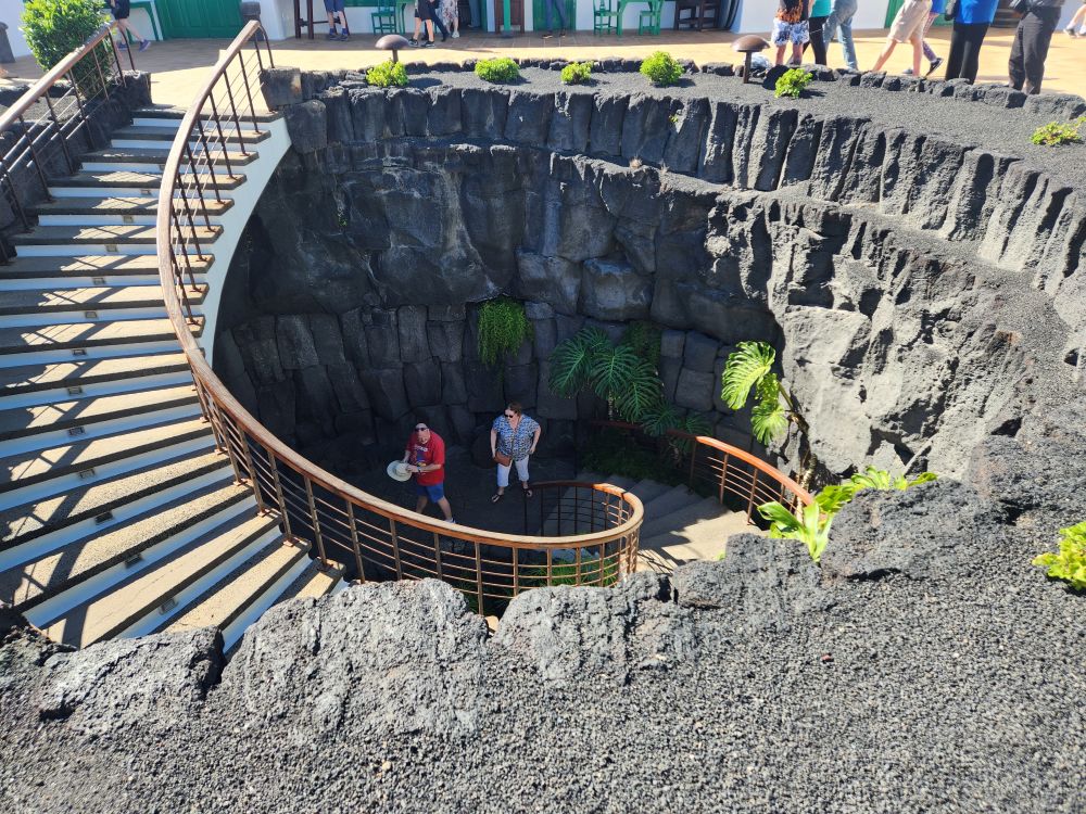Our next and final stop is at Jameos del Agua, a restaurant and nightclub created by Cesar Manrique. This underground enterprise contains a lagoon where little white crabs live and multiply, a full restaurant, two separate night club dance floors – one made of all recycled wood – a swimming pool (that is no longer in use, but still pristine clean), 3 coffee bars and an auditorium for concerts. Amazing and incredible and quite fun to explore! Cesar was a talented – and versatile – guy, that’s for sure!