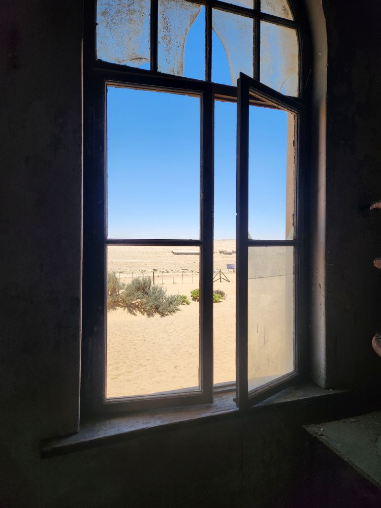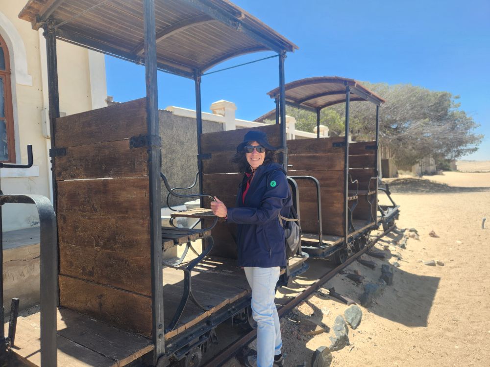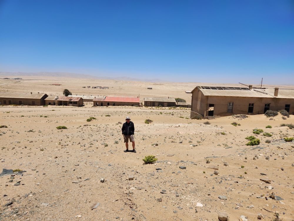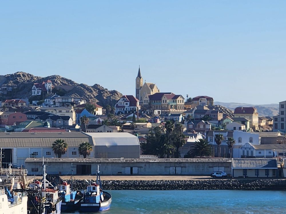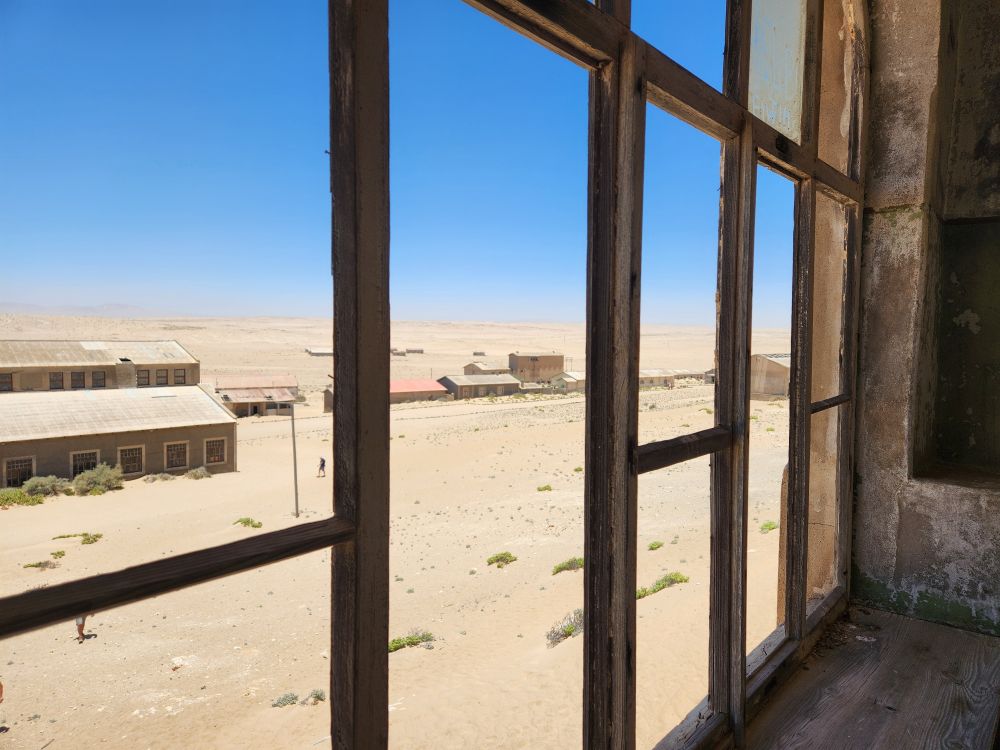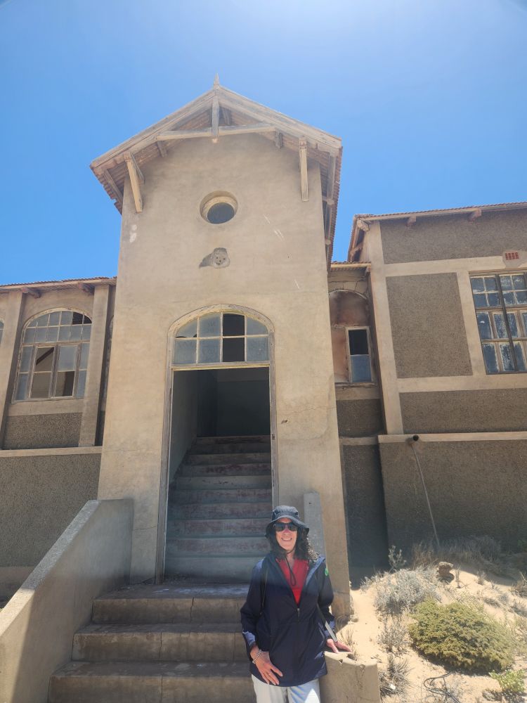 Today, yet another ship’s tour – but it is the easiest way to get to Kolmanskop ghost town that we can find. That is really the biggest thing to see here – there is another tour to see the wild horses, but hey, we’ve seen those in Corolla over the years – and we want to see the abandoned mining town. The only annoying thing is that the tour was originally scheduled for 3:30 and it has been changed to 12 noon – which messes up our original plan to do our own walking tour of the town, eat at the Portuguese Fisherman restaurant, then come back for the tour. So we pivot – normal morning routine, then we grab cold cuts and rolls from the breakfast buffet to have a quick picnic lunch on the balcony before we leave on our tour. Works!