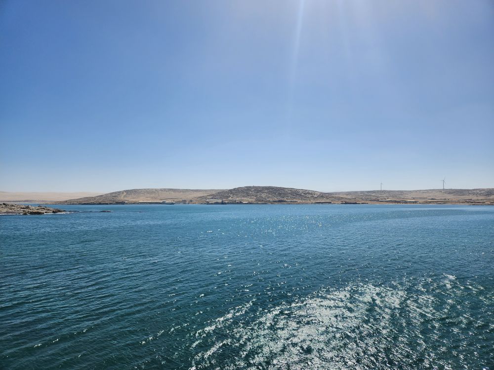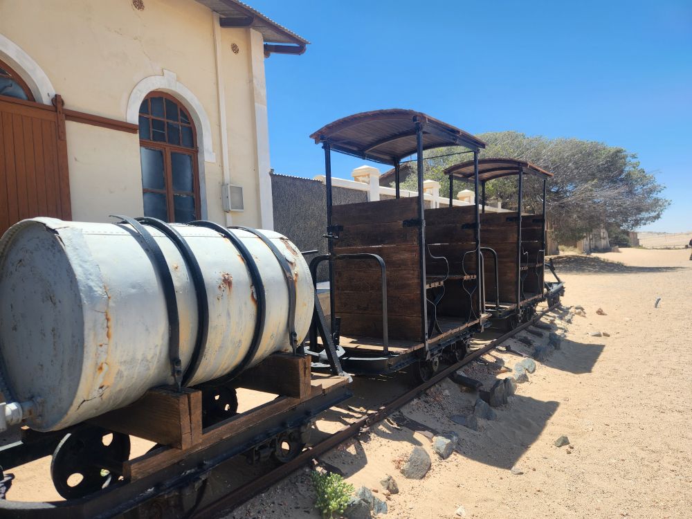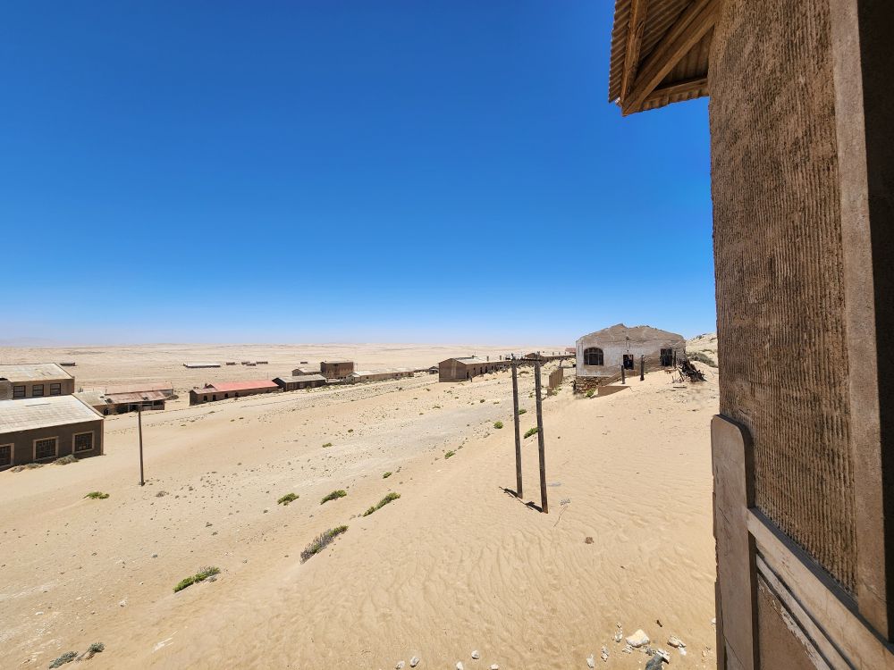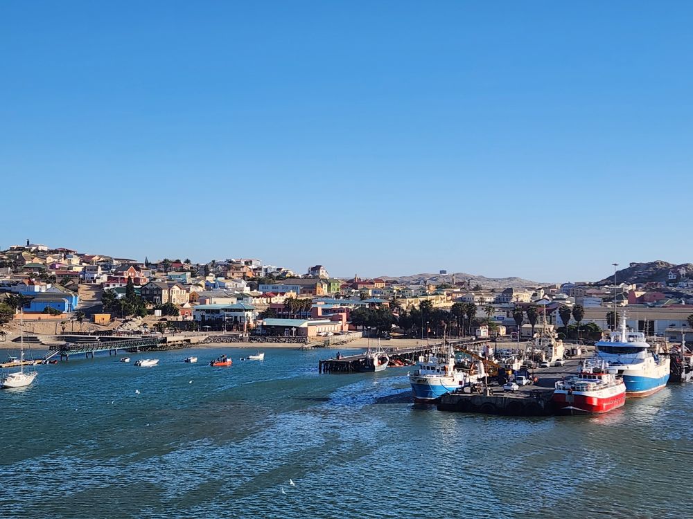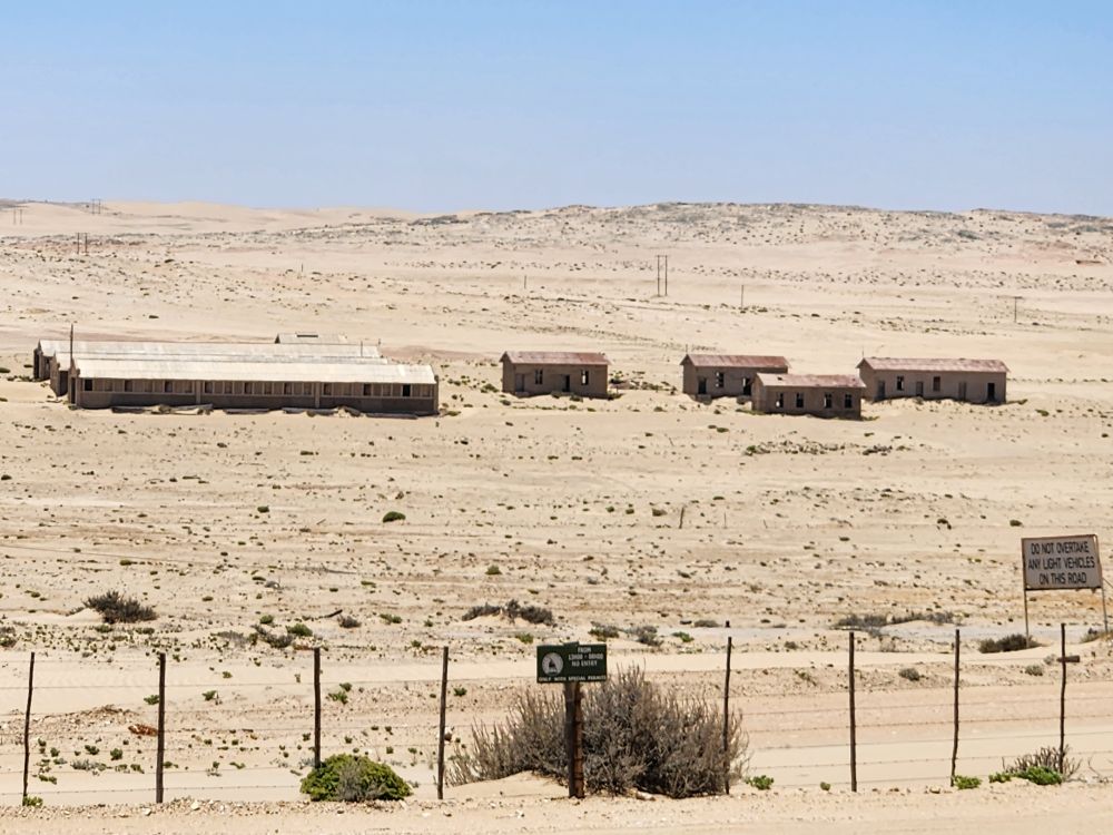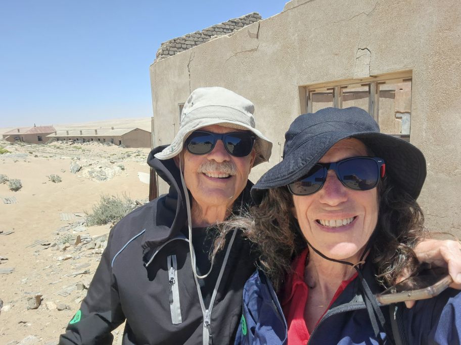 Today, yet another ship’s tour – but it is the easiest way to get to Kolmanskop ghost town that we can find. That is really the biggest thing to see here – there is another tour to see the wild horses, but hey, we’ve seen those in Corolla over the years – and we want to see the abandoned mining town. The only annoying thing is that the tour was originally scheduled for 3:30 and it has been changed to 12 noon – which messes up our original plan to do our own walking tour of the town, eat at the Portuguese Fisherman restaurant, then come back for the tour. So we pivot – normal morning routine, then we grab cold cuts and rolls from the breakfast buffet to have a quick picnic lunch on the balcony before we leave on our tour. Works!