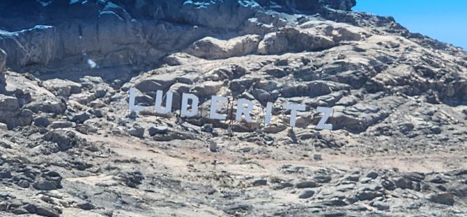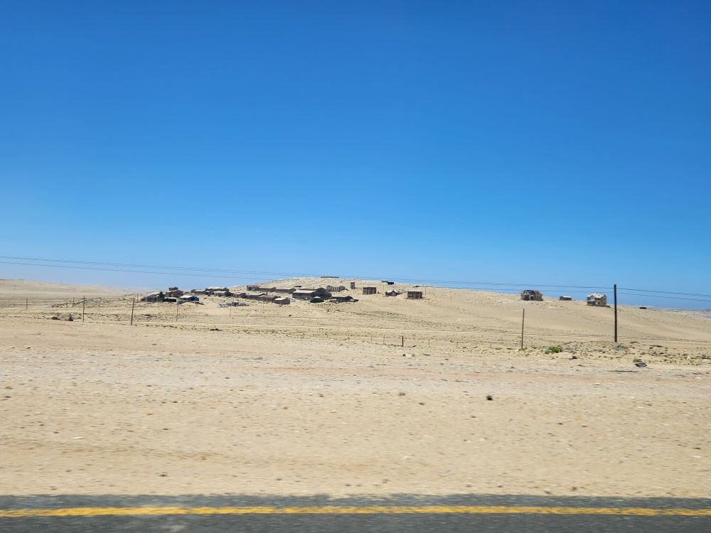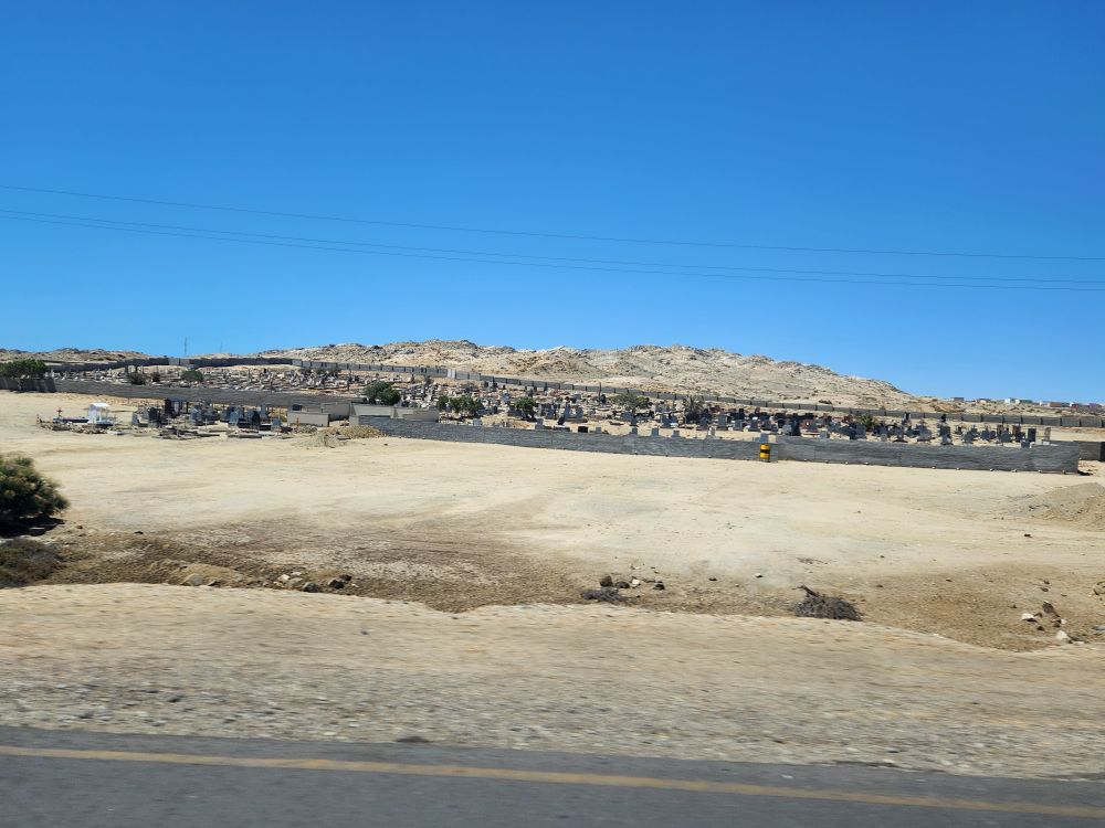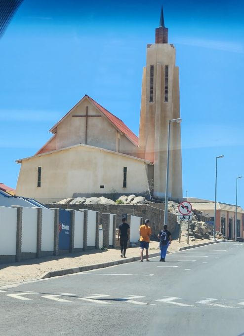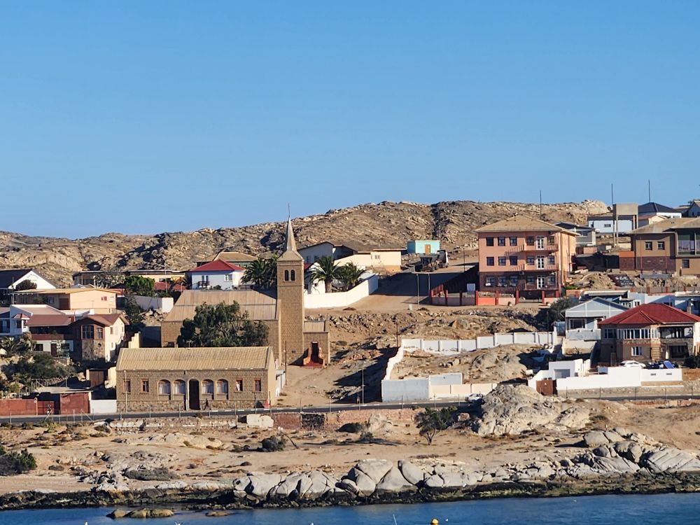 Everyone is on time and we head back into town, where the driver sweetly asks us if we want to stop to take pictures along the way. We keep asking everyone in the back, but they aren’t paying any attention, so we end up not stopping anywhere – but get some decent shots out the windshield – of the a little settlement out in the middle of nowhere, the cemetery, “Hollywood-type” Luderitz sign and St. Peter and Paul church, built on the huge rocks that line the main road.