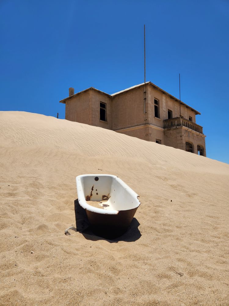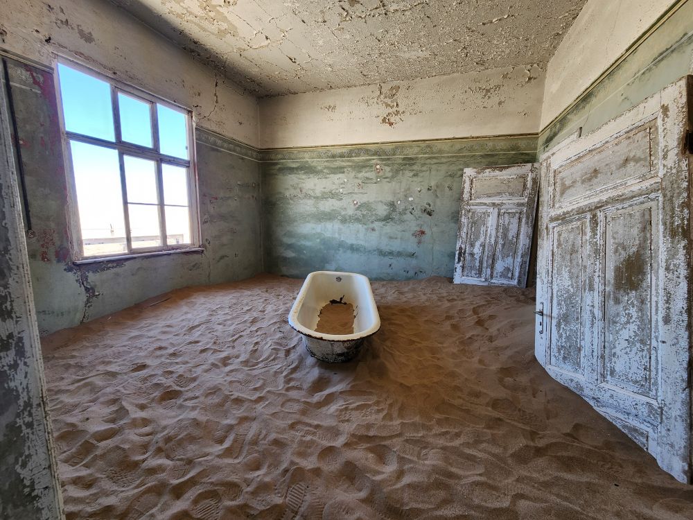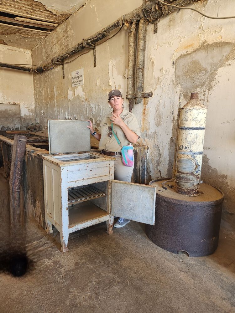 When we arrive, we meet our tour guide, Nicole, who is a doll – fun and funny – walks us through the town, giving us the broad history, and explaining that her great-great-great-great-grandfather worked as a miner there. Obviously the family never left – that’s some lineage! The area was founded when a transport driver named Johnny Coleman, got marooned up here in a terrible sandstorm. Driving an ox cart at the time, when the storm hit, his oxen ran off, his cart got stuck in the sand, and then completely covered and he managed to walk down into Luderitz safely after 2 days. Kolmanskop means Coleman’s peak or hill – skop is hill in Afrikaans.