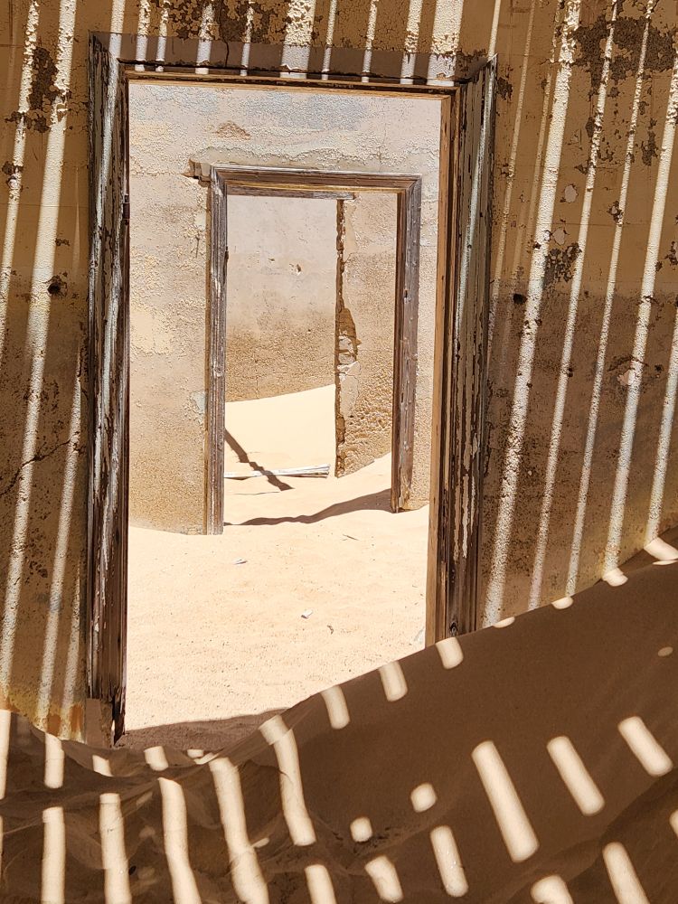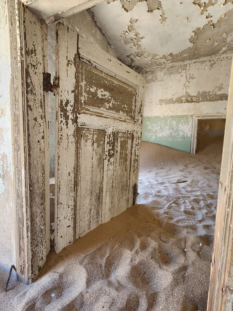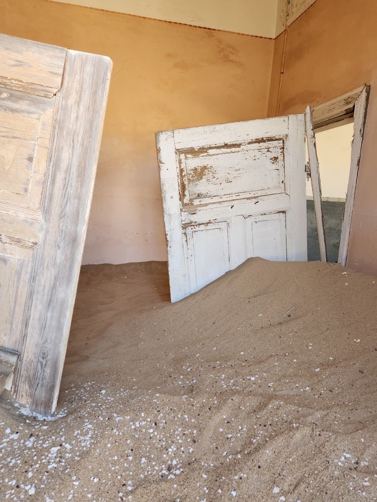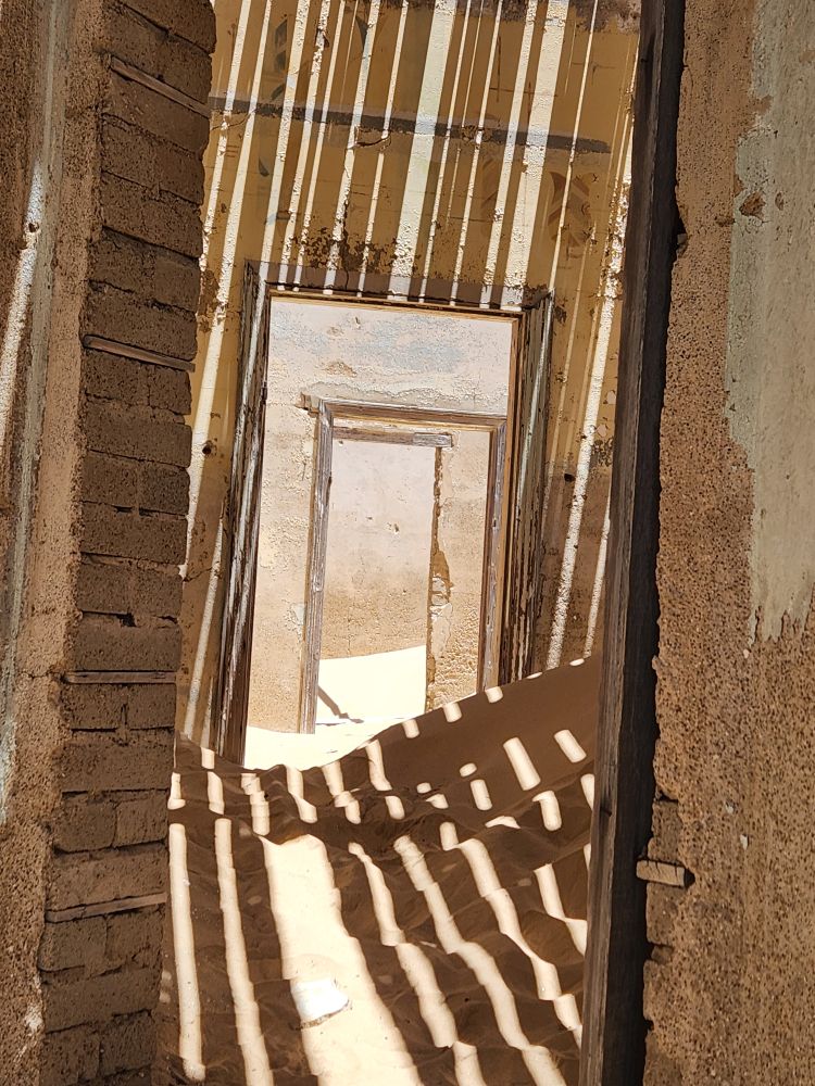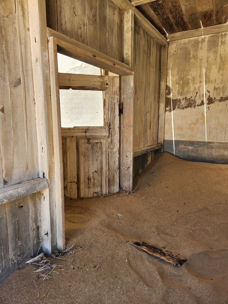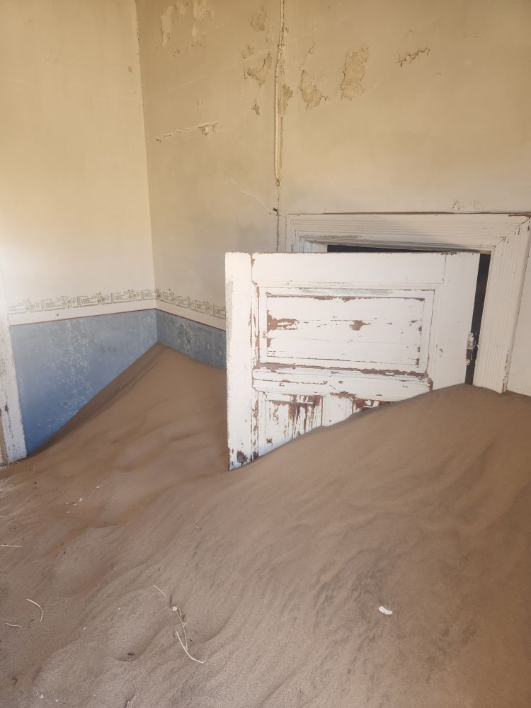The next house which is where the male workers were housed, is what I’m calling the door house – this is where the sand has drifted so deep it has submerged doors – keeping them standing open for eternity. Again here, access is through window frames and you can’t really go through to other rooms, you have to exit and reenter wherever the sand and the window frame will allow. Equally magical and frightening at the same time!
