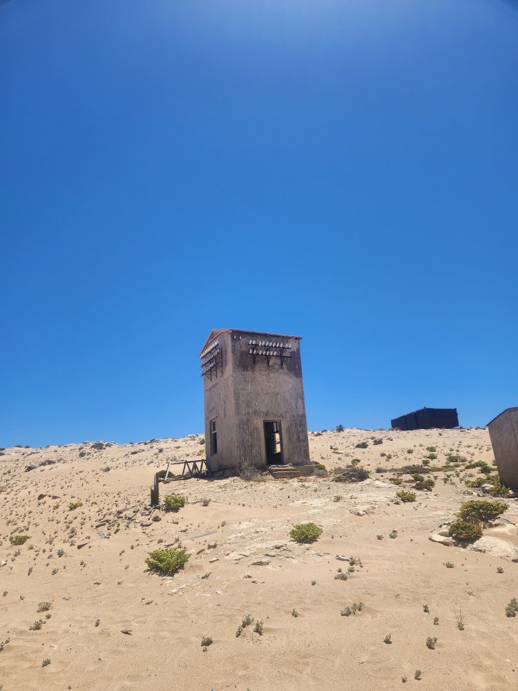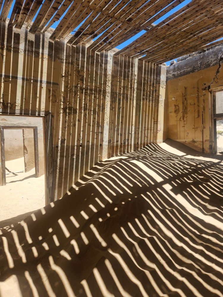 From that point little happened until the early 1900’s when a railway worker in the area found a diamond and showed it to his supervisor who realized the possibilities of the area. He set about claiming mining rights to a lot of the area, but the word got out and a diamond rush was on. The town was developed into a self-sufficient place complete with retail shops, a ballroom, a skittle-ball (bowling) alley, a hospital – everything anyone would need. They even had the very first x-ray machine! It was used to scan the workers as they left to alleviate theft! If someone was found to have swallowed the diamonds, they were given castor oil and there was a special latrine where they had to “deposit” the diamonds, which were then fished out (yeah, that’s a great job!) and returned to the company. At some point Germany declared the area Sperrgebiet – if we recall correctly this was essentially a protected governmental area where they could exploit the diamond mining. Eventually, the mining dried up as more diamonds were found on the coastline and the town was abandoned, left to the sands of time, so to speak (ok, yeah, groan, I hear you all out there!).