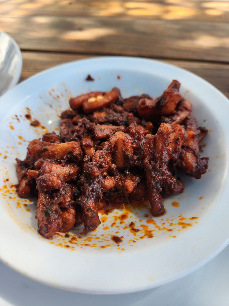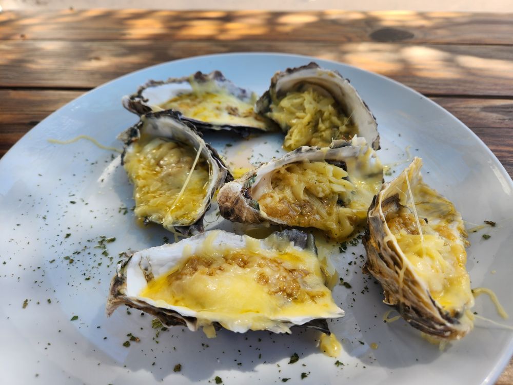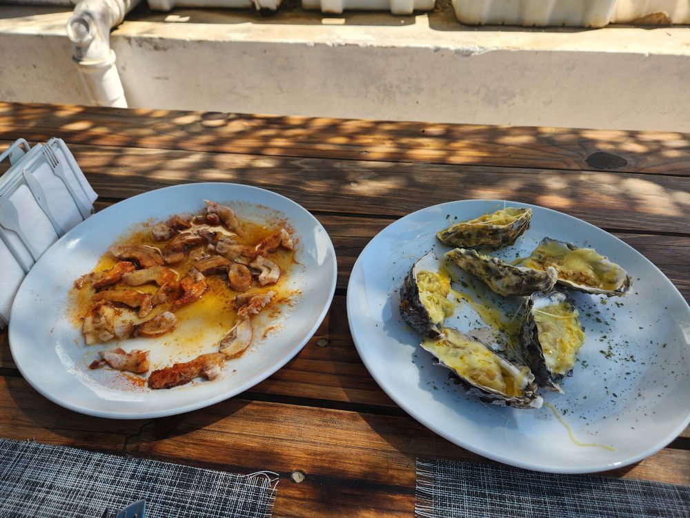 The driver drops us off in town as we had requested, the rest of the bus stays on to go back to the ship, and we head off to the Portuguese Fisherman, figuring we’ll just have snacks before going back. A late tapas kind of meal! The setting here is wonderful – right by the water with that great breeze. We’re seated outside under an awning to protect us from the sun, with excellent wine and beer, and lovely little plates of octopus “salad”, calamari tentacles and yummy baked oysters. Excellent tapas and not too filling so that we won’t be able to eat dinner – because of course, how can you skip dinner? LOL.