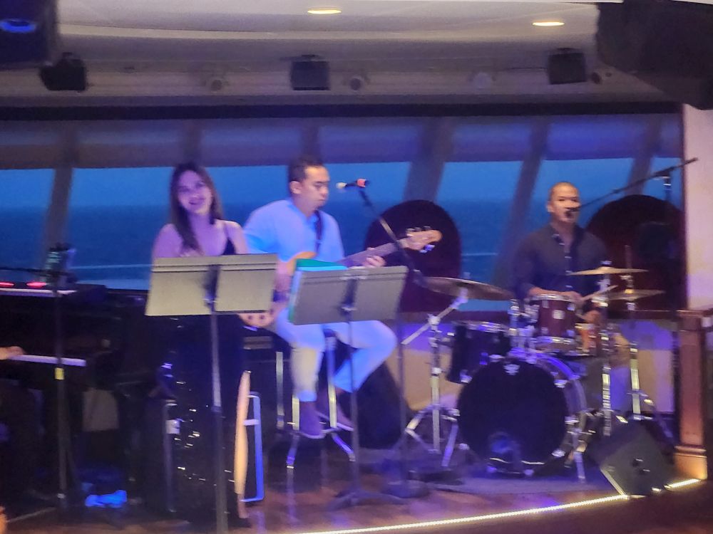 Meeting done, we make our dinner reservations – no South African Chef’s table. What? That is just bizarre. So we do the Italian one – have not done that in ages. Then it is on to the gym. Before dinner we stop in the Den to say goodbye to Myra and give her a little gift, then stay for Isiah’s evening solo with Rory at the piano. Such a voice!