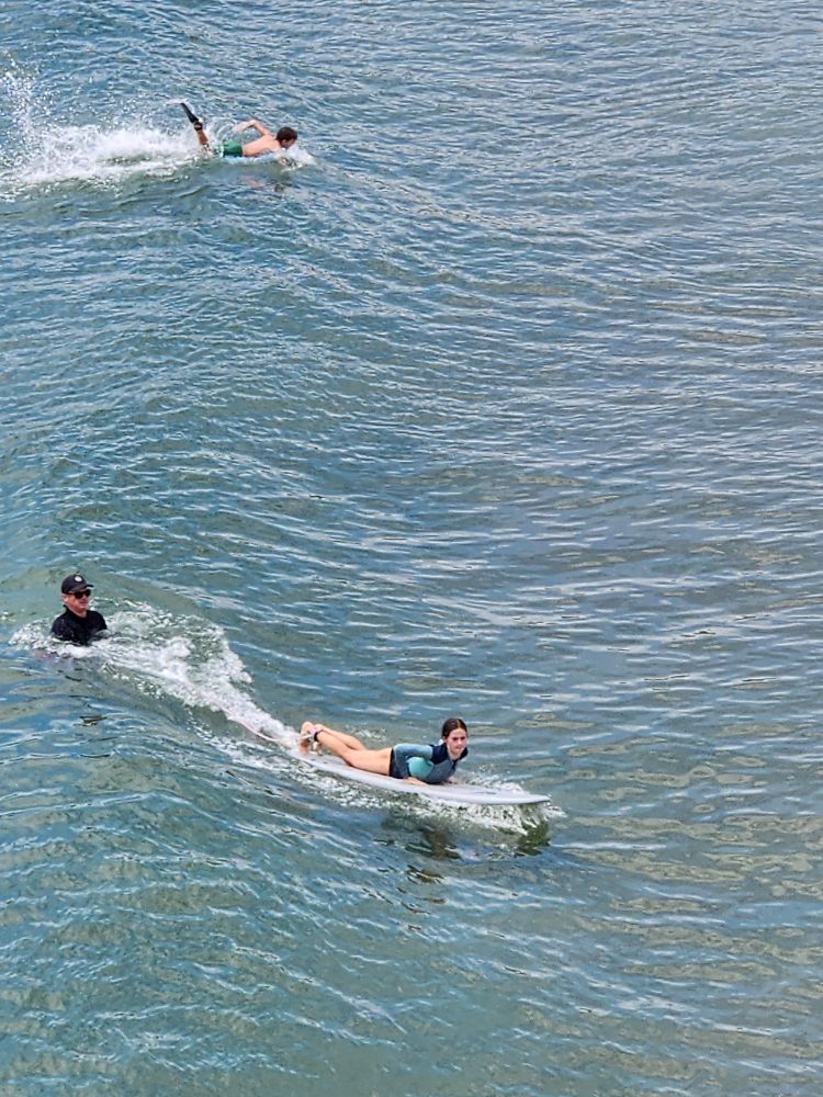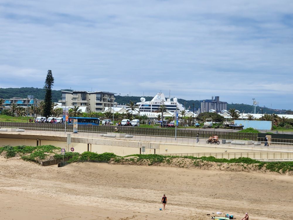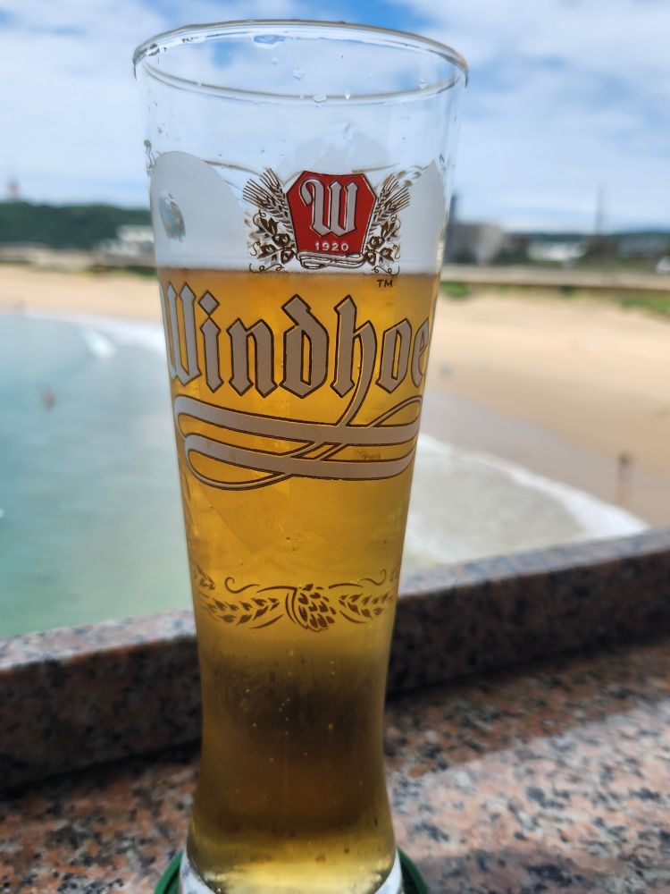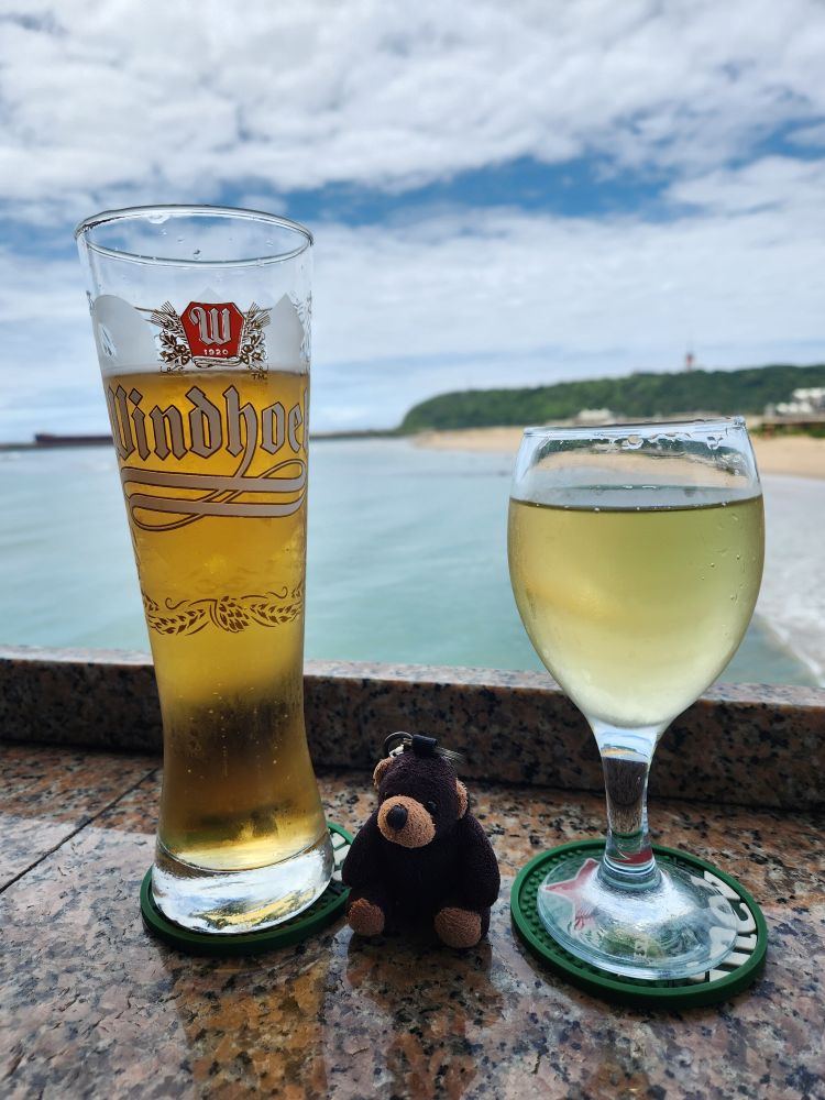 Out into the sunshine we go, walking the 10 minutes to the Village Marketplace – just as we remembered! Today is Reunification Day, a national holiday, so we aren’t too sure if every place will be open. We had nothing to fear! Every shop is open and the place is hopping with locals and visitors alike on holiday. We meander through, looking at a few of the shops, but nothing really strikes our fancy. Continuing on, we head to the end of the mall and the beach and the restaurant over the water where we had lunch on our last visit! What the heck? It is a great location, great to sit out over the water – we’ll just repeat history! It isn’t the same restaurant any longer – now it is Ku D’la Pier, not Moyo’s, and no longer are there traditional foods, but more pub type snacks. That actually works better for us since we have our picnic waiting for us onboard. So, just to break our rut, we sit on the opposite side of the deck from where we sat on our first visit, overlooking the quieter portion of the beach, watching a dad teach his daughter to surf. Ordering wine, beer and some really quite excellent peri-peri wings, we spend a lovely 45 minutes or so enjoying the weather, the scenery and our perfect little pre-picnic snack! And Sunny decides to make another appearance. He’s getting quite bold now when there isn’t wind, cold, rain or animals around.