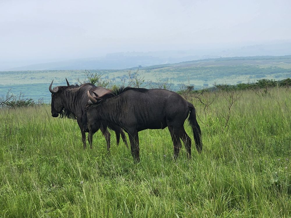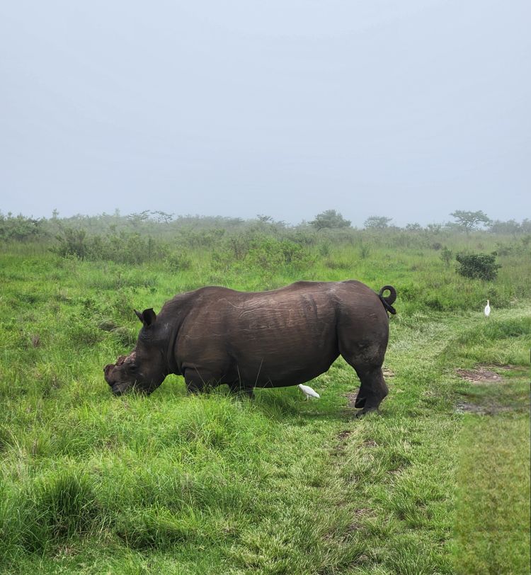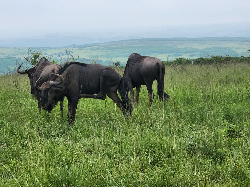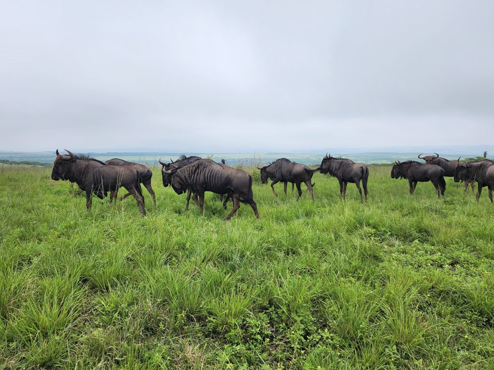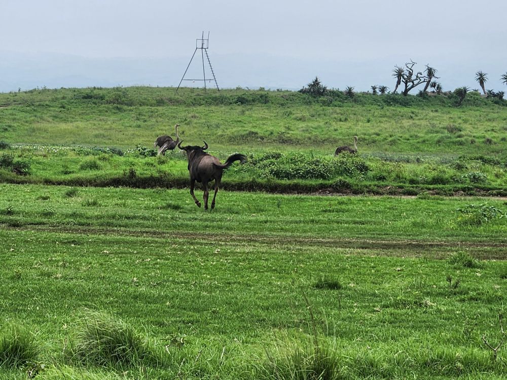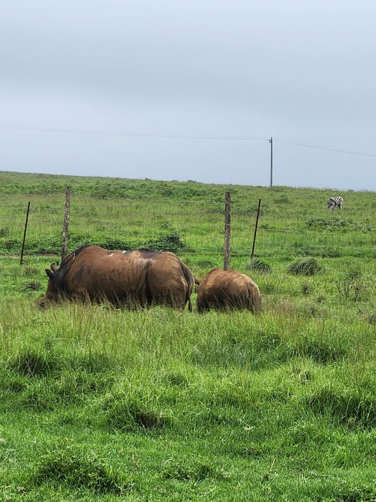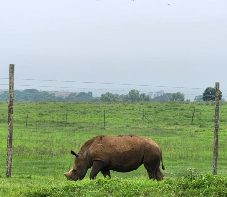 Moving farther into the field, we see our first rhinos of the trip! A mom and a baby grazing by a fence. How cool! The guide maneuvers so we are right up close and can watch them walk past and out into the other fields. There is also a wildebeest – they are so ugly and scary – and fast! That guy takes off when we annoy him, and boy can he move.