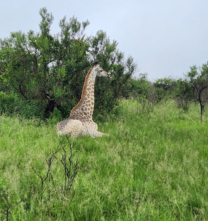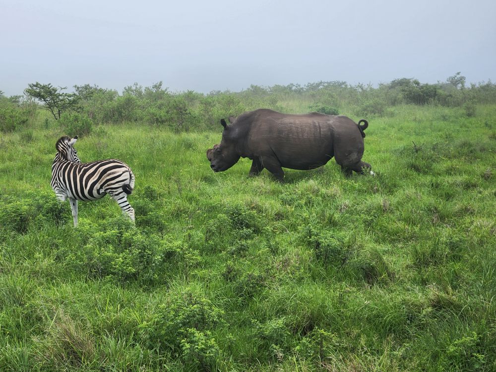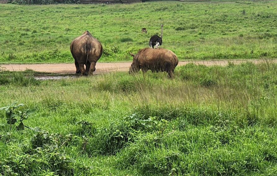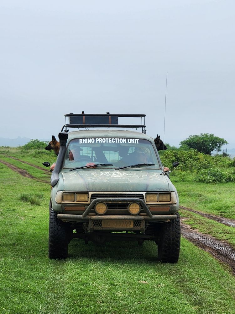 We watch the rhinos until they leave, then turn to head further into the park, driving past the Rhino Protection team. How cool is that? To patrol for poachers – even though the rhino’s tusks have been cut off to eliminate the risk. As we drive past the jeep, the dogs in the bag go absolutely ape shit. Yeah, we’d not be poaching anywhere near here with those nasty beasts! They do the job all right.