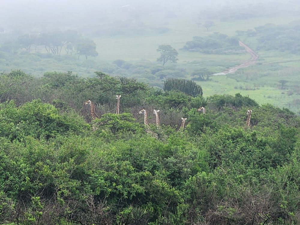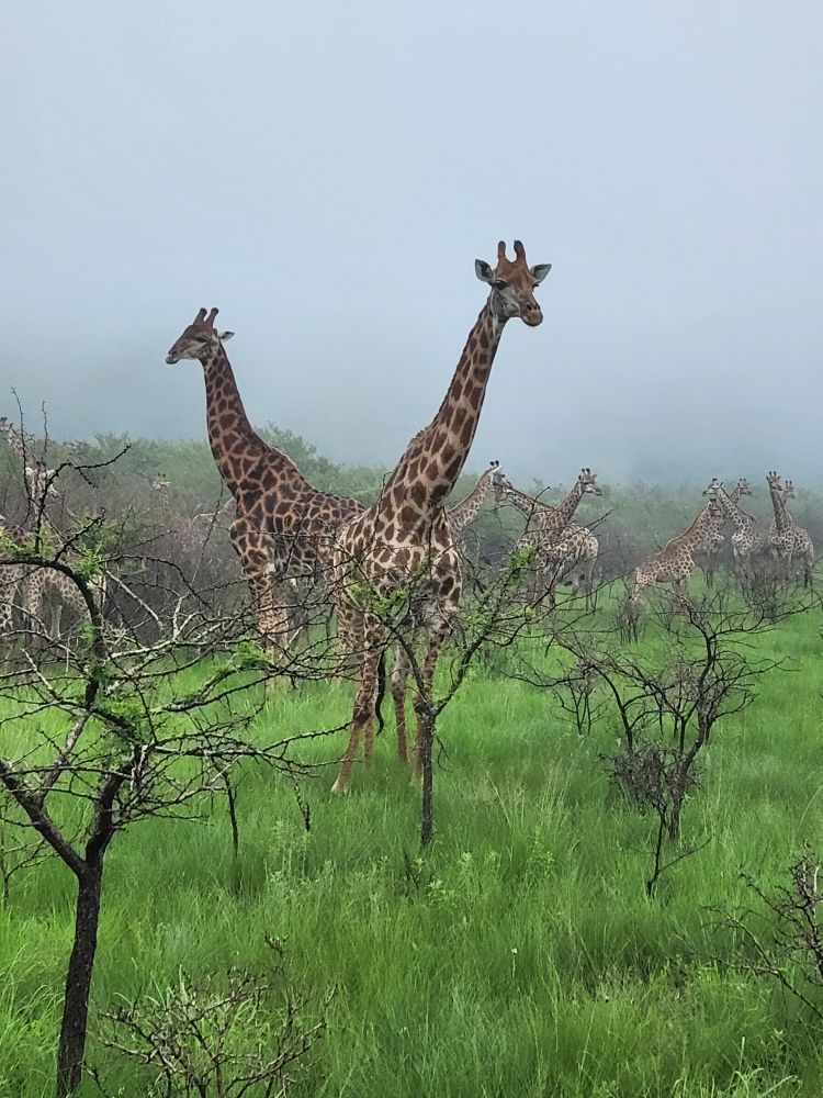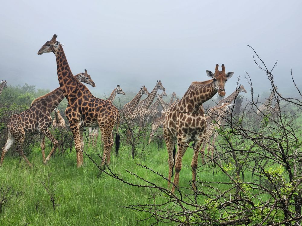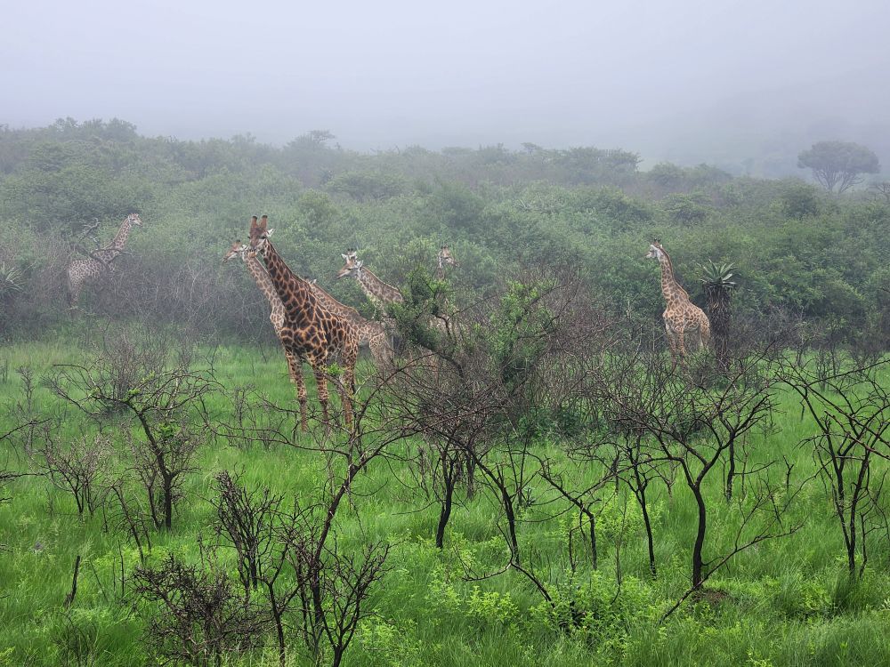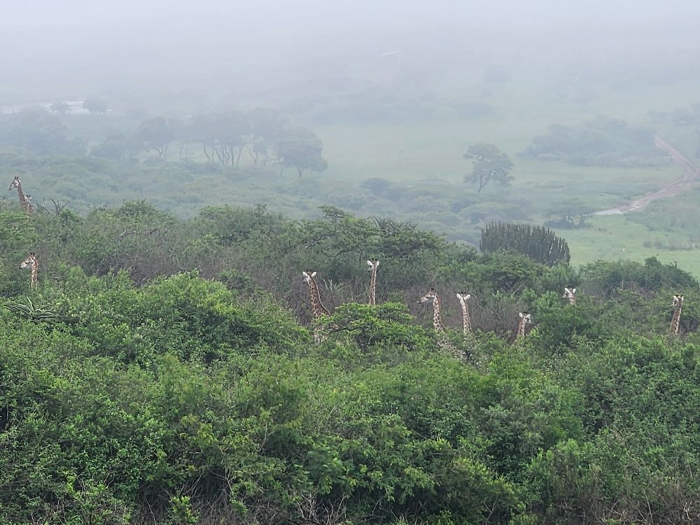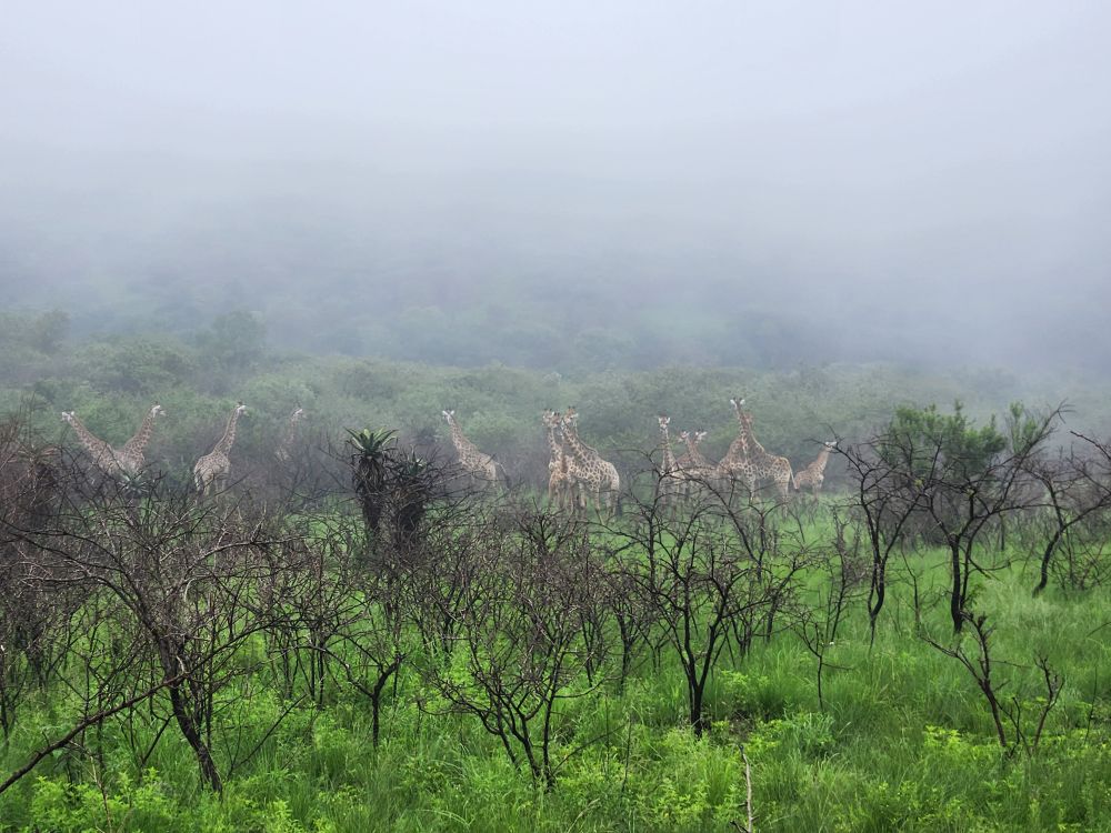 As we sit here watching, the fog and mist starts rolling in, providing a sort of mystical feel. We end up staying here for a long time, just watching as, it turns out, another guide is out there in the field trying to move the herd toward us. They do a lot of milling around. We watch as the matriarch, the pale white giraffe moves through the bush to browse on the shrubs. Then the males come out, they are the darker brown giraffes, one of which is following another female. Hmmm…must be mating season….no giraffe porn on this trip though!