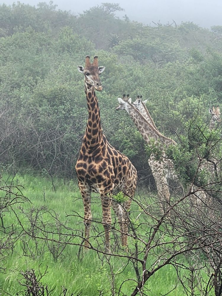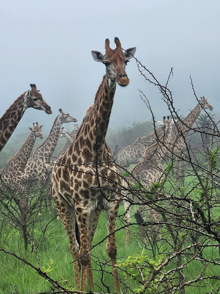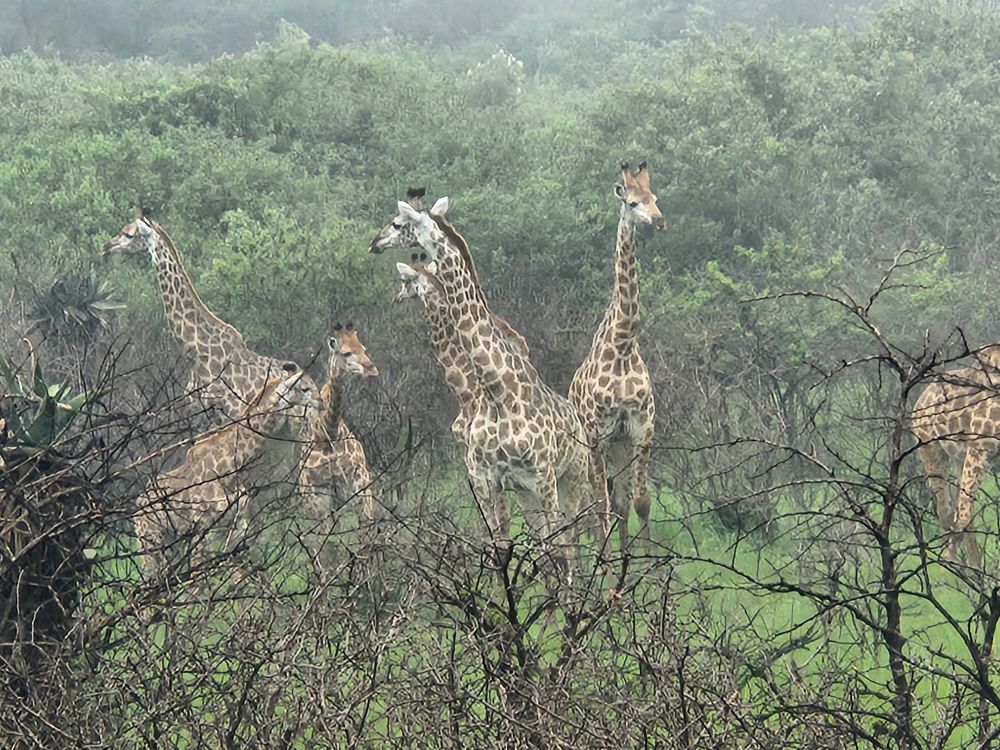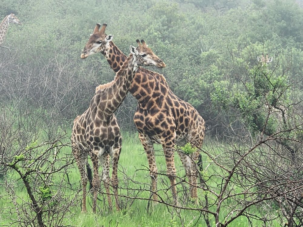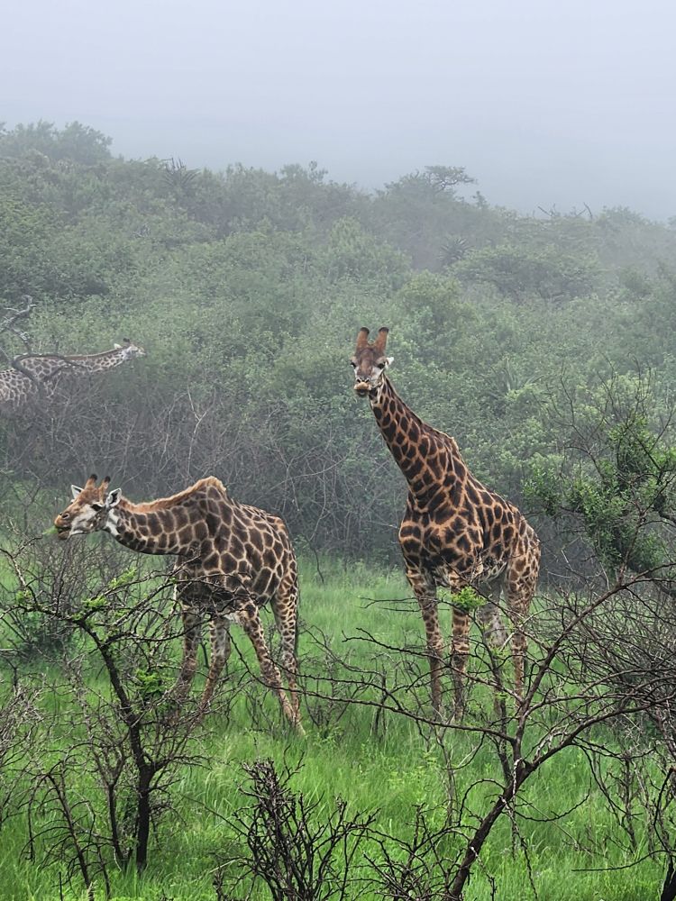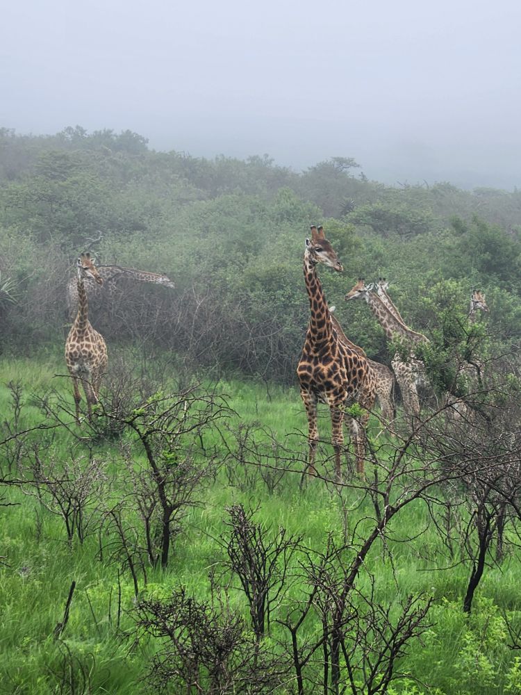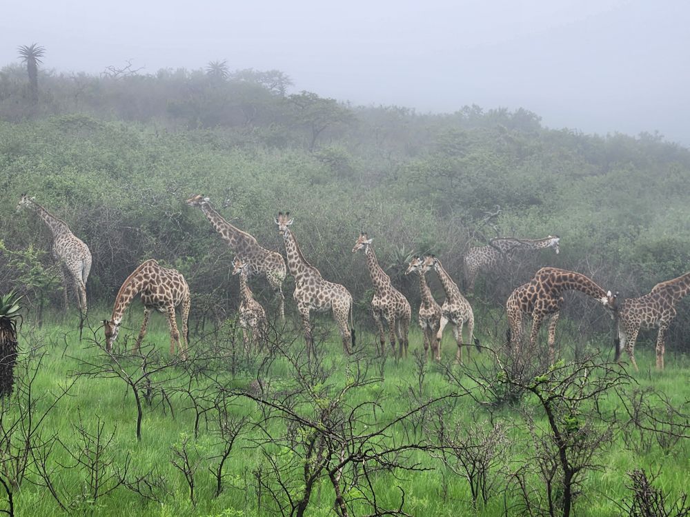 As we sit here watching, the fog and mist starts rolling in, providing a sort of mystical feel. We end up staying here for a long time, just watching as, it turns out, another guide is out there in the field trying to move the herd toward us. They do a lot of milling around. We watch as the matriarch, the pale white giraffe moves through the bush to browse on the shrubs. Then the males come out, they are the darker brown giraffes, one of which is following another female. Hmmm…must be mating season….no giraffe porn on this trip though!