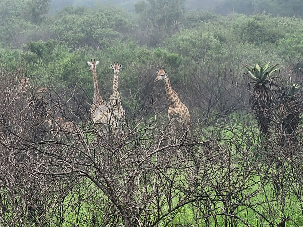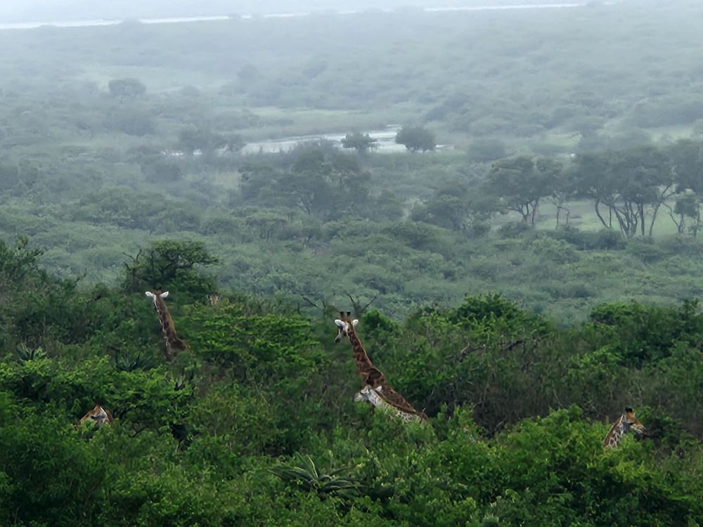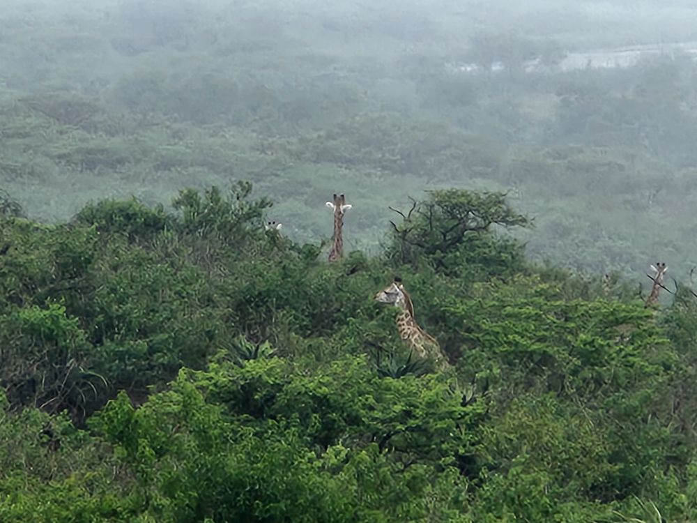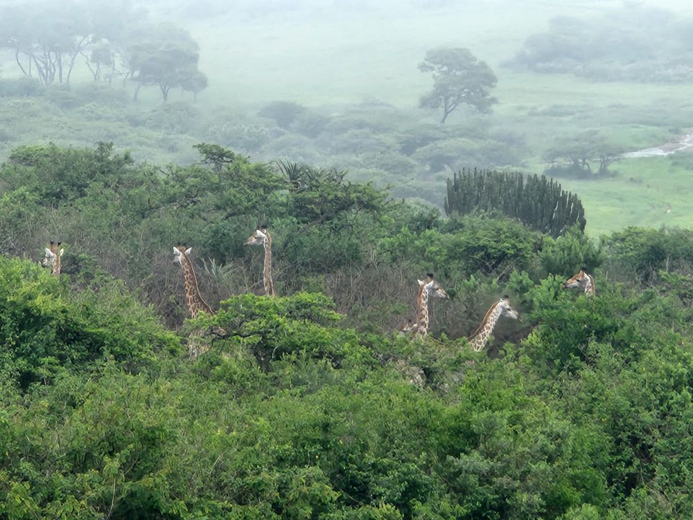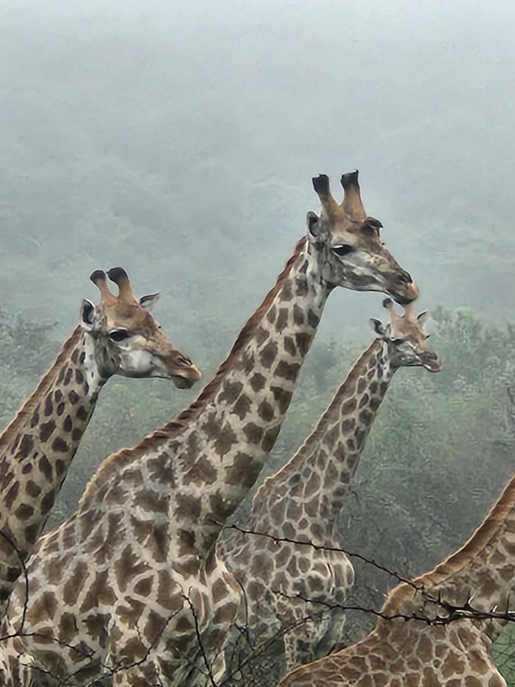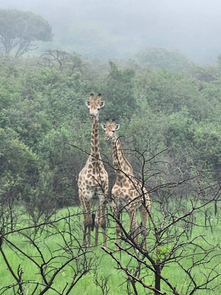 As we sit here watching, the fog and mist starts rolling in, providing a sort of mystical feel. We end up staying here for a long time, just watching as, it turns out, another guide is out there in the field trying to move the herd toward us. They do a lot of milling around. We watch as the matriarch, the pale white giraffe moves through the bush to browse on the shrubs. Then the males come out, they are the darker brown giraffes, one of which is following another female. Hmmm…must be mating season….no giraffe porn on this trip though!