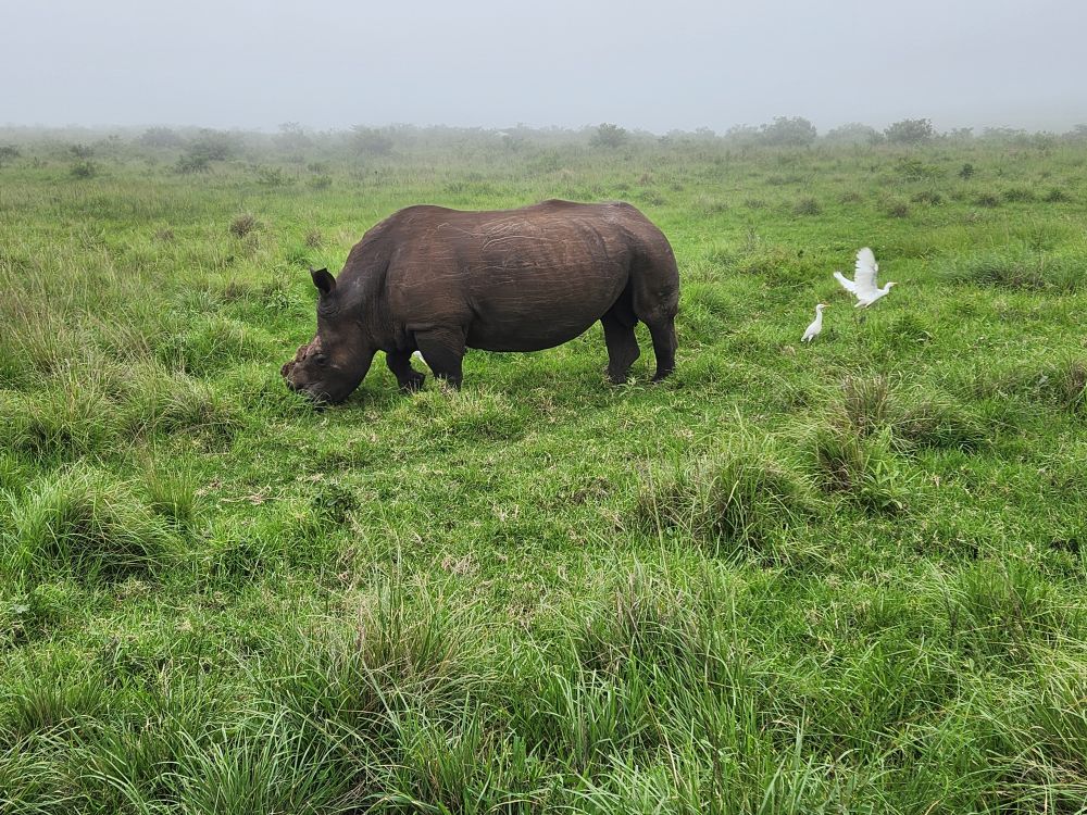 Onward we go, now, thankfully, heading back to the lodge (thankfully because it is down right frigid out here! We could have worn our puffy coats, let me tell you.) spotting a male ostrich, more Bontebok antelope, a crash of rhinos spread across the road – which the obligatory birds all around – and a zebra for good measure.