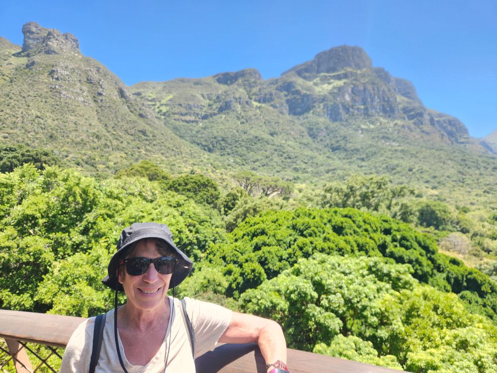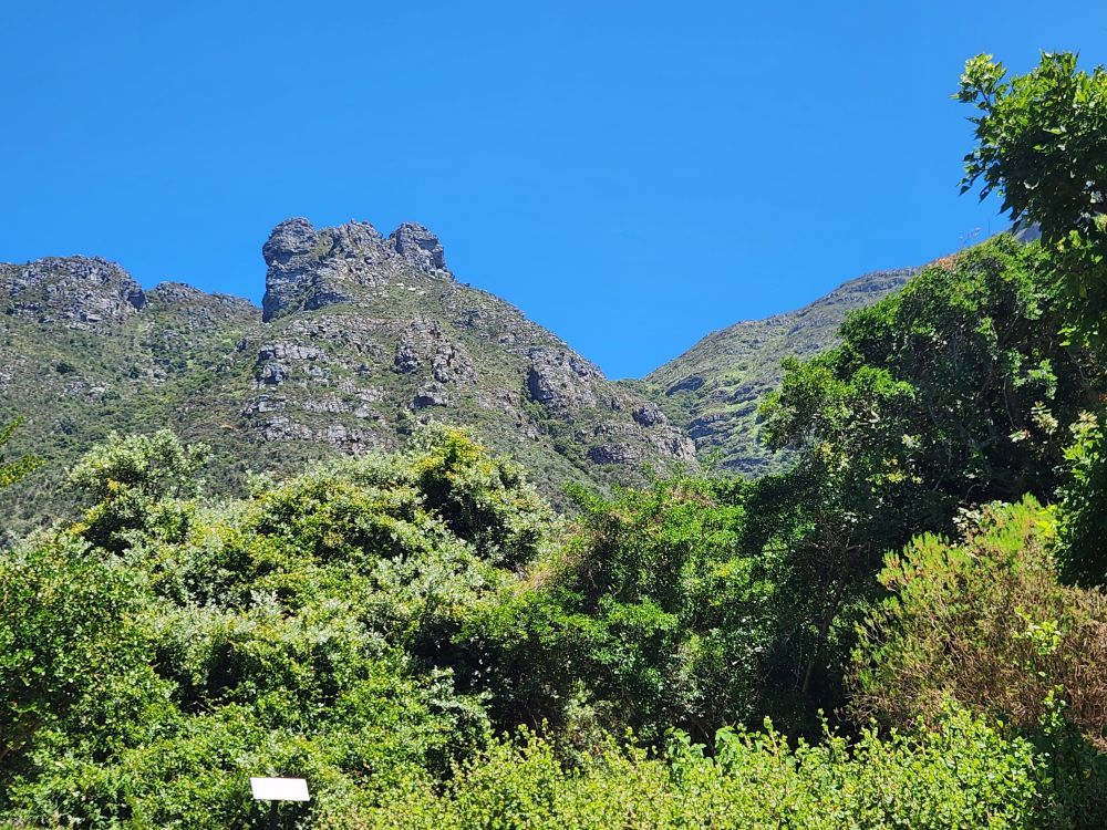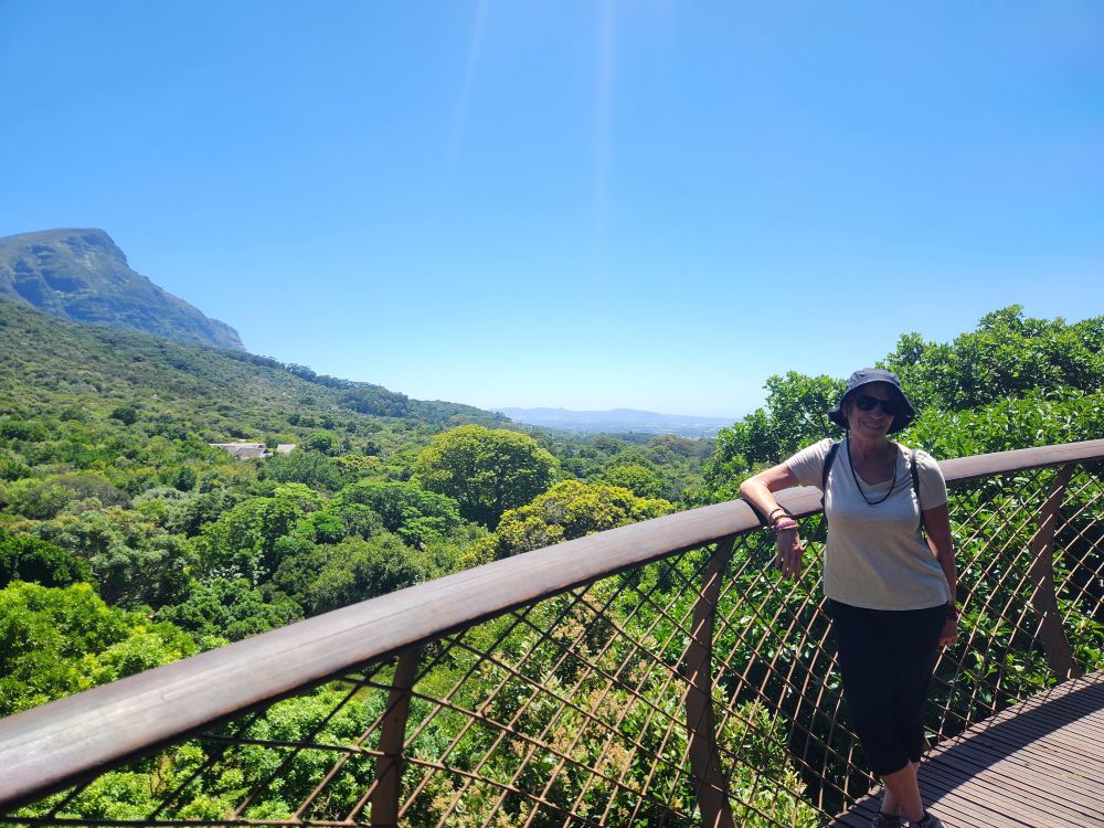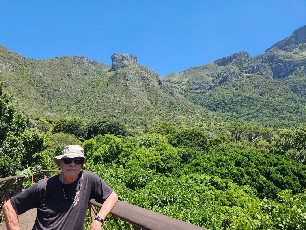 And walk it off we do. Up, up, up to the viewing deck on the far side of the gardens. We wanted exercise, we’re getting it! Along the way of course, we stop to snap pictures of the mountains and the gorgeous fynbos vegetation, found only in the Cape area of South Africa (8,000 different varieties, many only found here). The flowers are fabulous, as are the trees in the forested area which we walk through – fortunately all down hill now – on our way to the bus and our return trip to Sea Point.
