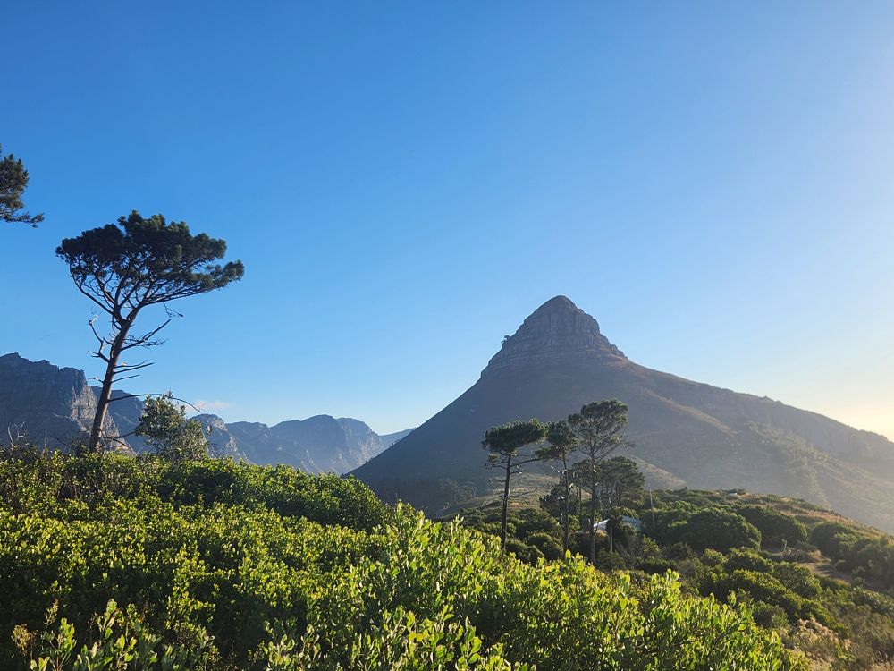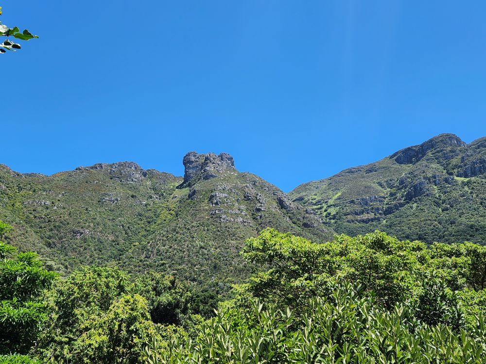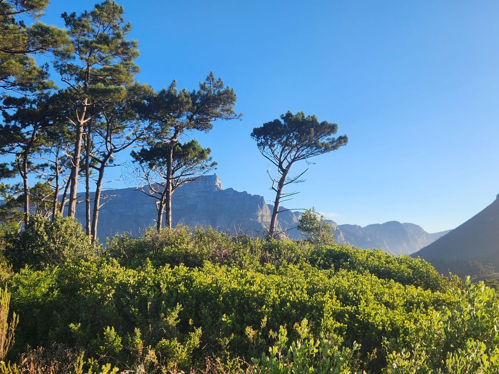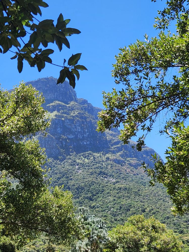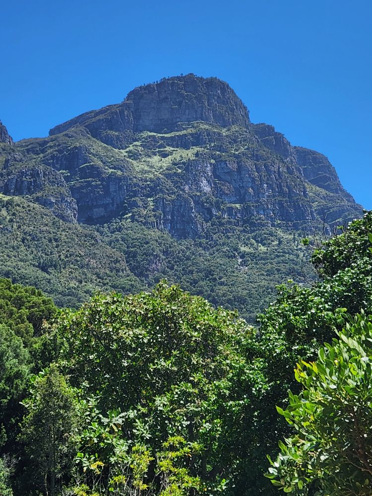 And walk it off we do. Up, up, up to the viewing deck on the far side of the gardens. We wanted exercise, we’re getting it! Along the way of course, we stop to snap pictures of the mountains and the gorgeous fynbos vegetation, found only in the Cape area of South Africa (8,000 different varieties, many only found here). The flowers are fabulous, as are the trees in the forested area which we walk through – fortunately all down hill now – on our way to the bus and our return trip to Sea Point.