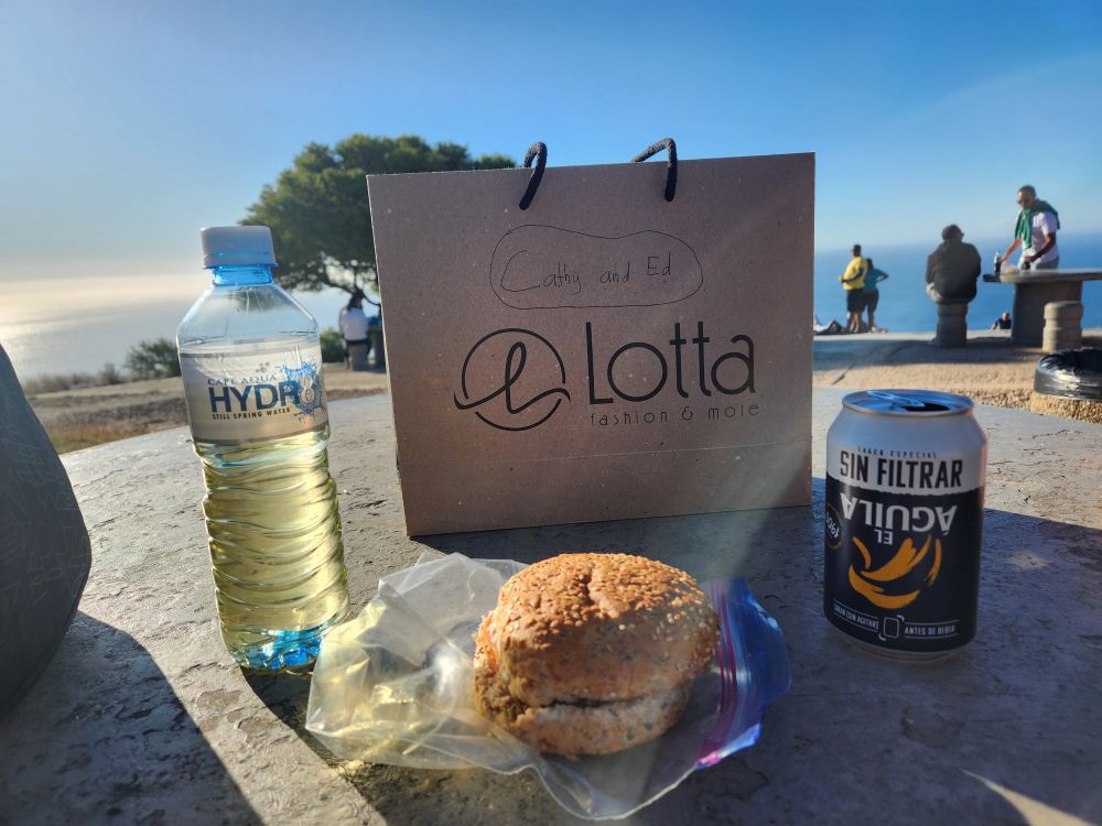 On the way up the mountain, we actually get a picture of Pursuit sailing out of the harbor, sigh. But being first also means we score a table for our picnic dinner. Perfect. Beer, wine, ham sandwiches and a repurposed gift bag from Domat/Ems. What more could you want?
