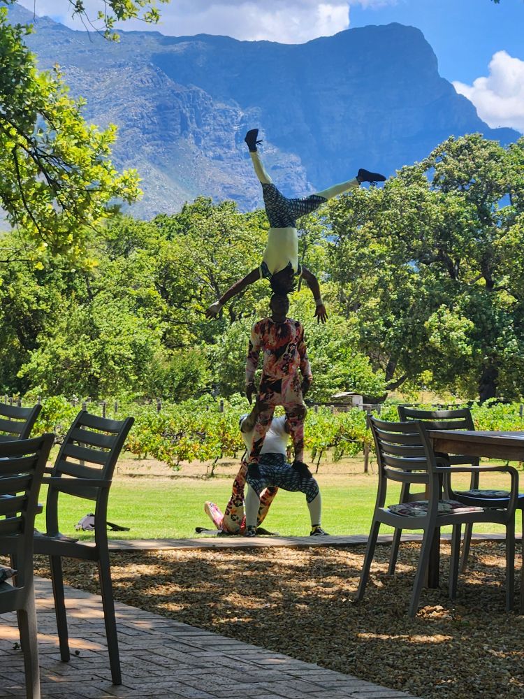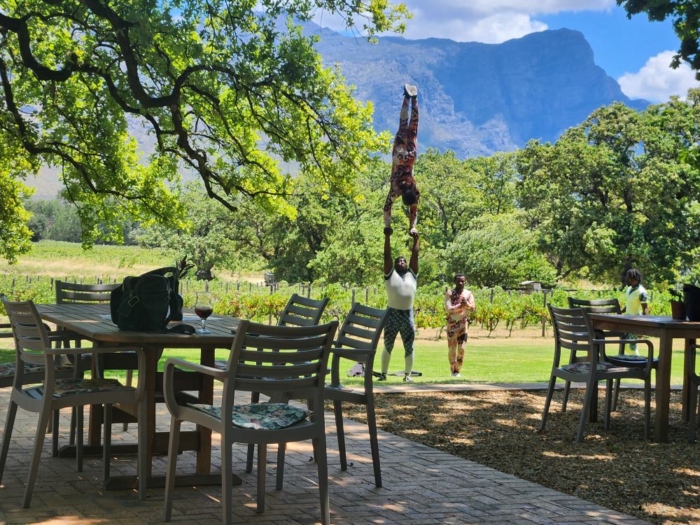 Back on the bus, we head to Franschhoek for our lunch stop, arriving in time for their Saturday market – which is cram packed with crafts and food and a singer that reminds us suspiciously of the horrible guy in the Destination Celebration on Pursuit. It might not be him, but he sure sounds close. Ugh.