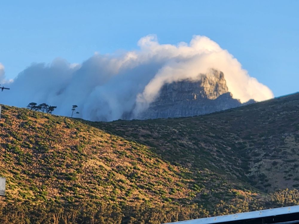 Our dinner, as planned, is our picnic on the pool deck with our ham sandwich leftovers, the biltong and cheese bought at Fairview. Totally perfect and fun and simple. And to top it all off, we get to watch the clouds envelope Table Mountain, like a waterfall of clouds, or icing, coating the mountain top. Completely fun.