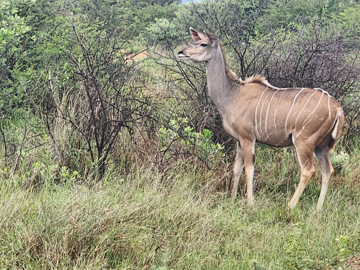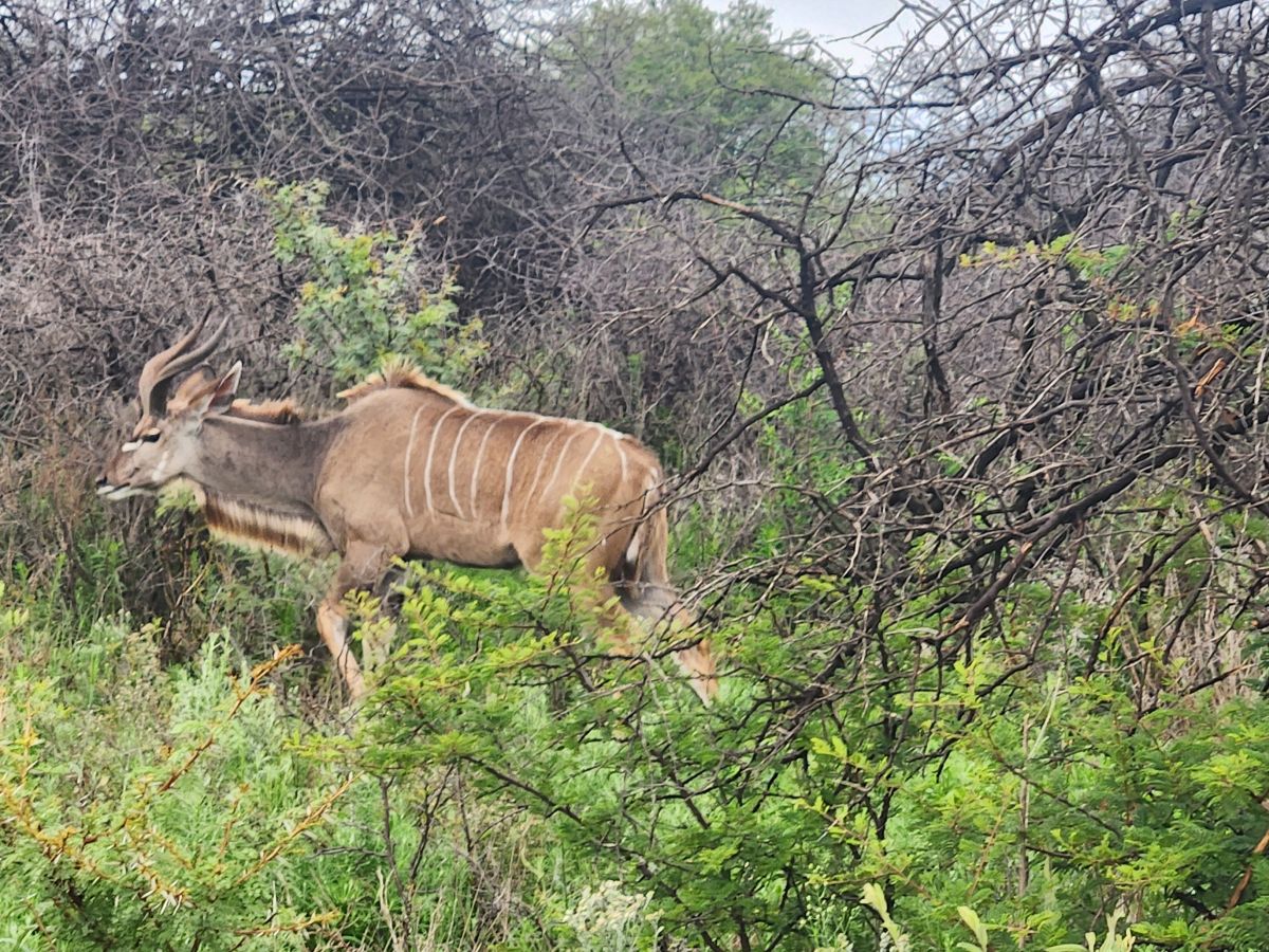 After coffee, we drive around, flushing out a dazzle of zebra, then head to another part of the reserve, ostensibly trying to find a caracal that has been seen in the area. We can see something way back in the weeds, but we can’t see anything clearly. Just a beige shape walking back and forth out there. Oh well, it was worth going to investigate.