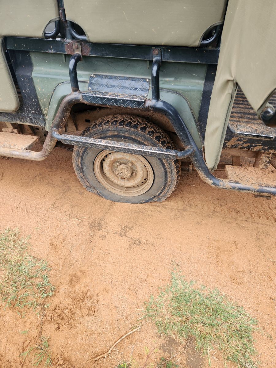 Until we leave that is, and guess what? We’ve got a flat! No way. I knew I’d cause problems by opening the umbrella in the room to let it dry. Sigh. And of course, we have no jack. Excitement in the bush! What to do? Nothing, just hang out until we are rescued by the other ranger (the one I call Draco because he has that sly, snide sort of smile like Draco and was giving Kieran a hard time the other day). Draco aside, he’s quite funny and drives like a banshee, getting us back to the lodge in plenty of time to get our bags packed and outside the door at 10am.