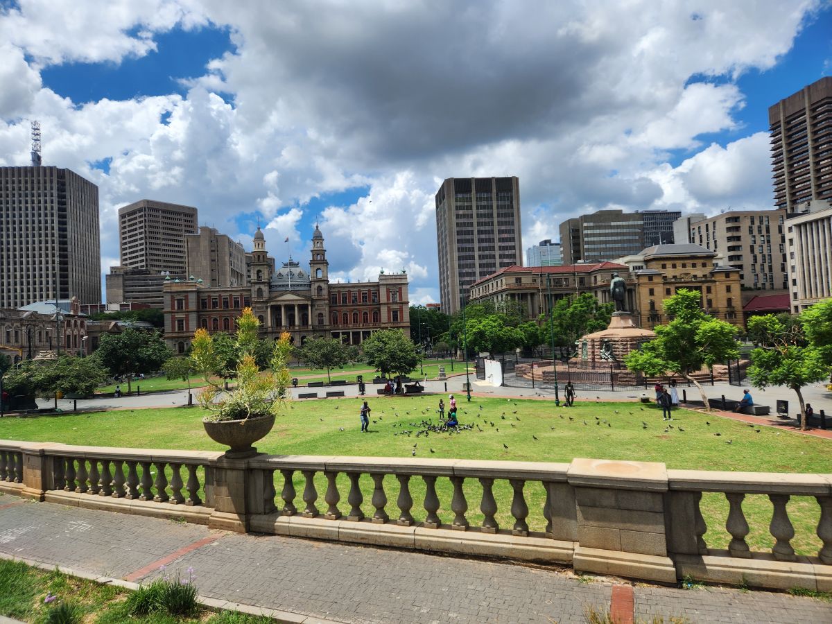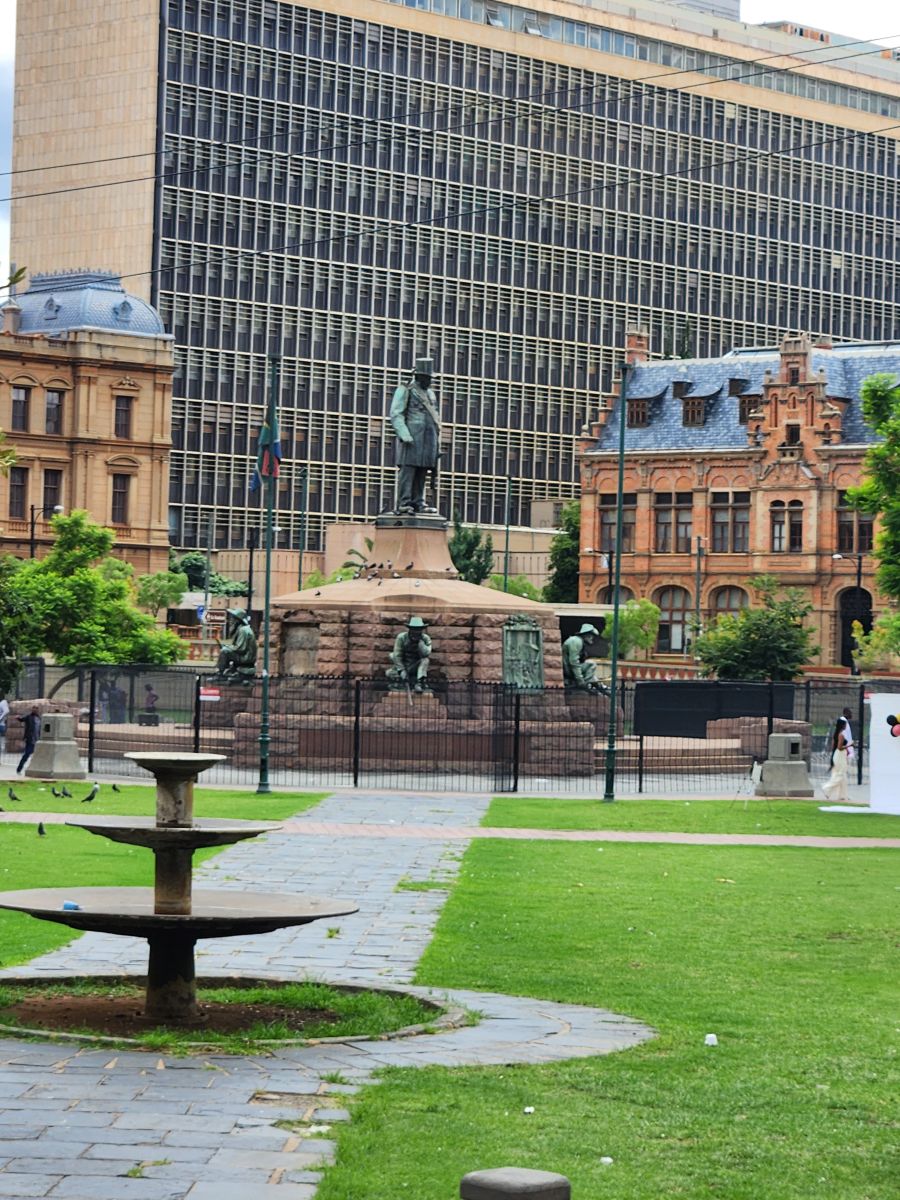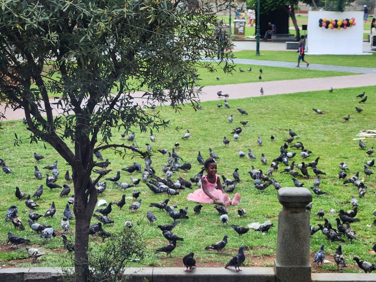 Next we drive through town, looking at the historic buildings. Around a circle where there is a statue of Paul Kruger surrounded by government buildings. And the cutest little girl sitting in the midst of all these pigeons on the lawn. The joy on her face.