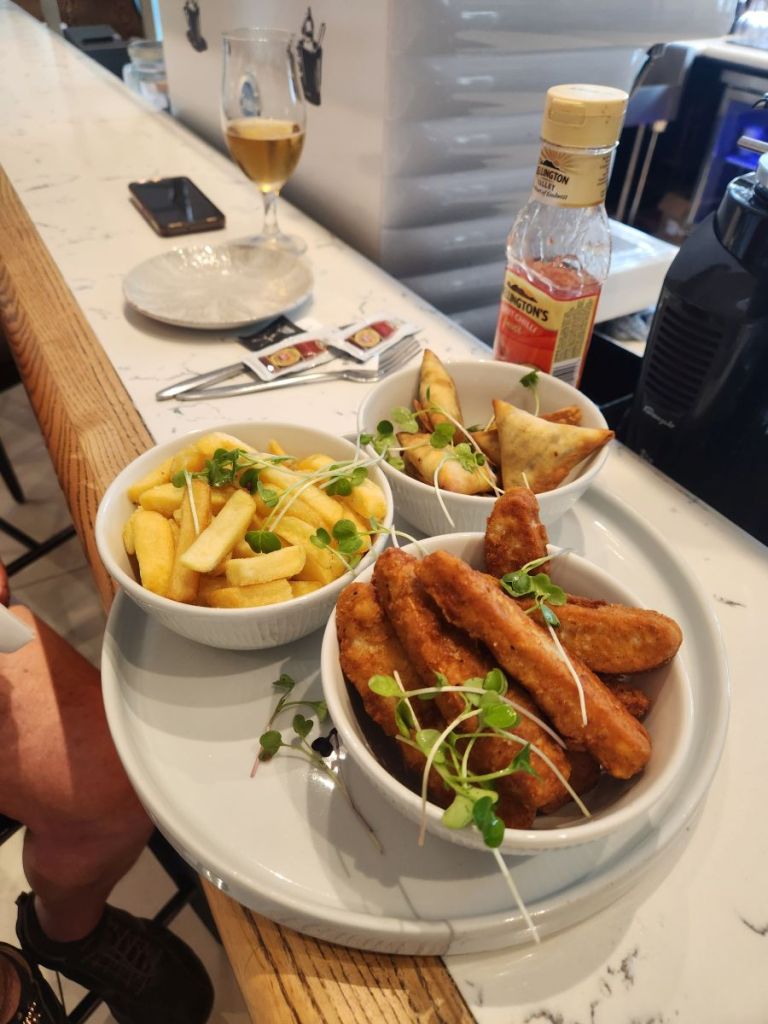 Which is exactly what we do, after we hit the bar for a little more sustenance in the way of some chips, samosas and chicken strips. And beer and wine of course – one of which we take up to the room with us to finish as we hang out, catching up on emails and watching Kim’s Convenience! An excellent way to waste 4 or 5 hours until we need to be on the shuttle to the airport.