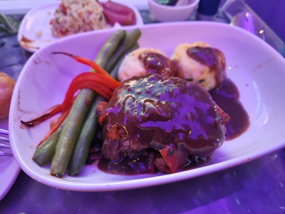 The amenities are great – plus the food! Restaurant quality, 100%. There were special South African options we could pre-order, which we did – Kingclip for Ed and Ostrich for me. Both were incredibly delicious, the only problem being that my ostrich had to cook for so long, by the time they brought it to me I could barely eat it – it was so late, and I was so tired. But that was my problem, not theirs – because that piece of ostrich was absolutely fantastically good. Both Ed and I only wish we could have finished it.