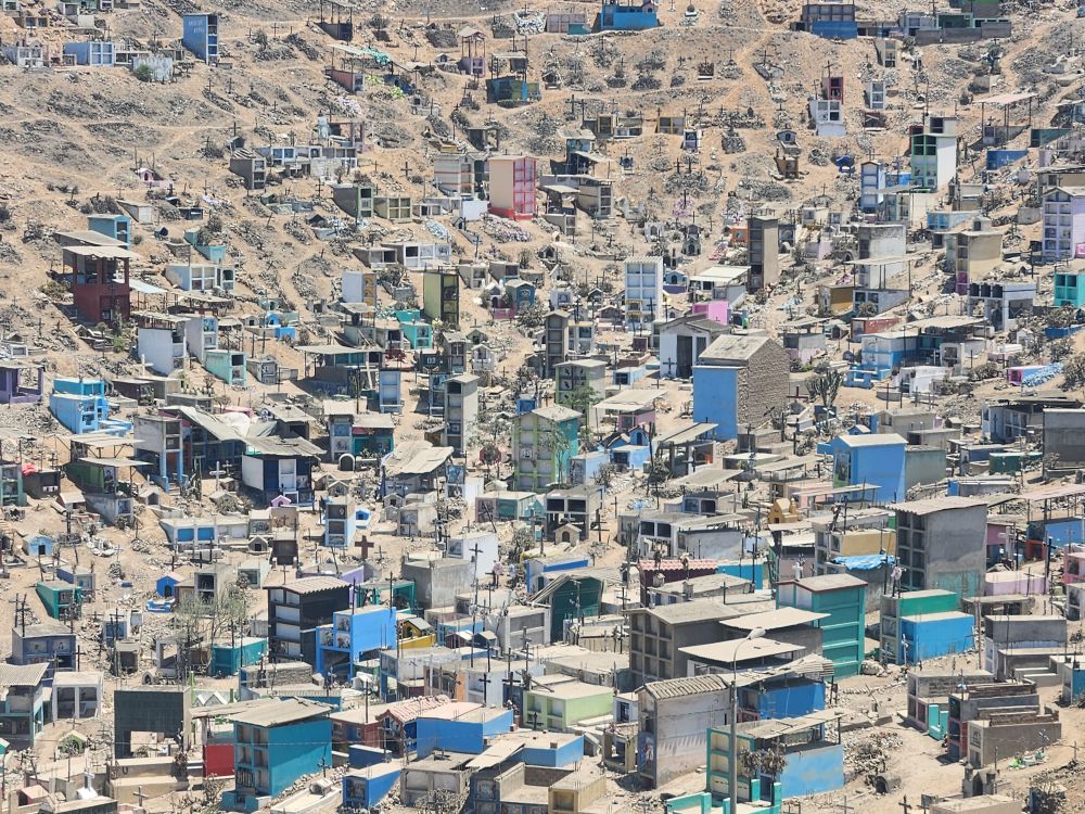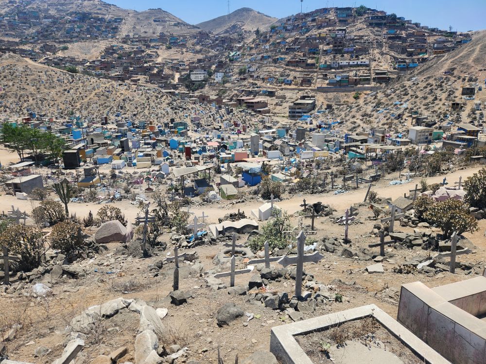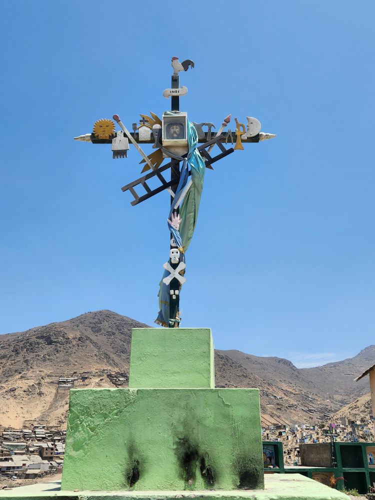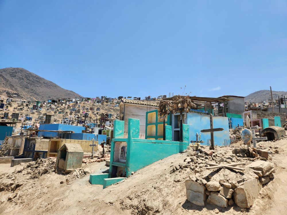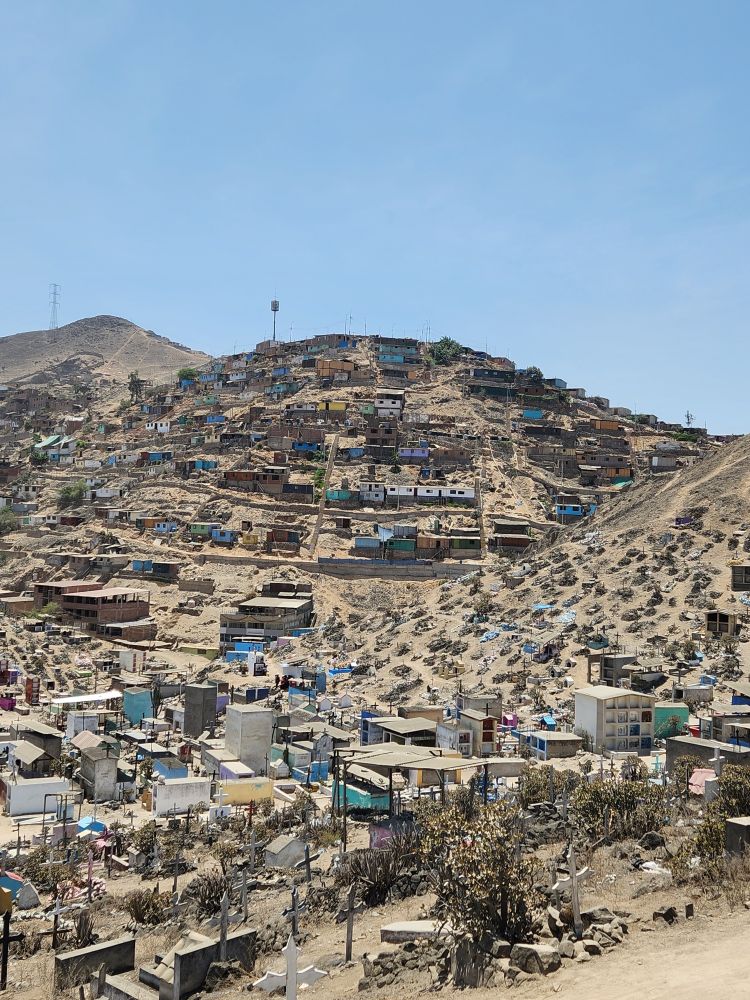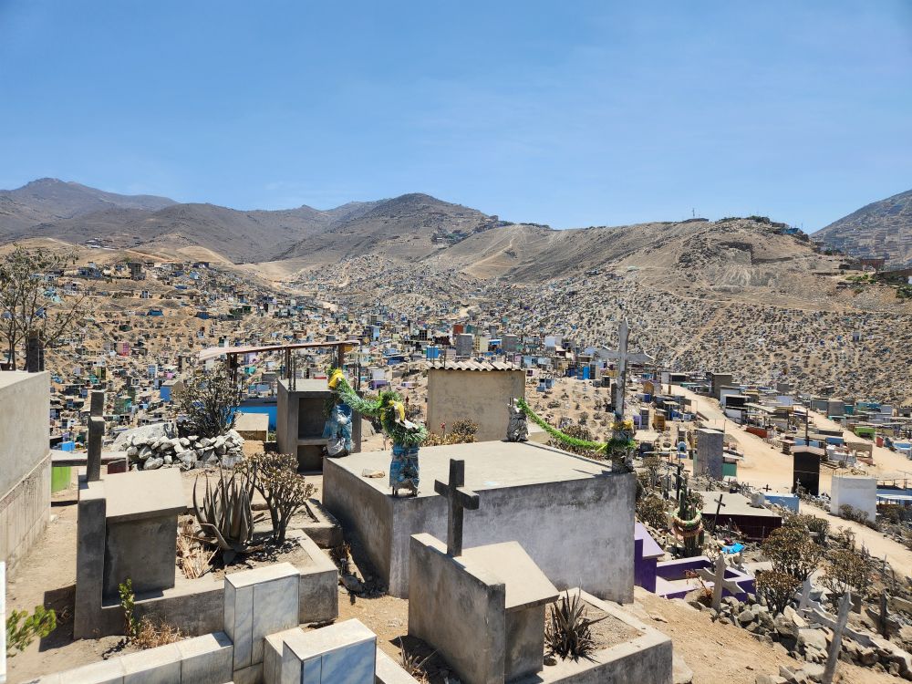 Arriving at Virgen de Lourdes, in the Villa Maria del Triunfo zone, the 2nd largest cemetery in world and the largest in Latin America, we drive through what could be mistaken as a small city! There are thousands of graves here – actually over 1 million! It is a relatively new cemetery, only begun in 1961 and used only for the immigrants from around the local area and close by provinces. It is absolutely huge – and it keeps growing into every unoccupied space. Up the hills, into the mountains, you can see little tombs and mausoleums far into the distance.