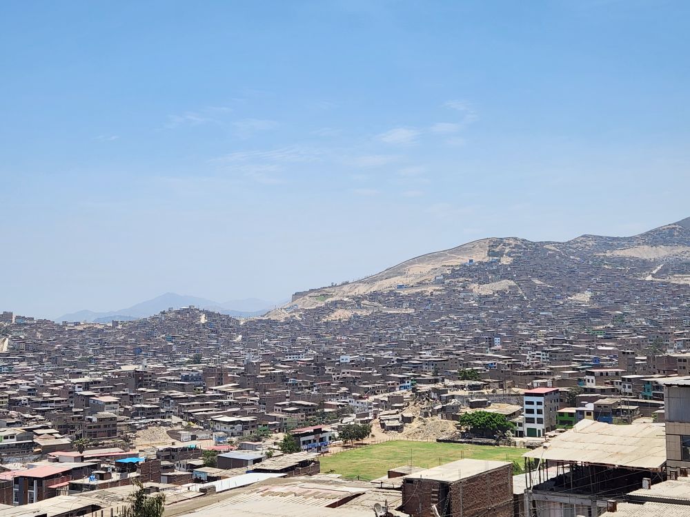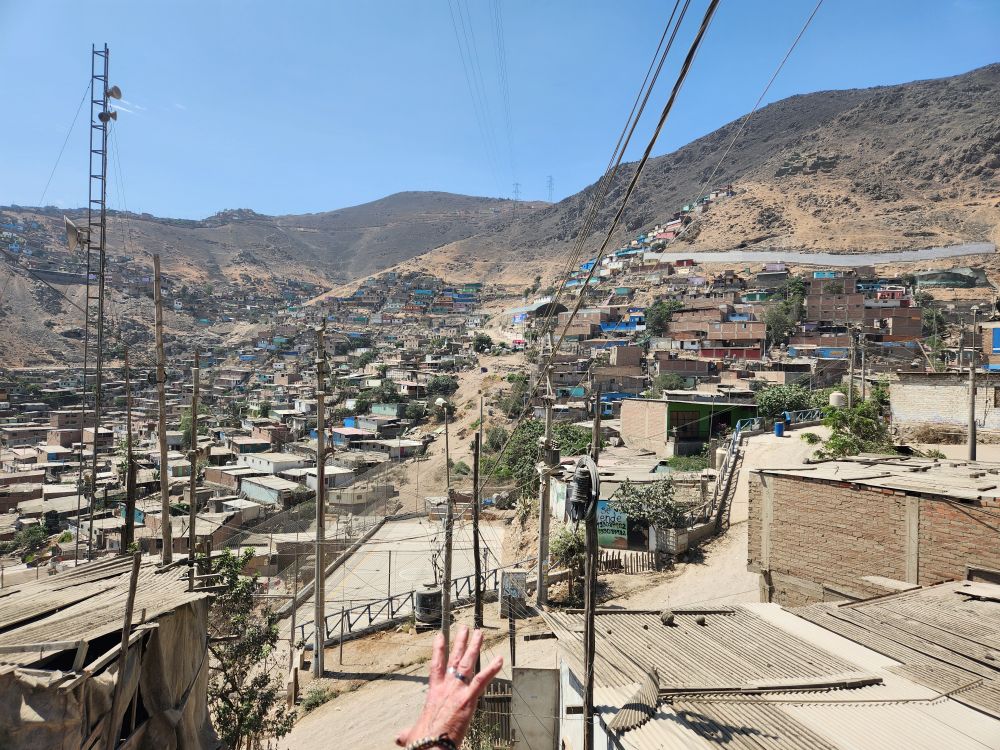 After the cemetery we head out to San Miguel de Miraflores where artisan community is located. The community is up on the side of a mountain, and the driver has to navigate these little narrow dirt roads that go straight up the hillside. Ay yi yi! Once up on a plateau of sorts, we get out of the car to gaze over the sprawl that is Lima. And this is only a portion of it! You can see forever in the clear sky – the houses and shanties stretch forever. On one hillside there is a huge wall that Alfredo tells us separates the richest parts of Lima from these neighborhoods.
