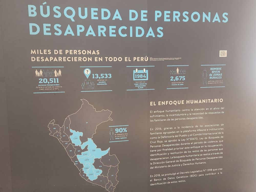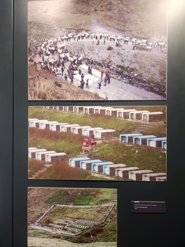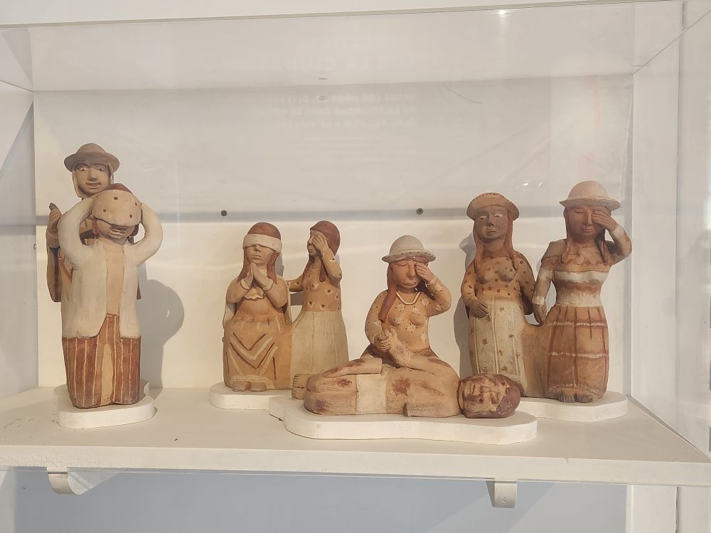 Alfredo had mentioned this museum as it has a lot of information regarding the Shining Path, it’s terrorism and the Ayacucho region, from where most of the people we visited yesterday immigrated. It is an extremely well done exhibit albeit filled with all the horrible things that happened during the uprising and the aftermath of it all. There are displays about the fires that were set in the middle of Lima, about all the missing persons that the Shining Path and the MRTA groups have abducted, killed, made disappear. There are examples of the typical handicraft the women made – like the ones that Sra. Balvina made – depicting the situation in their home towns. There were also these terra cotta figures that poignantly depict the torture endured by the people of the mountains. Brutal.