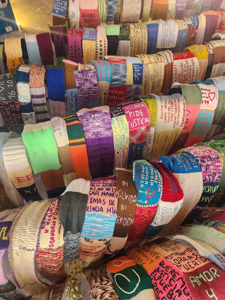 The final display is one of hundreds of knitted scarves hung from the ceiling, all with some saying about justice or name of a disappeared person. Amazing.