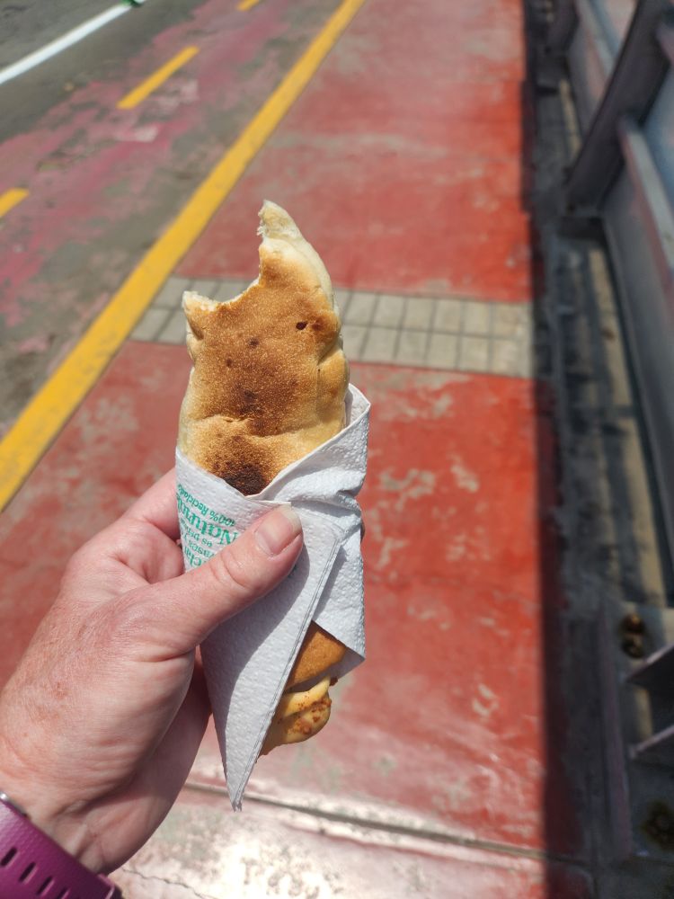 Outside in the bright sunshine, we take a few deep breaths and start our walk home. It isn’t as pleasant now – the sun is up and it is getting pretty warm, but at least there is a cool breeze coming off the water occasionally. The scenery is still beautiful and the gardens lovely with the heart-shaped flowerbeds. Even though we’ve had a light breakfast, we decide we want a little snack to tide us over before the food tour so we grab Pancito Relleno a la Lena (essentially little empanada like sandwiches – one with cheese and jamon, one with cheese and cabonossi – that sausage we found in S. Africa that we loved so much) and happily munch on them as we walk home. A perfect little snack.