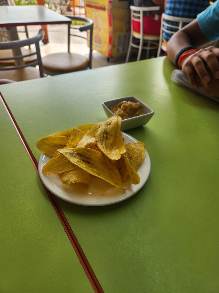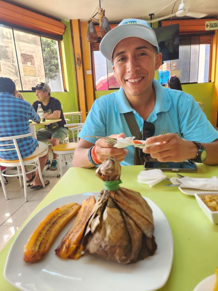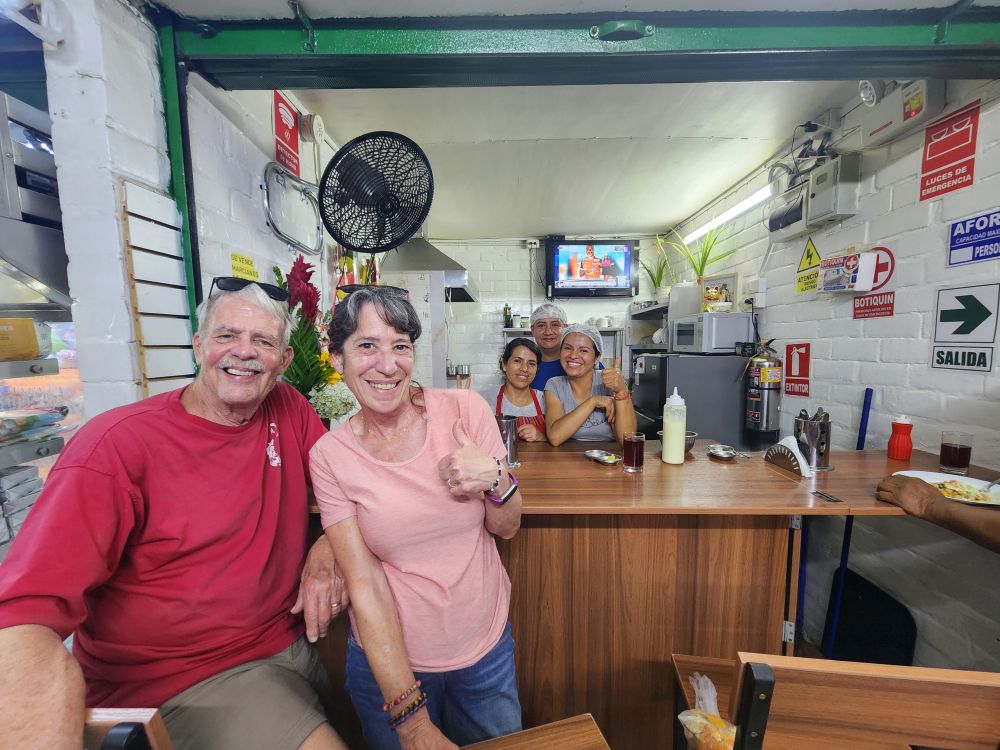 With fruit in hand, we wandered through the little market stalls until we reached a hole in the wall, literally, which Junior says has the best food. He is so pleased we actually know what “hole in the wall” means and embrace it wholeheartedly! The guy and gals working (owning?) here are a delight – his name is Walter, can’t remember the ladies’ names, but they introduced themselves. Junior has a running conversation with them, translating all along, and it is just a wonderful experience to hear them chat and to watch them prepare this great meal of fried Bonita (tuna) atop Alsega (garbanzo beans and rice. This meal is a combination Andes and the Coast – the fist, obviously the coast, and the beans from the Andes.