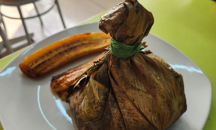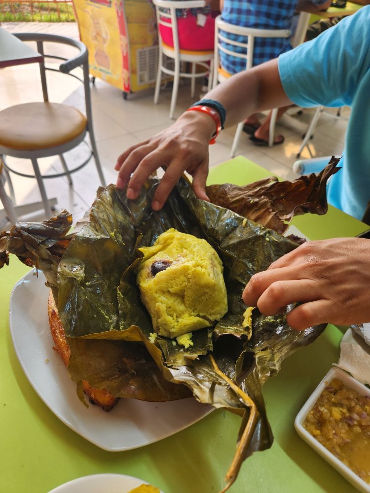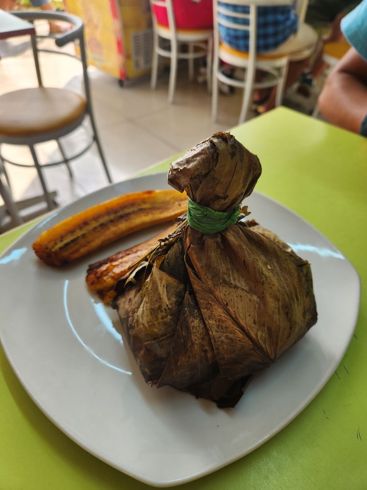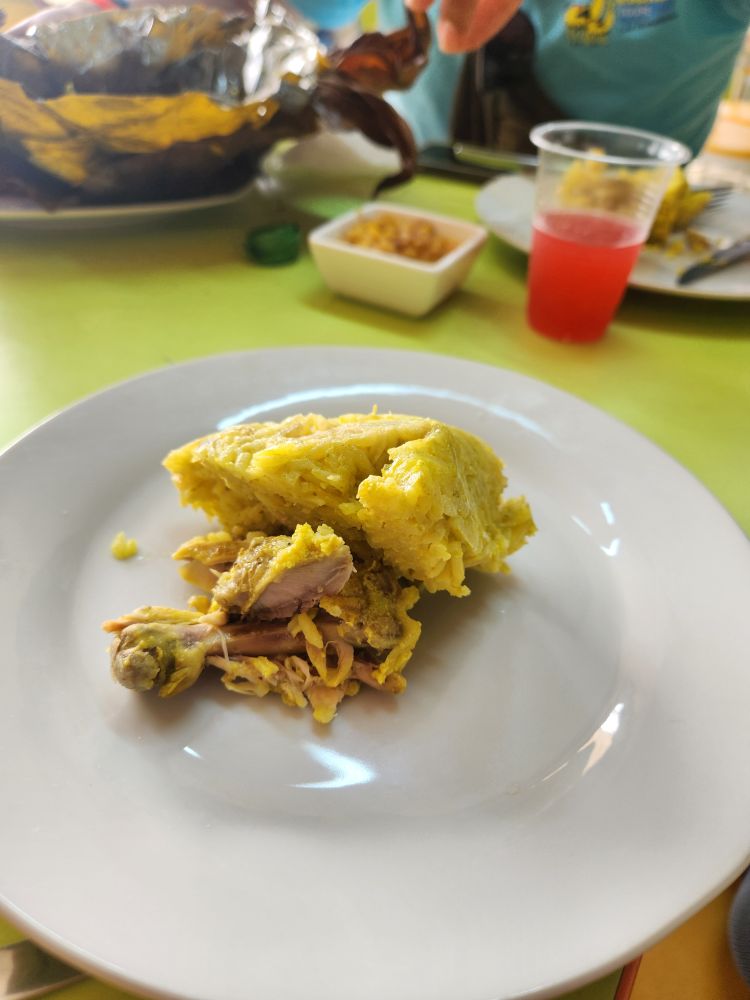 Finished with our Chanfainita, we hit the roads again, heading to Las Brisas del Ucayali de Vicky, an Amazonian restaurant outside a marketplace. Here we dig into a typical Amazonian food – Juane (pronounced Faunie in the rainforest), which is rice mixed with some sort of meat (in our case chicken) wrapped in banana leaf then steamed. The banana leaf forms a little carrying case, so to speak, for the food, and as Junior explains, the hunters carry it around with them for days and it doesn’t go bad when it is kept wrapped up. Junior also explains that the ribbon (a new word we teach him) tied around the top can signify what is in the banana leaf package, so everyone gets the rice/meat/package that they want! Along with our Juane, we also have excellent fried plantains – oh I love those things! – and Camu Camu juice