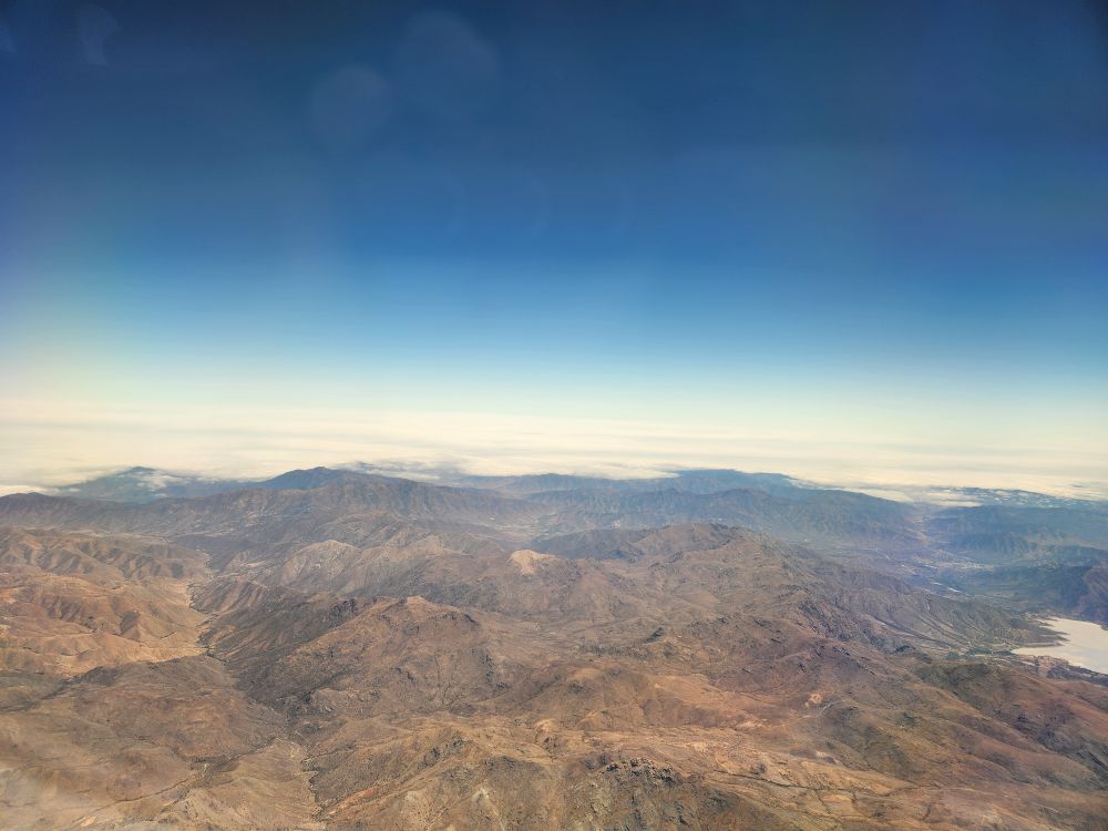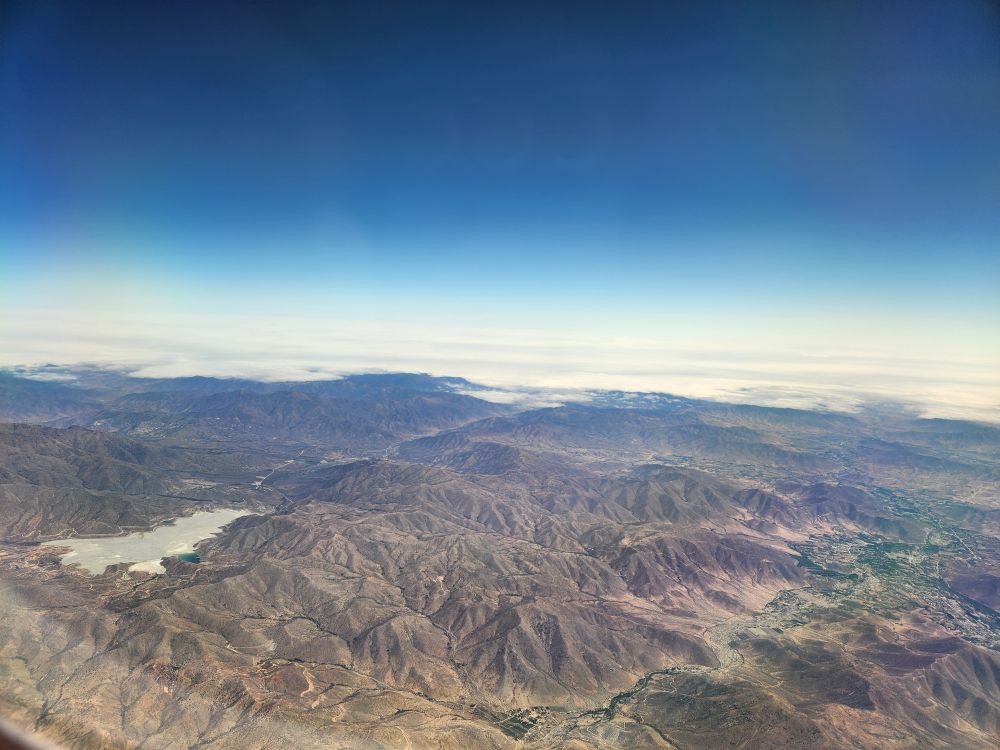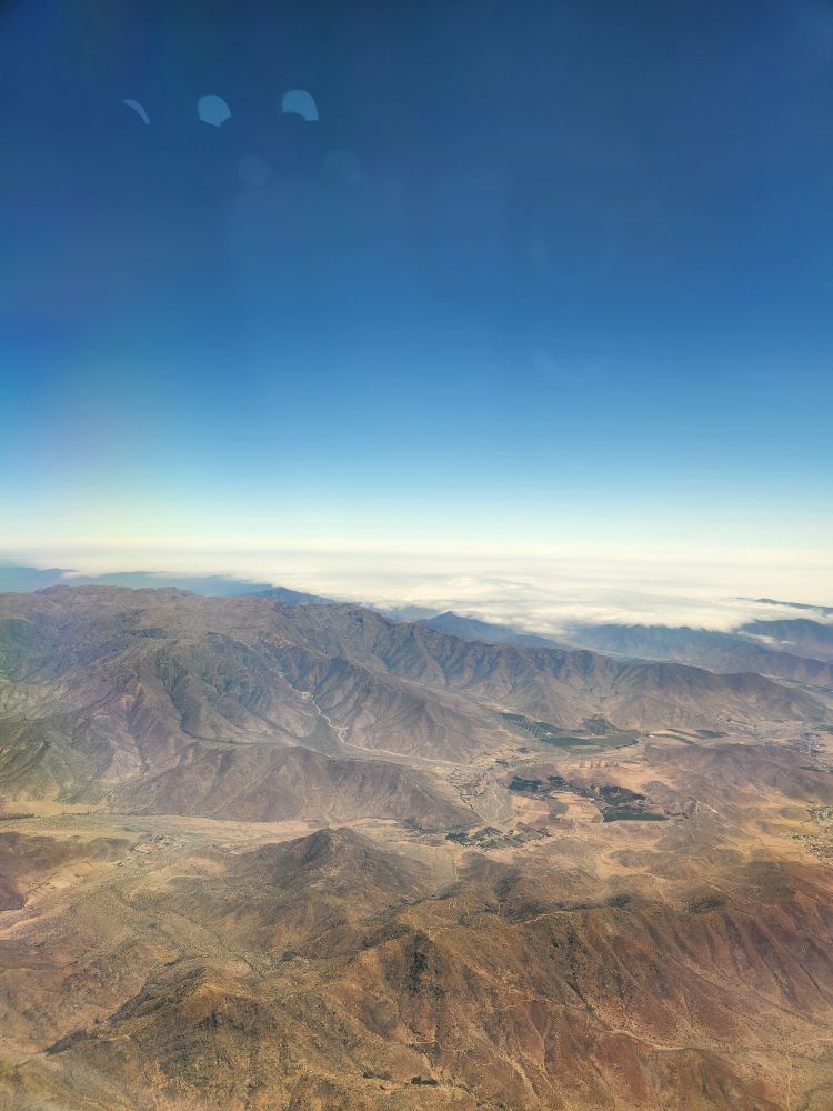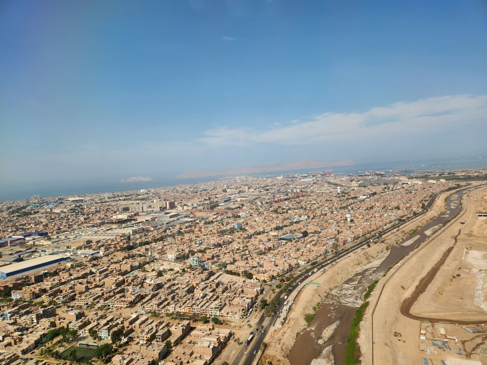 At the gate, we were first on the plane with excellent comfy seats and all the amenities. A very good breakfast menu, and then fabulous views over the sprawl that is Lima as we take off to fly our way to Santiago.