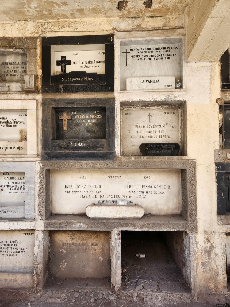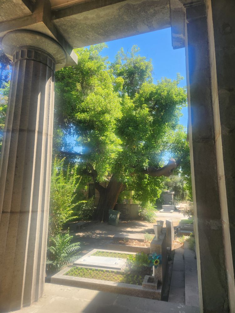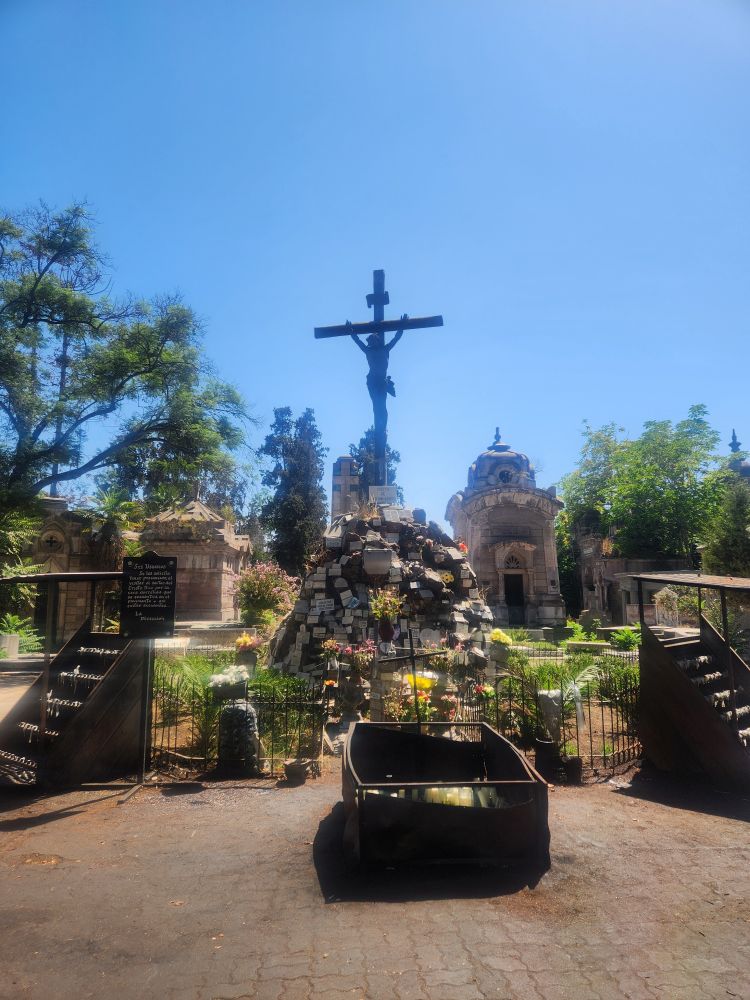 After the market, we took the metro (and re-energized our old Bip! Card that we had been using for a European electric switch card for years! It actually still had 150 pesos on it!!! But they were so old, they were no good, so we put another 3000 on it and off we went!) and headed off to the cemetery. We’ve been here before, but on our own. With Juana, it is a totally different experience! We learned so much. In Chilean culture, they believe the soul stays with people on earth. Everyone believes in ghosts and spirits, even if they are Catholic. The people from the south are more evangelist – more spiritual and believe they can be possessed. Those tilted crosses you see on gravestones? That means the person is Protestant.