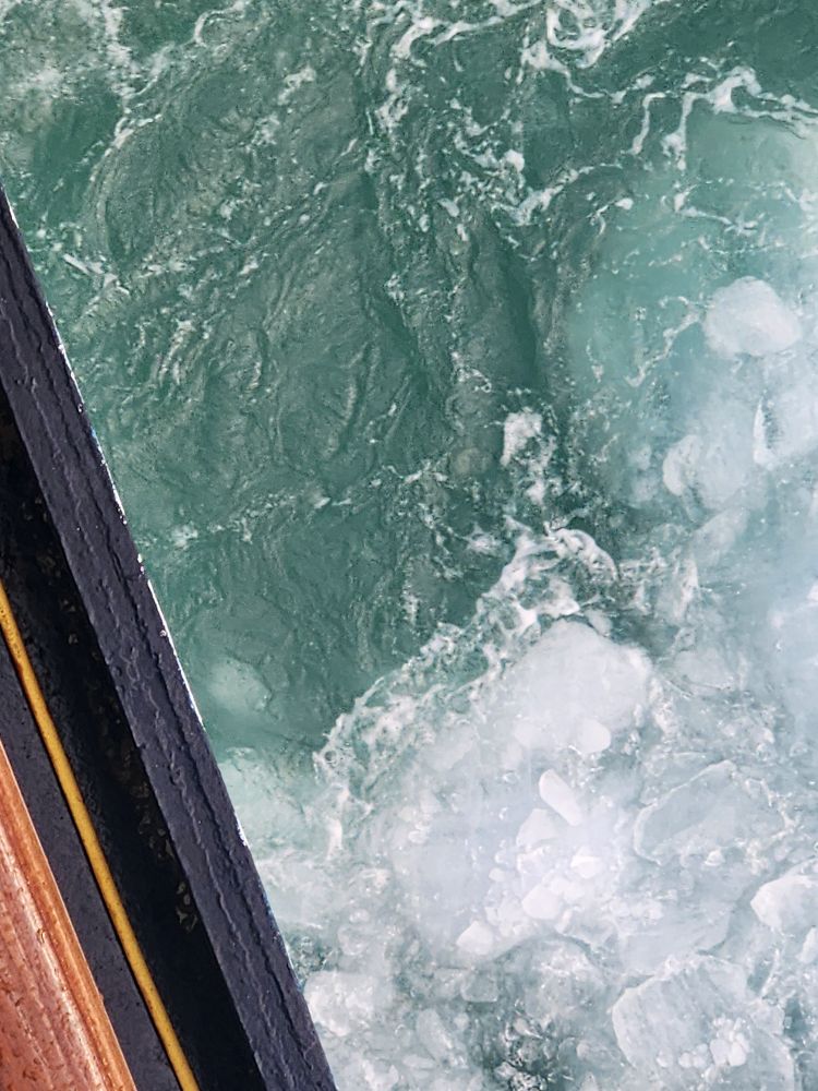The views continue as we slowly leave the glacier behind, from the deep green water swirling with floating ice alongside the ship to the amazing final view as the glacier as it slowly fades into the distance.