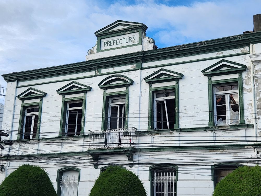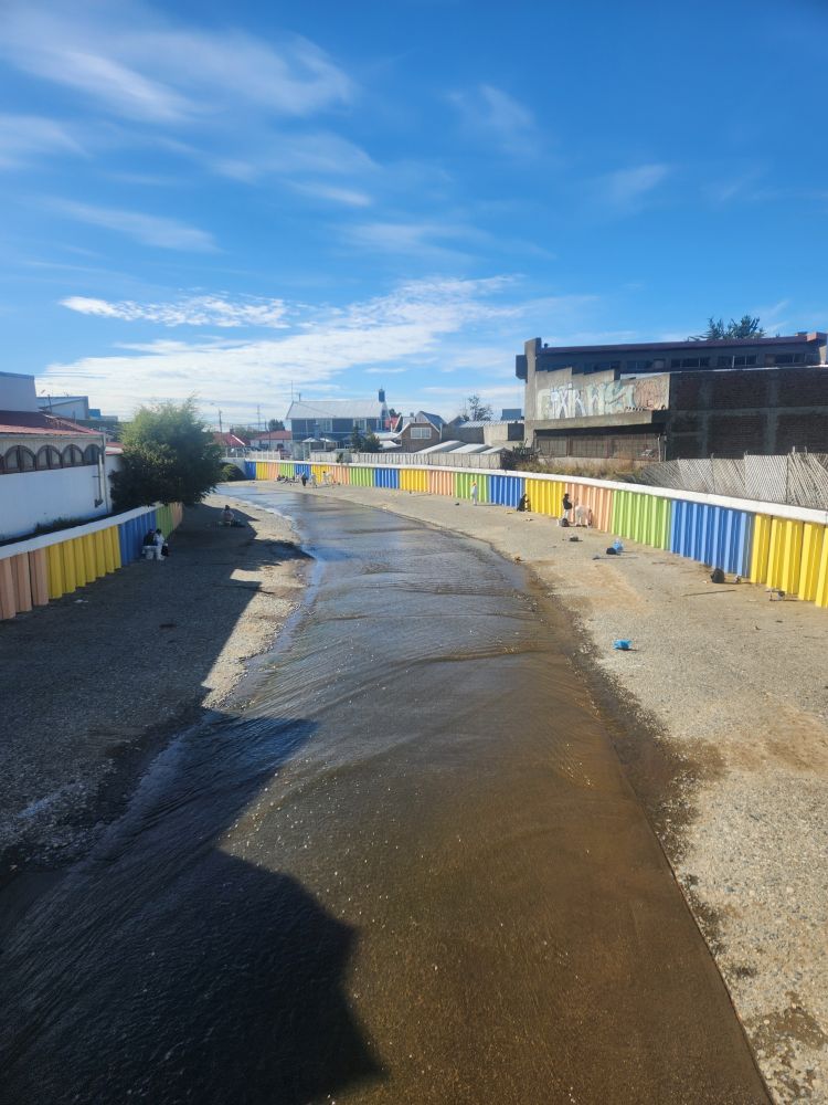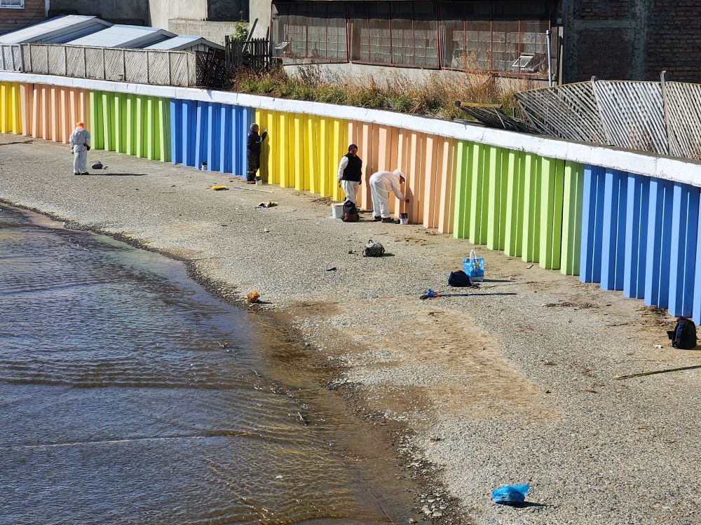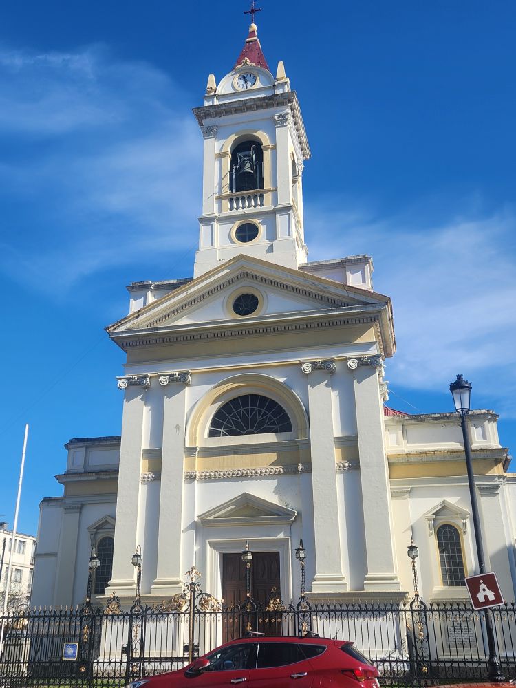 Trekking back into town (oh yeah, this will be a good walking day!!!), we pass the Santuario Maria Auxiliadora catholic church, with the Museo Maggiorino Borgatello right next door. We had thought about going into the museum; everything said it was closed today but the doors are open and busloads of ship people are there – the busloads of ship people sort of made our decision and we kept on going into the center of town passing over the Rio de las Minas, where workers were industriously painting the concrete barrier walls in different pastel colors.