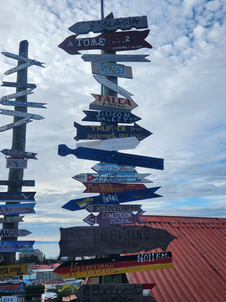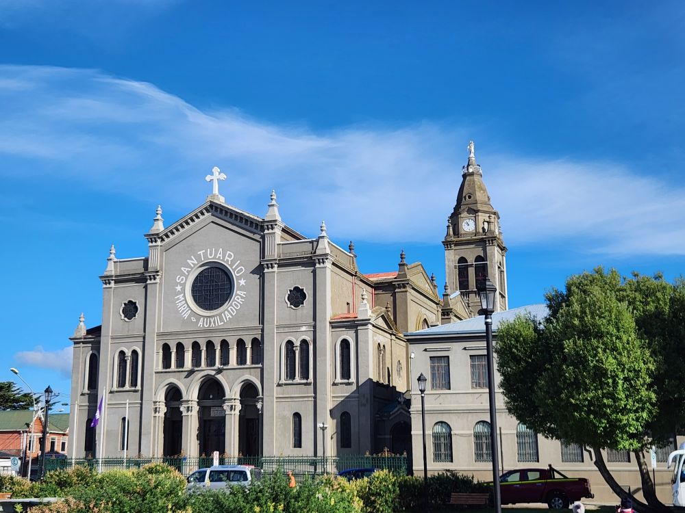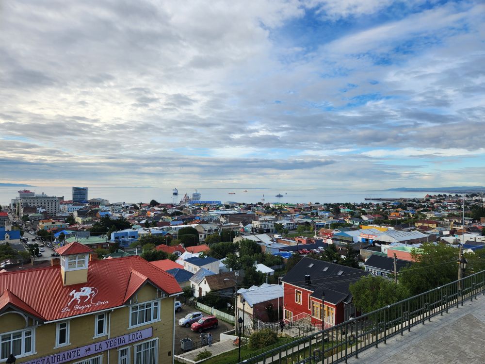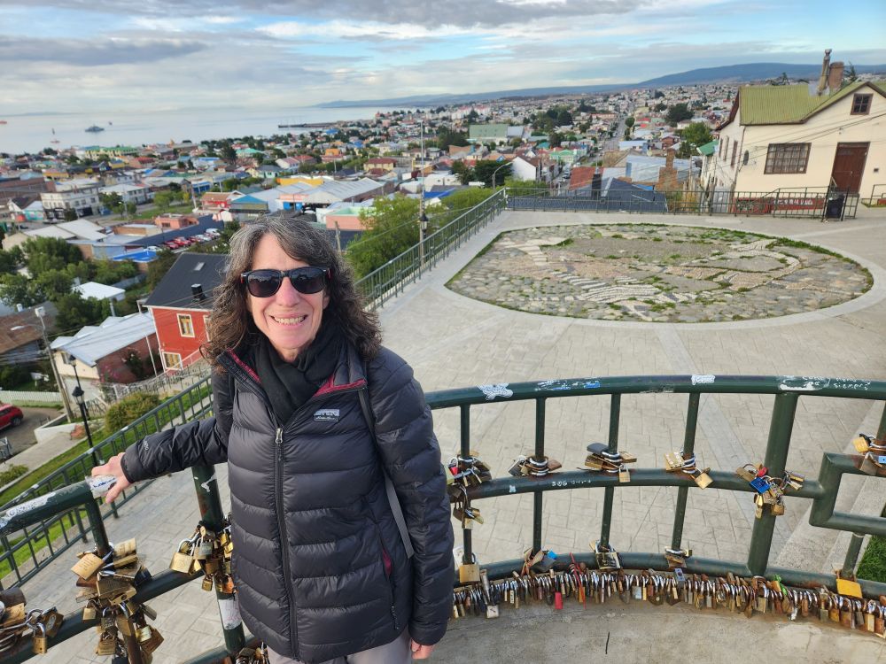 Punta Arenas was created as a Garrison to protect the peninsula. The town became very prosperous as a stop on the shipping routes in the 1800s and early 1900s, but when the Panama Canal was opened the town’s fortunes began to dry up. A businesswoman, Sara Braun, who immigrated from Latvia in the late 1880s, married a local businessman and built an empire together, convinced the residents to introduce sheep and sheep farming here, and it saved the town. Her house is a museum now, which we intend to visit later in the day. But now? It’s walking/climbing time to the viewpoint up above the town! It is a lovely brisk day, perfect for a walk and stair climb, as we make our way up, up, up to the Cerro de la Cruz viewpoint – which gives a bird’s eye view across the town and the harbor, and the locks of love! Tons and tons of locks – just like Venice, but apparently they don’t remove them here. It is a lovely spot, and we pretty much have it to ourselves, until a couple of private tour vans arrive and we skedaddle.