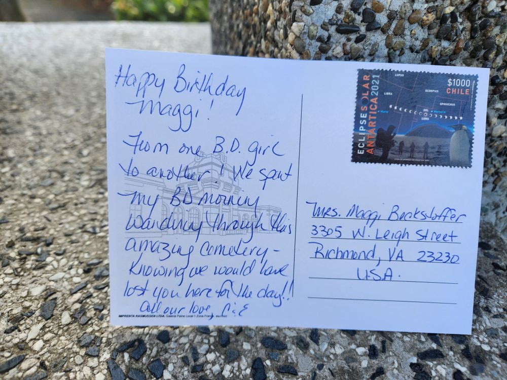 Even though it is a cemetery, it is quite beautiful and peaceful. A wonderful walk on a beautiful day. We continue on our wanderings trying in vain to find the burial site of the 100+ crew of the Doterel, a British gunboat that exploded off Punta Arenas port in 1881. We didn’t find the Unknown Indian monument either, the map defeated us – but nonetheless we had a fabulous time walking around and exploring. And bonus! We got a free postcard with postage when we paid our entrance fee (have no idea why, because the 2 people in front of us didn’t get it!). The sweet guy who gave it to us pantomimed about sending it anywhere and pointing to the mailbox right in the lobby where we can mail it. So of course – since it is my birthday and Maggi’s is coming up and we are doing what she absolutely adores to do – exploring cemeteries – we send it off to her as a birthday greeting We shall see when (and if) it arrives! (PS – it did arrive…April 7th!)
