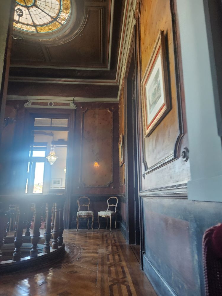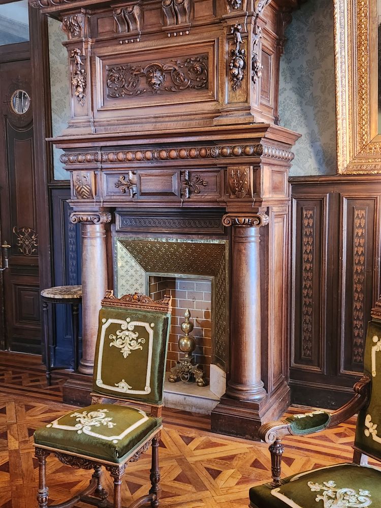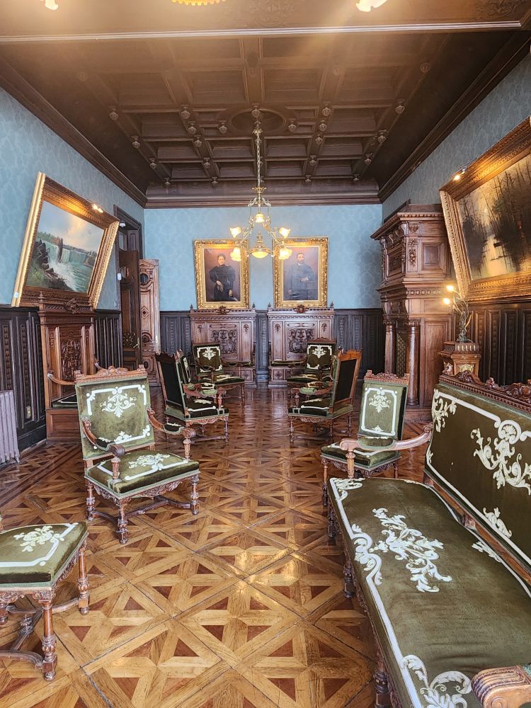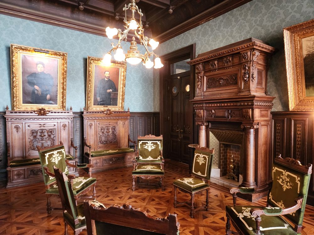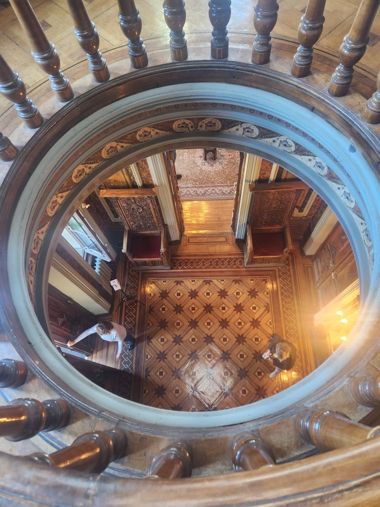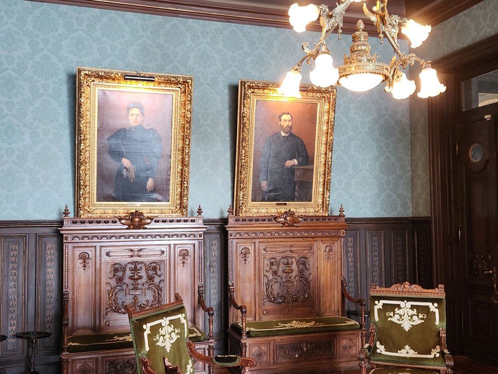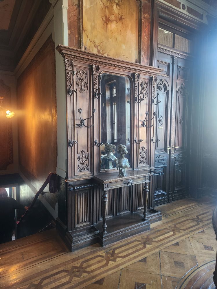 So, back we go, and this time we do make it up into the vestibule and pay our entrance fee and begin to wander through the 2 stories of rooms available for viewing. Because there is a large tour group on the lower level, we start up the narrow staircase and explore the 2nd floor first. There is a dining room up here along with a billiards room and an awesome loft like area that surrounds a cut through to the first floor entrance lobby. All very 1800’s European Belle-Epoque feeling.