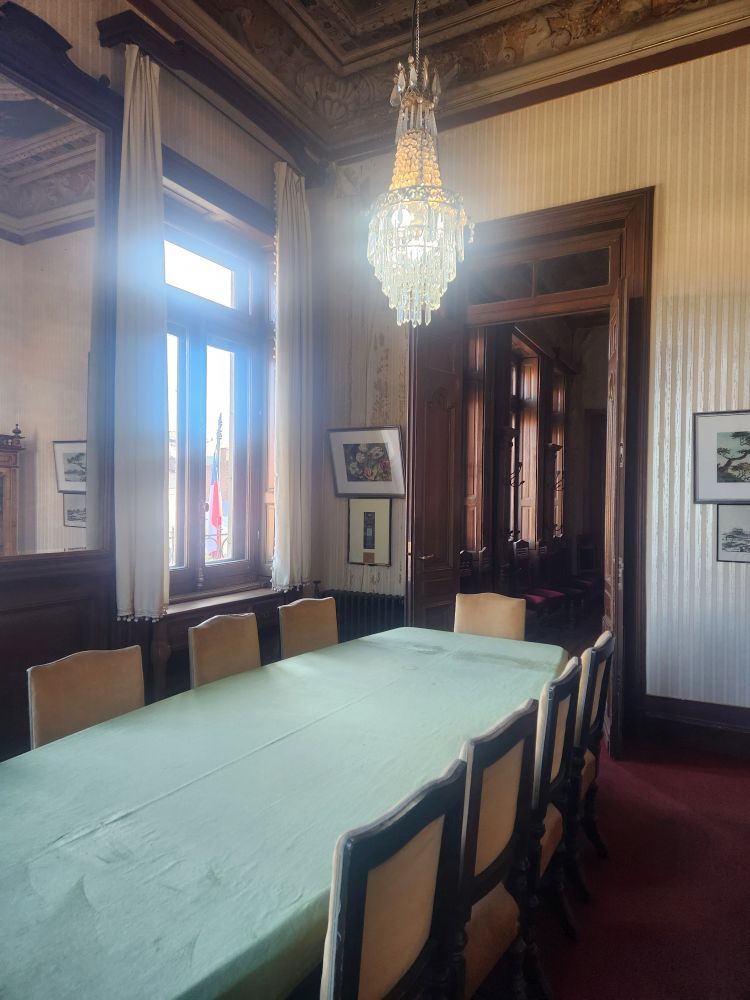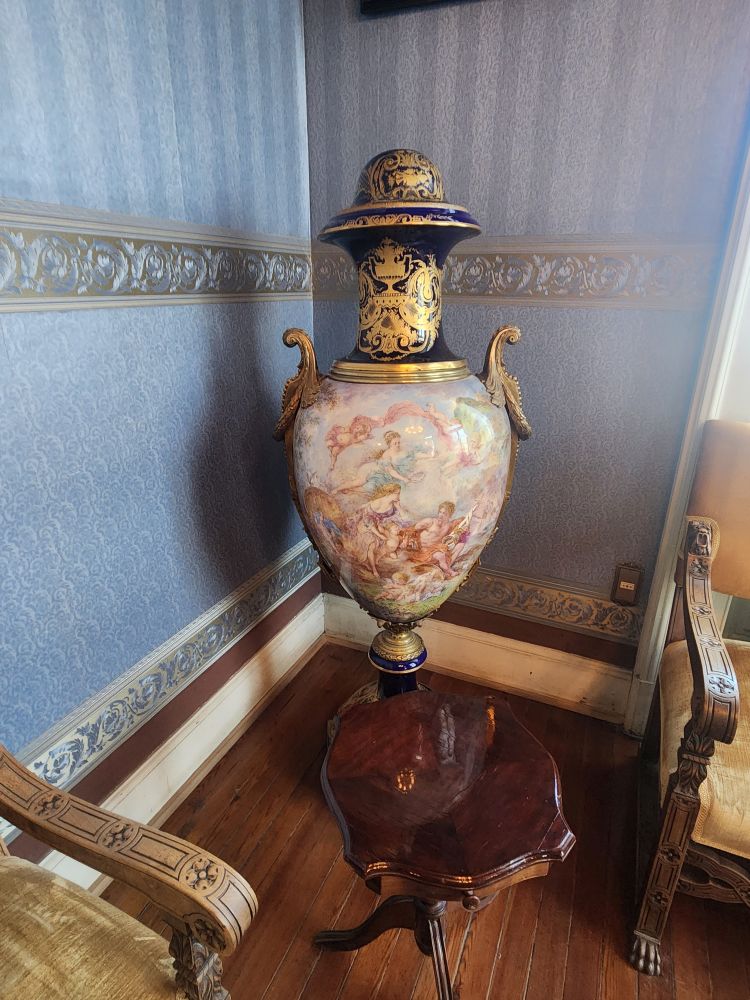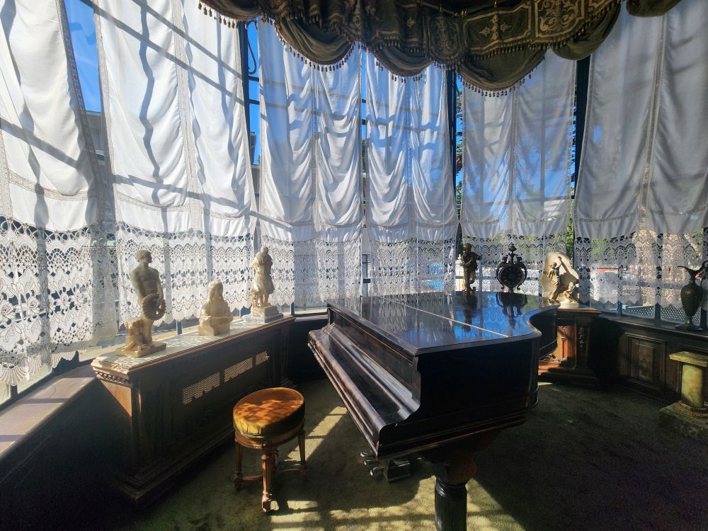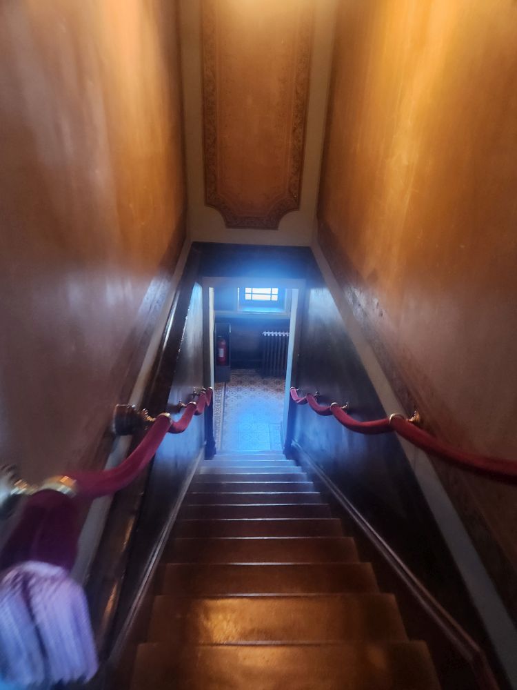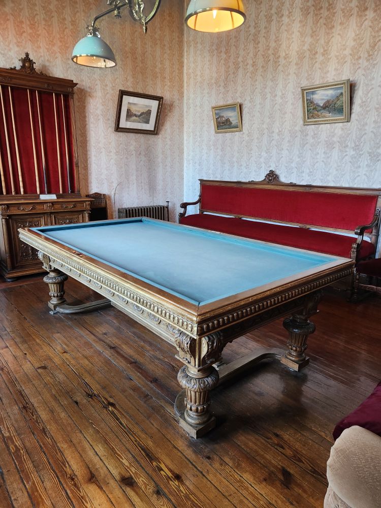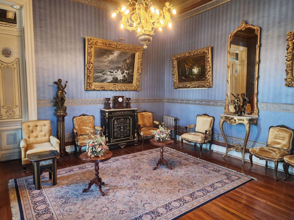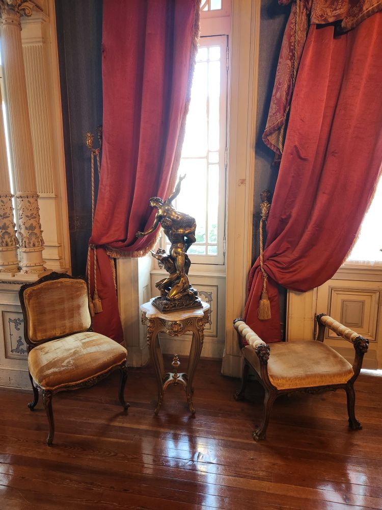 So, back we go, and this time we do make it up into the vestibule and pay our entrance fee and begin to wander through the 2 stories of rooms available for viewing. Because there is a large tour group on the lower level, we start up the narrow staircase and explore the 2nd floor first. There is a dining room up here along with a billiards room and an awesome loft like area that surrounds a cut through to the first floor entrance lobby. All very 1800’s European Belle-Epoque feeling.