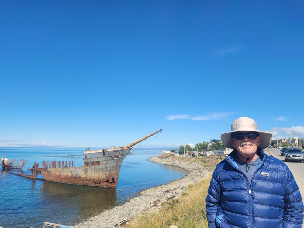 Now that we’ve lunched, we need to walk it off (those French fries! Didn’t need them, and to add insult to injury, mine cost extra – not the cheapest of meals, we can tell you that!). We walked back to the waterfront and followed the promenade (mostly sidewalk) down the coast to find the Lord Lonsdale shipwreck, which CD Ed said caught fire and was scuttled in 1909 in Port Stanley and then 15 years later popped up here. What? No way! (Actually, no way is correct. He made it sound like it literally disappeared in Port Stanley and magically reappeared here. But the real story is that the steel hulk was sold to a company of traders who moved it to Punta Arenas for reasons unknown, and then literally abandoned ship – leaving the rusting hulk to sit since 1940. CD Ed’s story is much more fun though!) It is a decent hike down to the ship, about 1.5 miles, but a lovely day to do it. Brisk without too much wind, beautiful sunshine. And the wreck is pretty cool to look at – as you can see from the pictures we took!