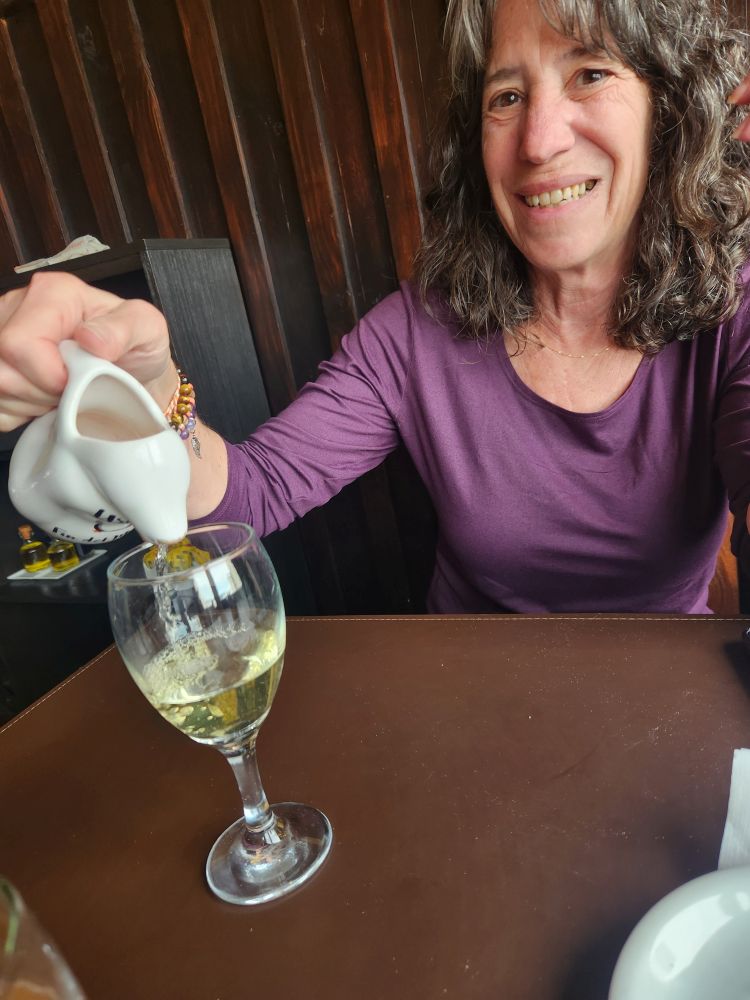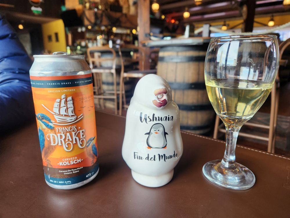 We take the “prison” elevator up to the 3rd floor and walk into the quirky taberna where we have a nice view across the harbor with all the expedition ships, a great local beer, a Francis Drake Kolsch, and a fabulous glass of wine served in a penguin carafe! I so want that penguin carafe!