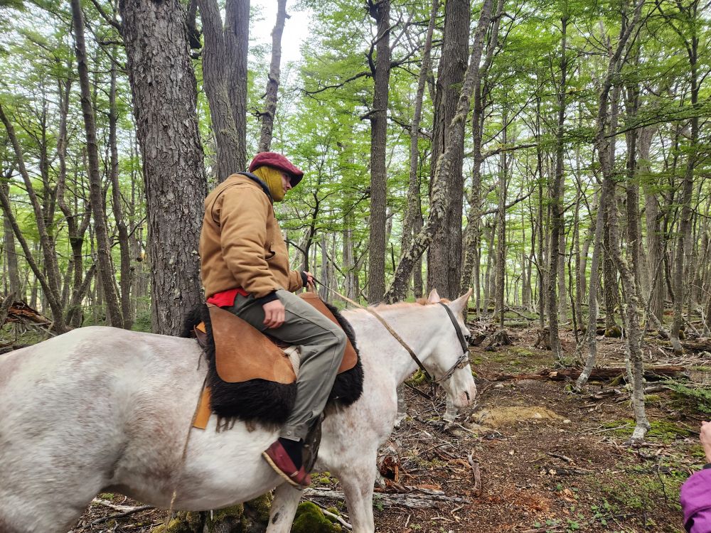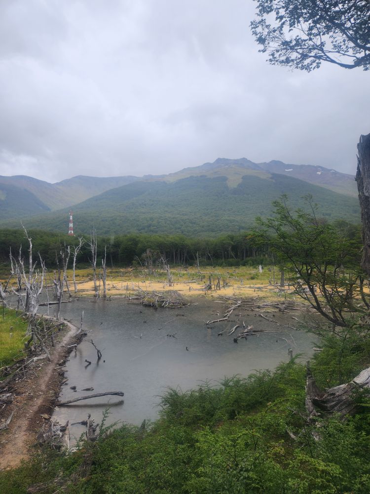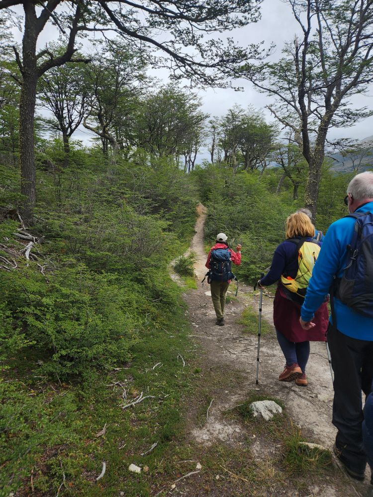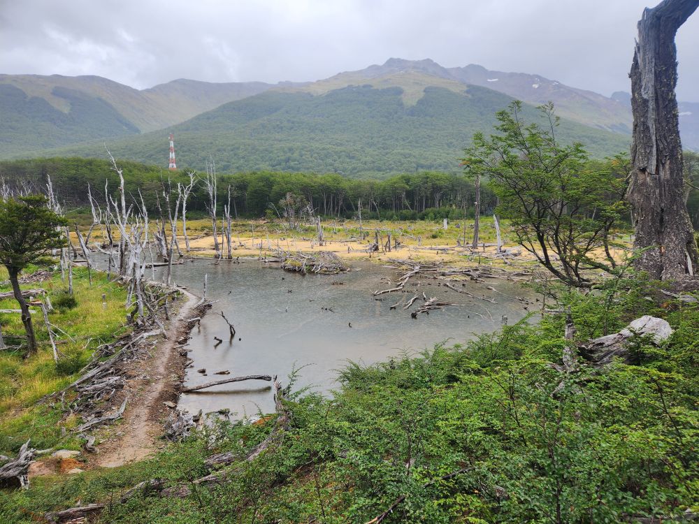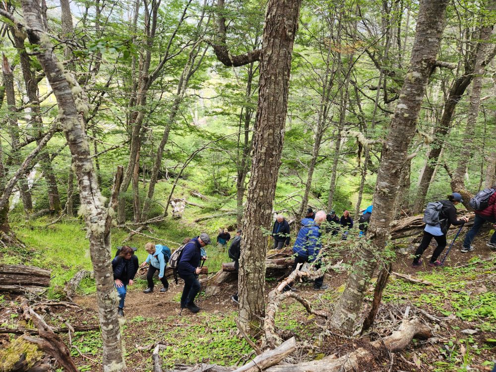 Mariana goes on to explain about the forest, full of high deciduous trees called lenga in Spanish. She also goes into more detail about the animals found in the forest – most introduced here (as mentioned previously). There are 2 types of fox, the grey fox was introduced to eat rabbits, but they found that the grey fox didn’t like to eat the rabbits, so now they have an abundance of fox and rabbit. There is one native fox, and that is the red fox. You can sometimes see the fox in valley. There is a llama called Guanaca in the north part of the island that is native. And then there are mink, introduced from America, to establish a fur trade, but they ended up being short haired mink, so they aren’t any good for clothing. The beaver was introduced from Canada, again to try to establish a fur trade. But that didn’t really happen either and the beavers became invasive and have spread exponentially. They’ve caused millions of dollars of damage to the land and environment but are now virtually impossible to eradicate. Of course, on our trek we are going to specifically go to see the beaver dams, so they are sort of a tourist attraction now as well!