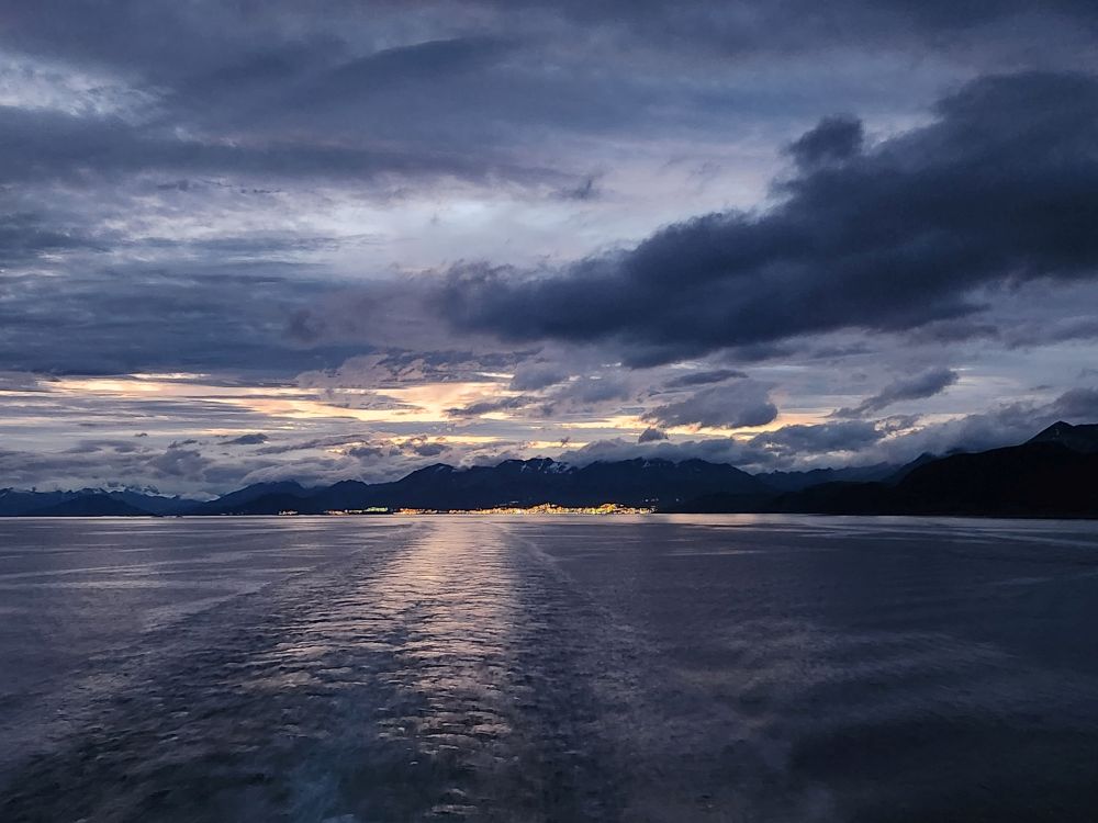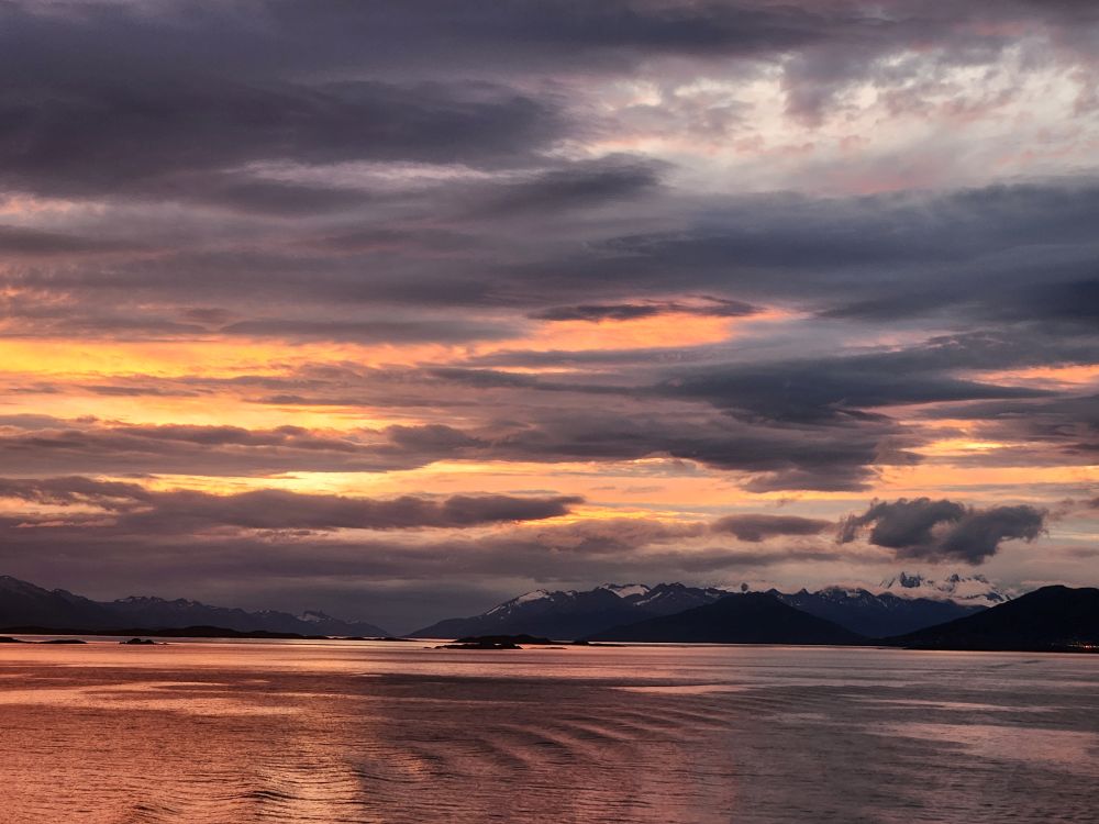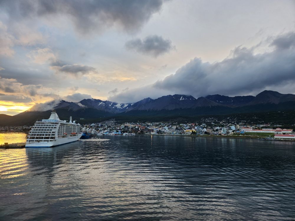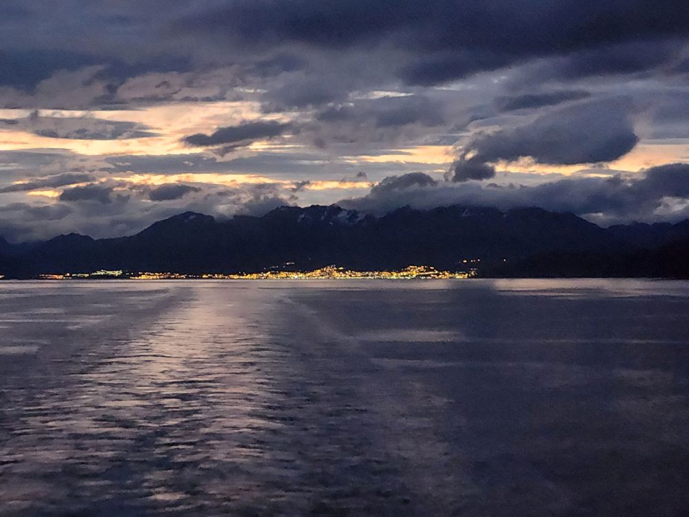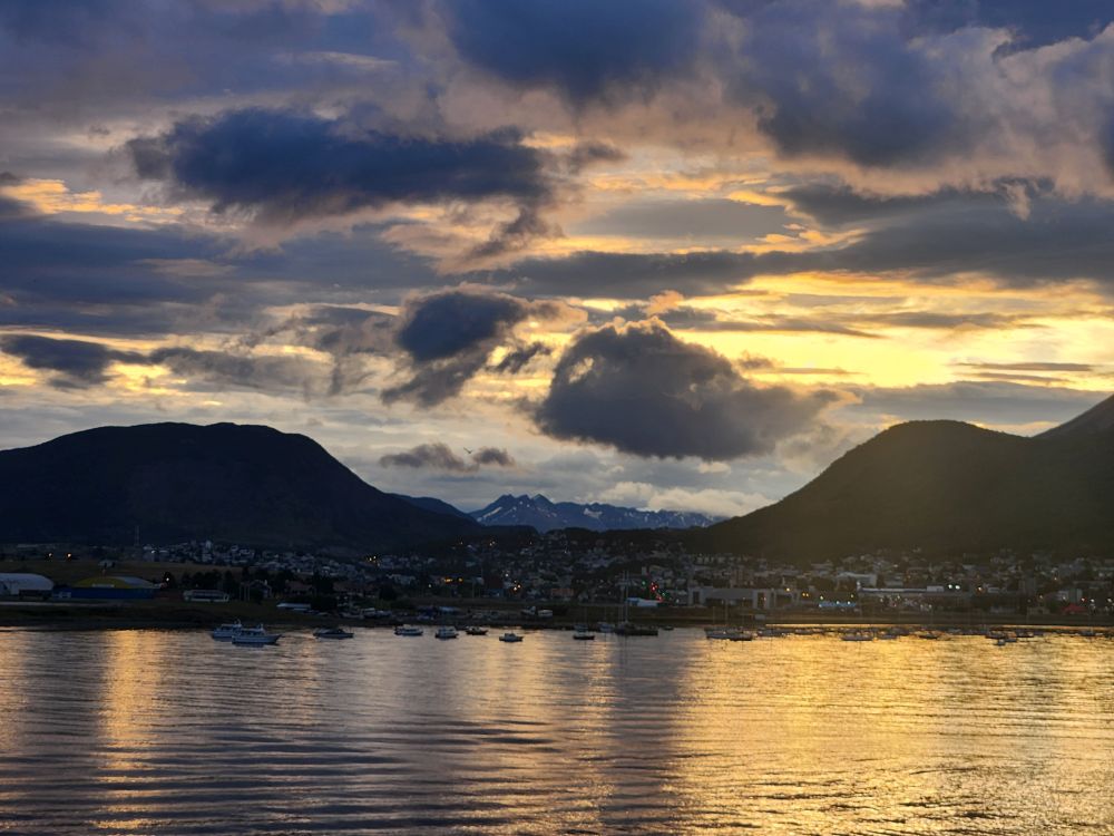 Back in the cabin – no show for us as it is some singer/guitar/piano/I don’t know what in whom we are not interested – we are greeted with a spectacular sunset and beautiful night time views as we sail away from Ushuaia, the southern most place in the world….besides Antarctica!