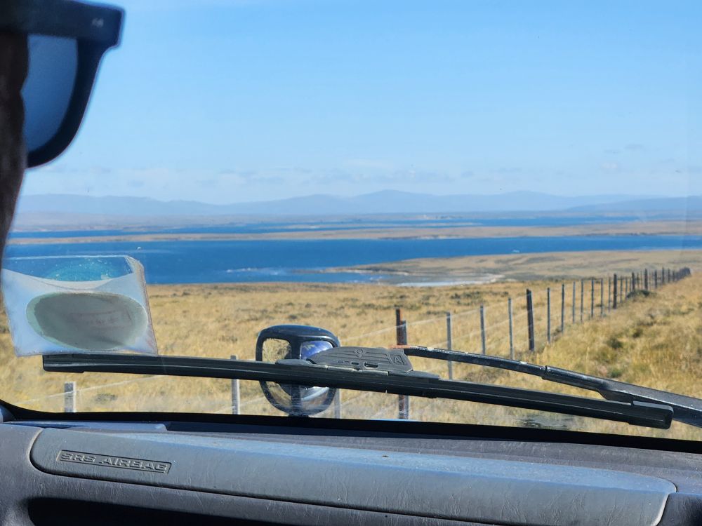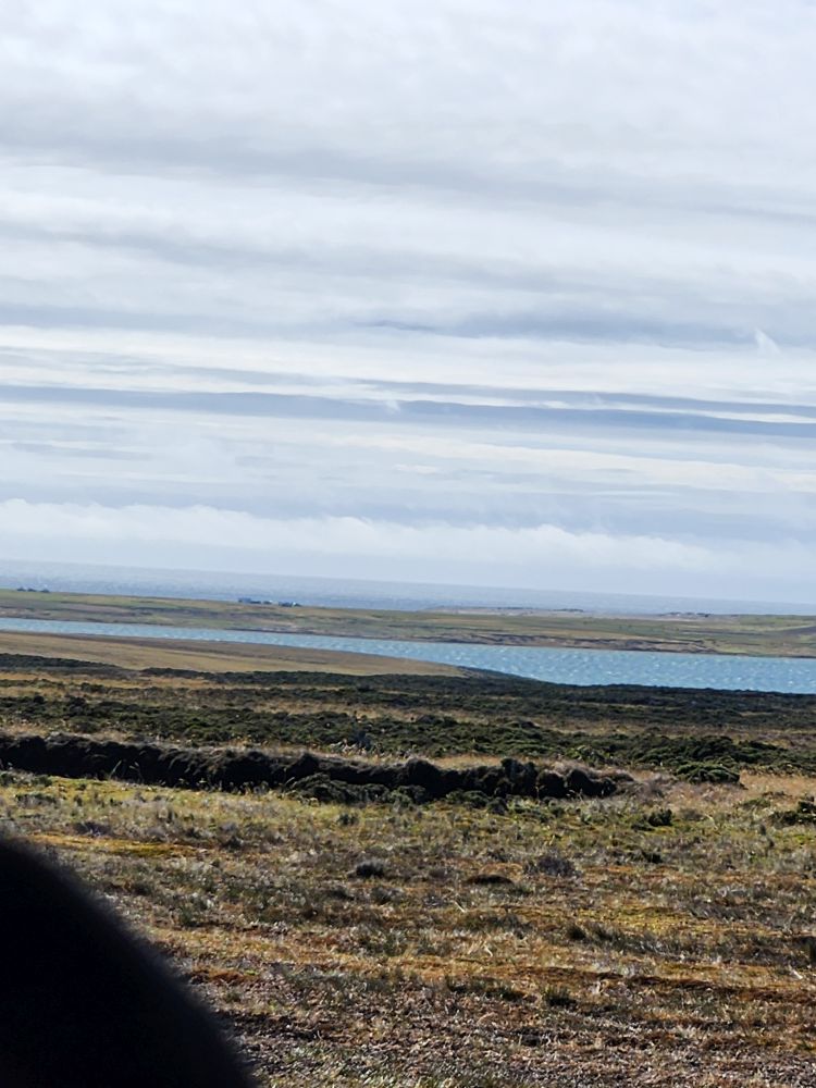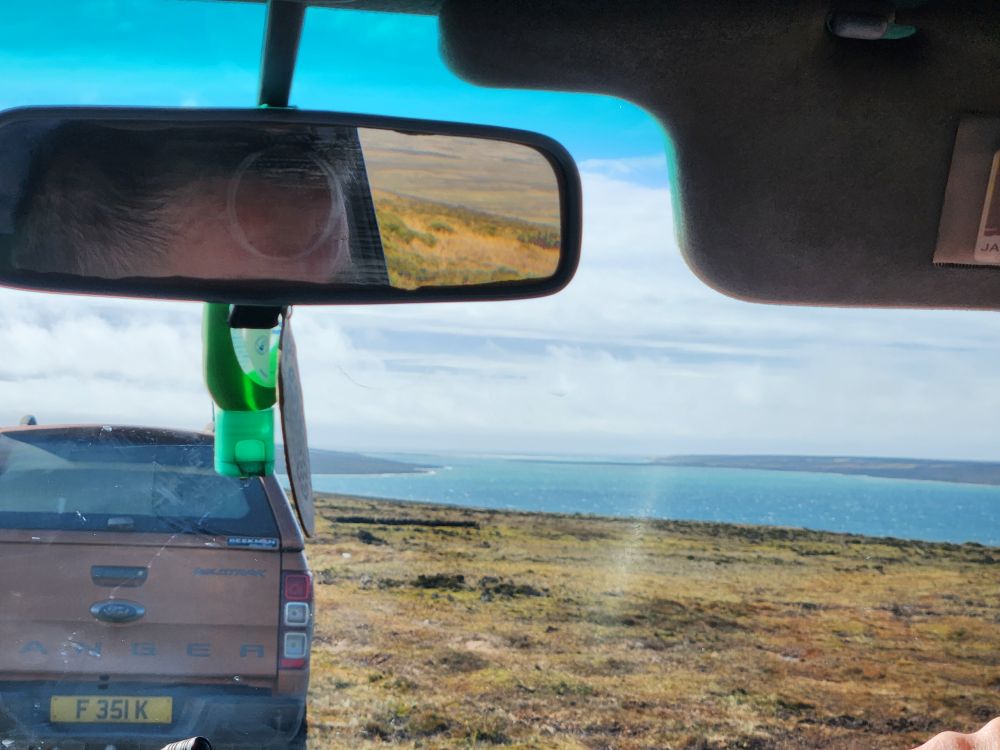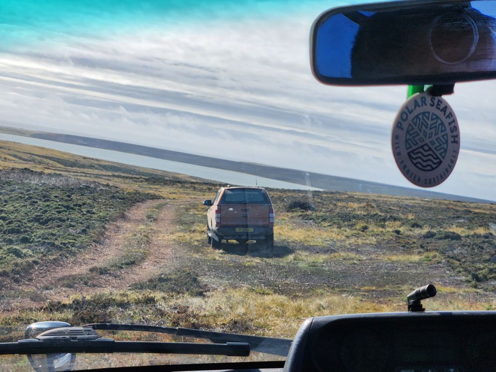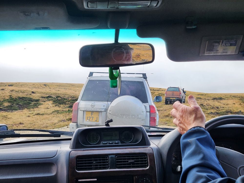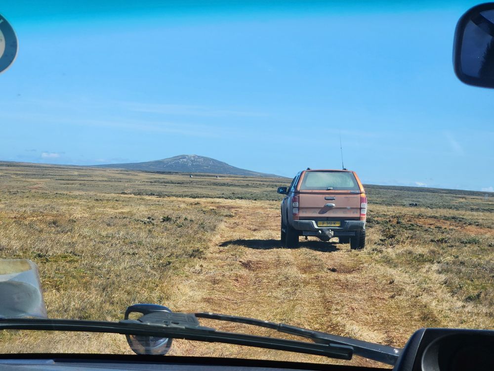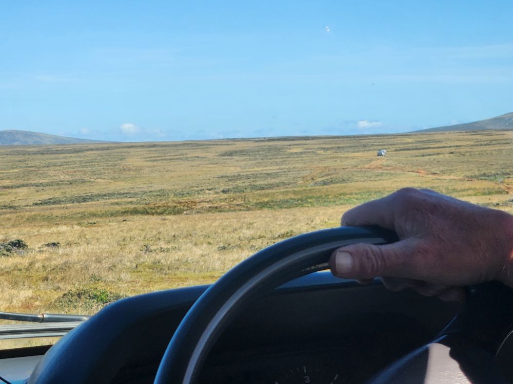 Snack complete, group together, we head back out across the moss fields toward Port Stanley. The drive back, while just as long, is so much better now that the fog has cleared. The sky is cloudless and we can really see the vistas – and the trucks in front of us as they drive over the rough terrain as we follow!