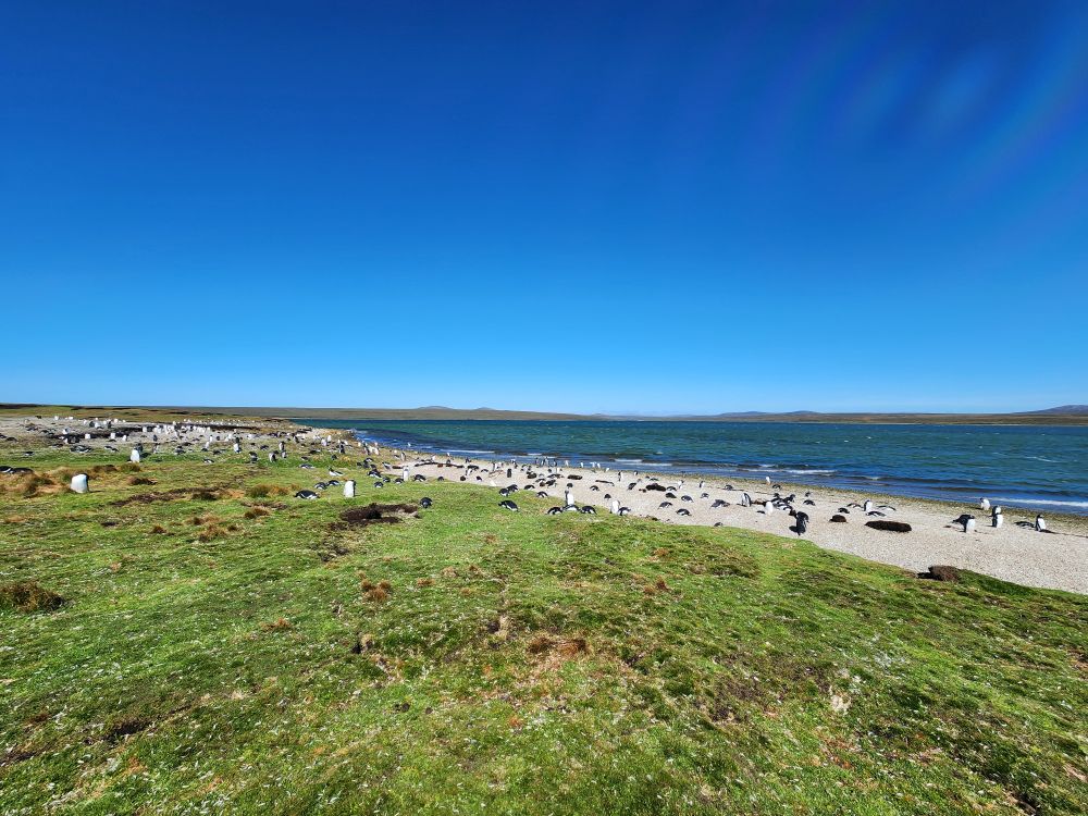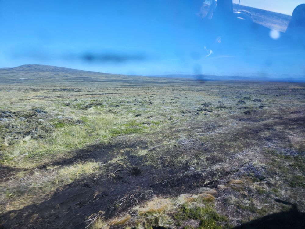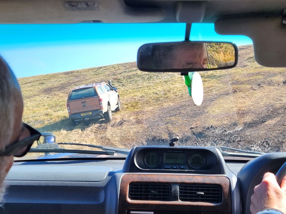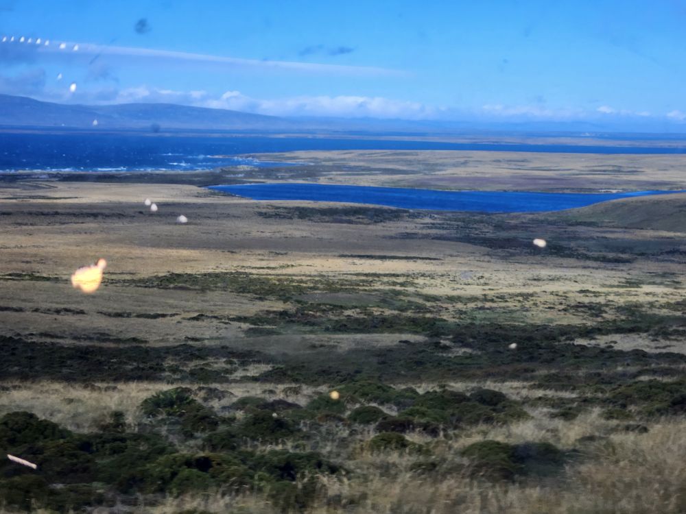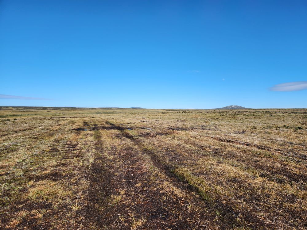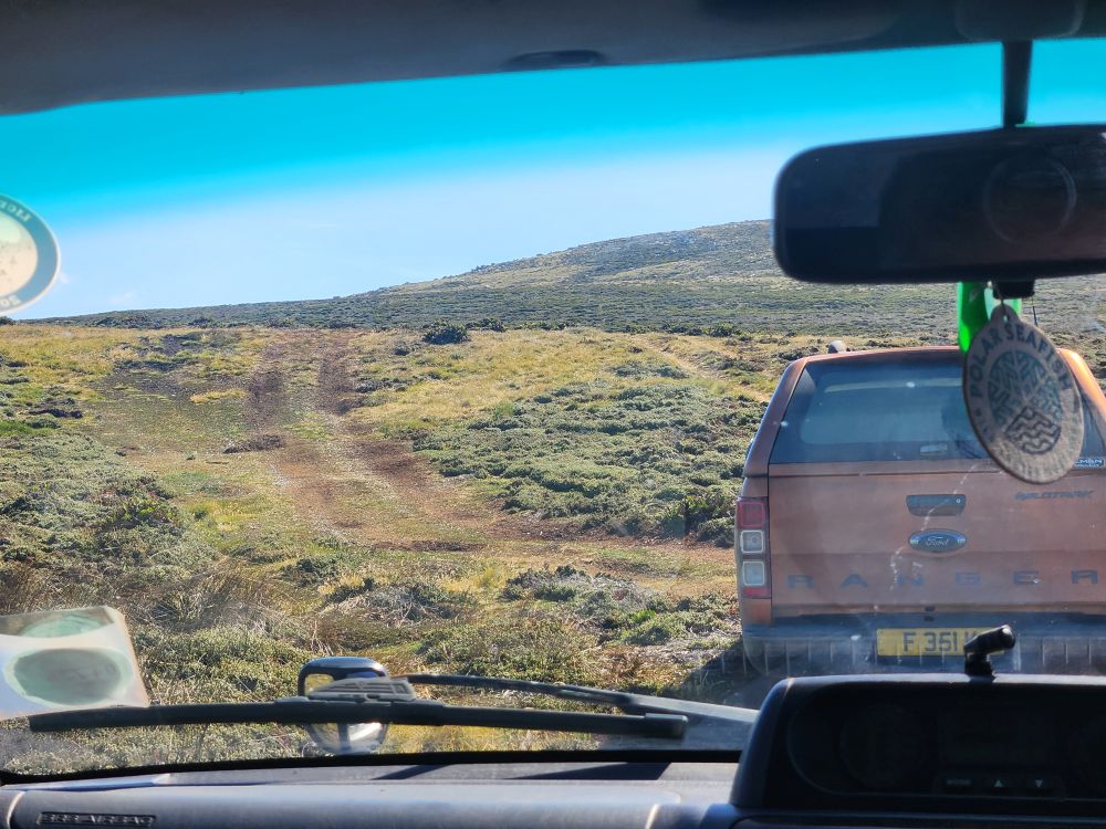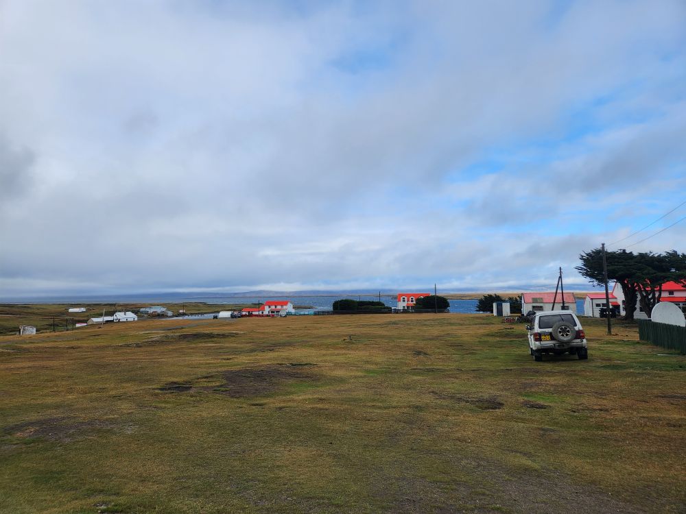 Snack complete, group together, we head back out across the moss fields toward Port Stanley. The drive back, while just as long, is so much better now that the fog has cleared. The sky is cloudless and we can really see the vistas – and the trucks in front of us as they drive over the rough terrain as we follow!