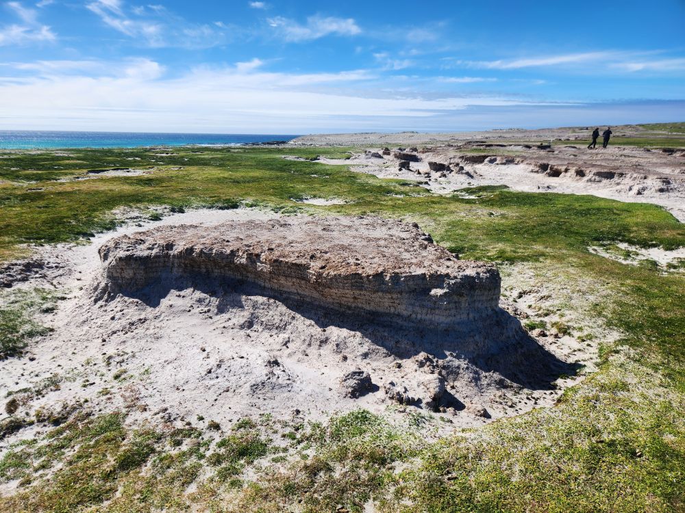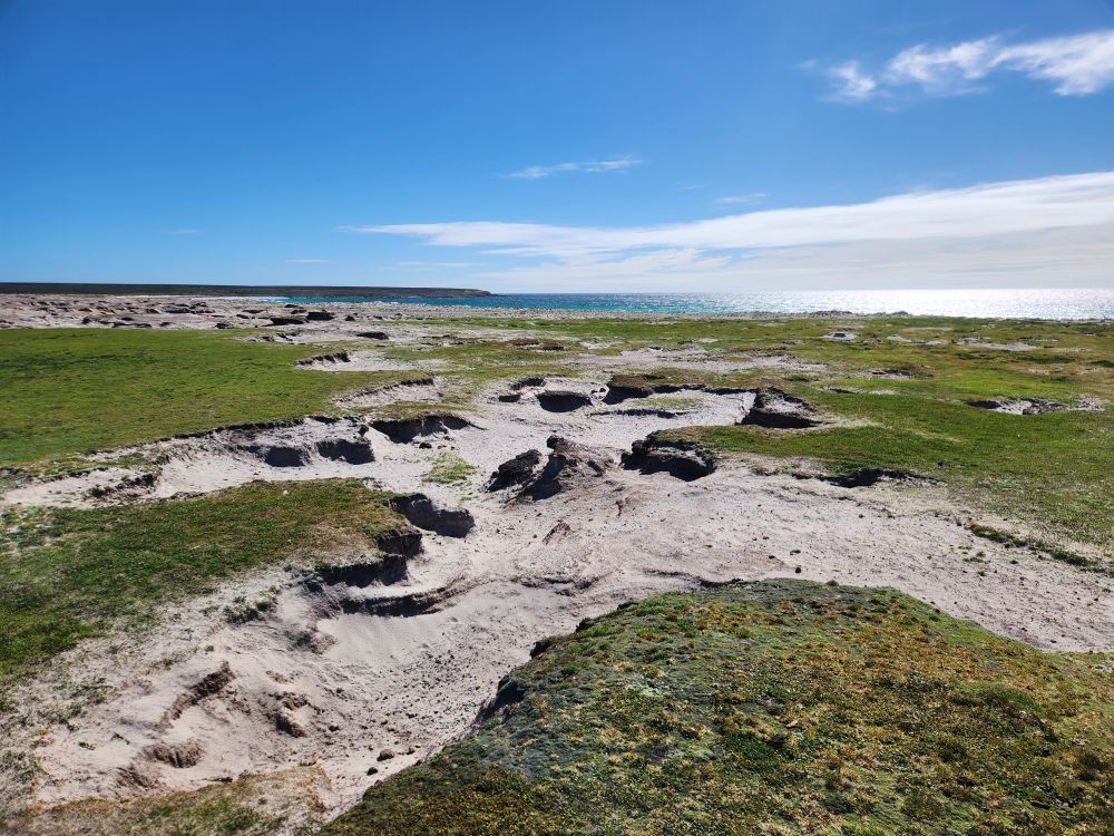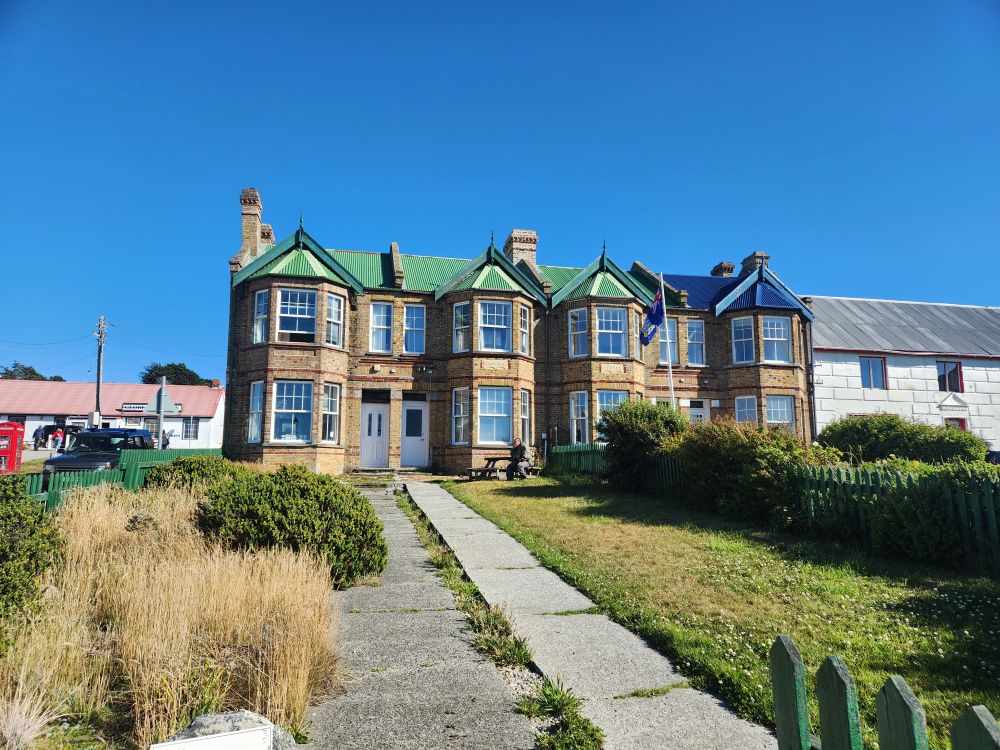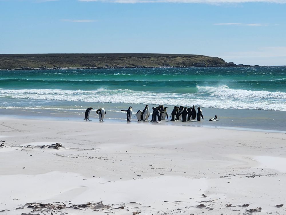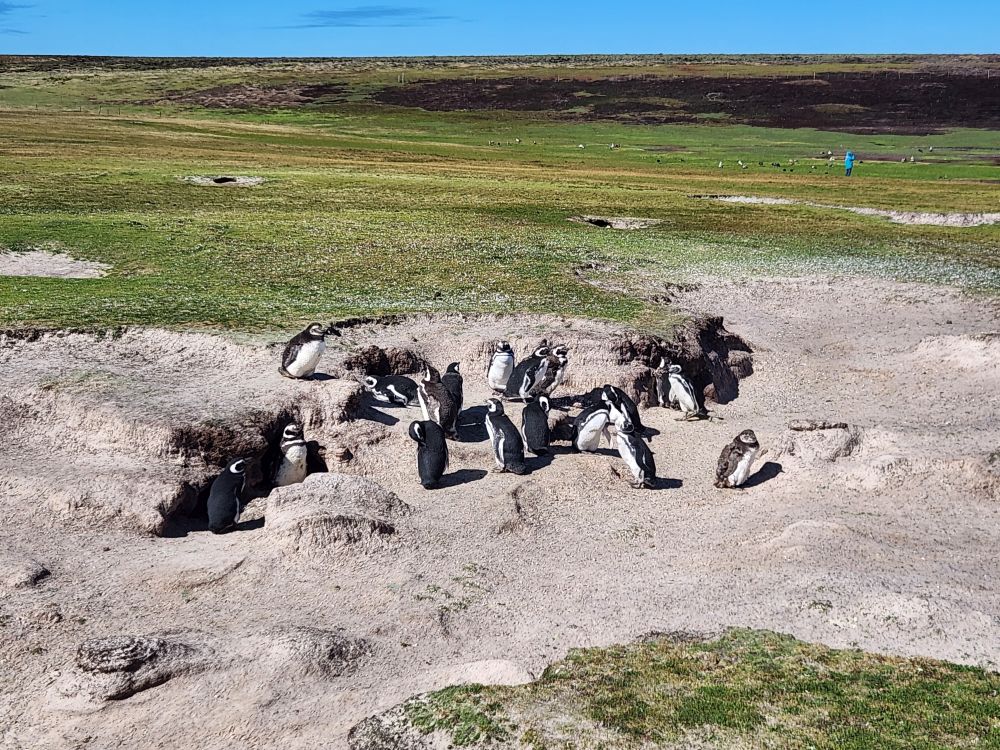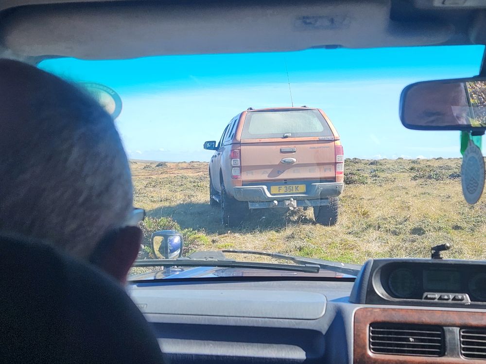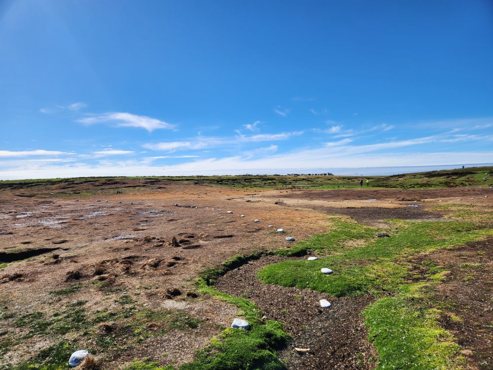 Snack complete, group together, we head back out across the moss fields toward Port Stanley. The drive back, while just as long, is so much better now that the fog has cleared. The sky is cloudless and we can really see the vistas – and the trucks in front of us as they drive over the rough terrain as we follow!