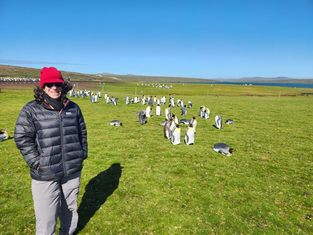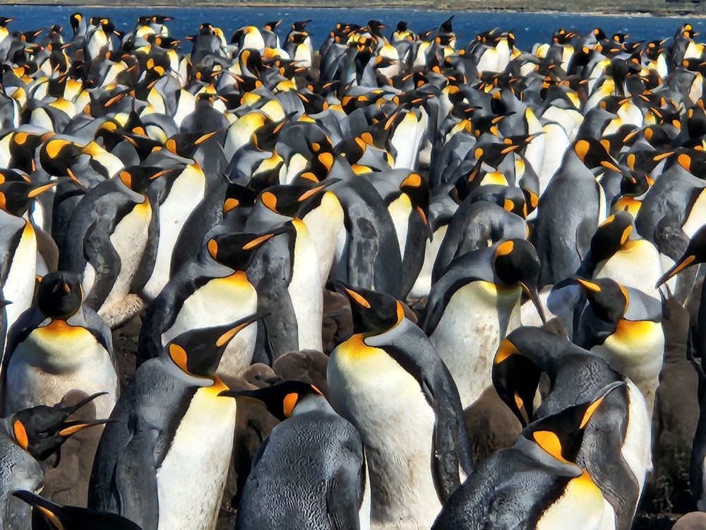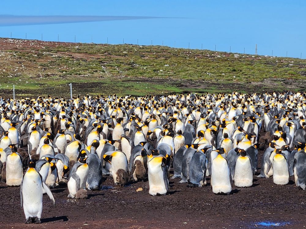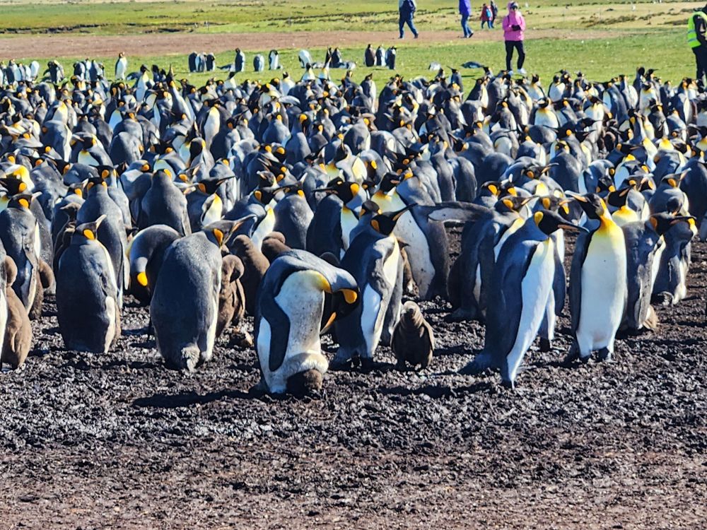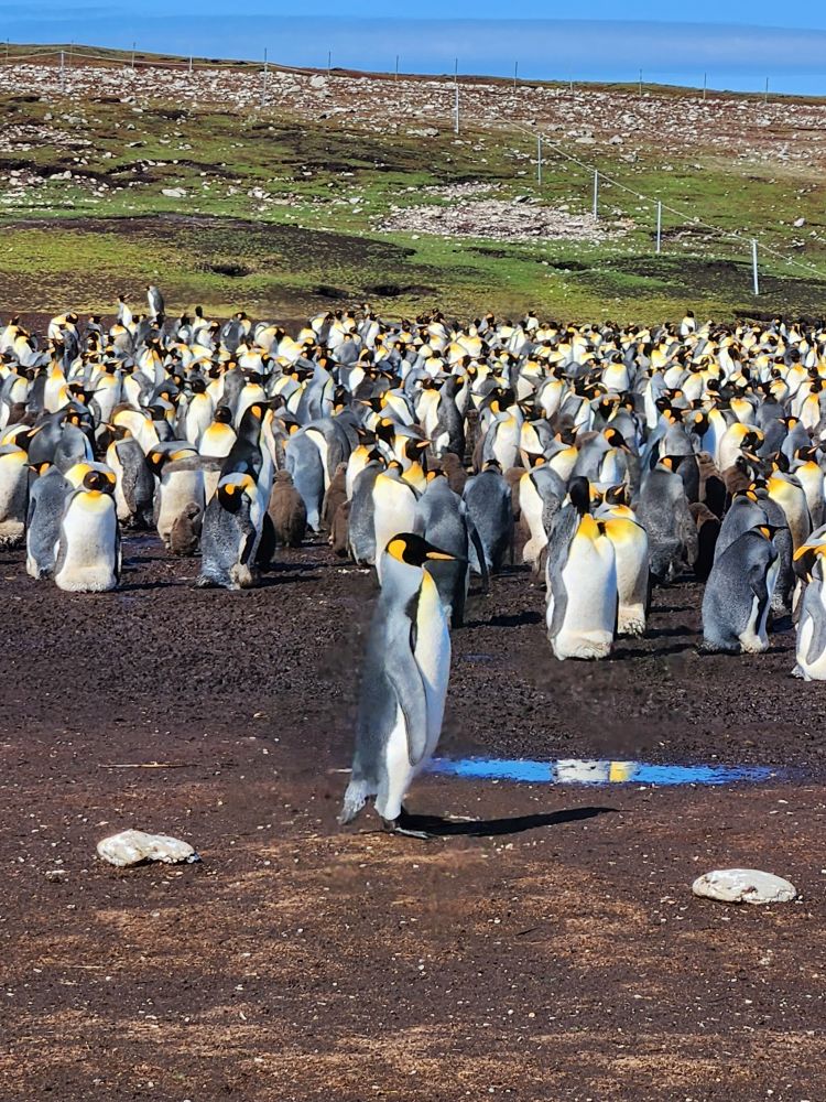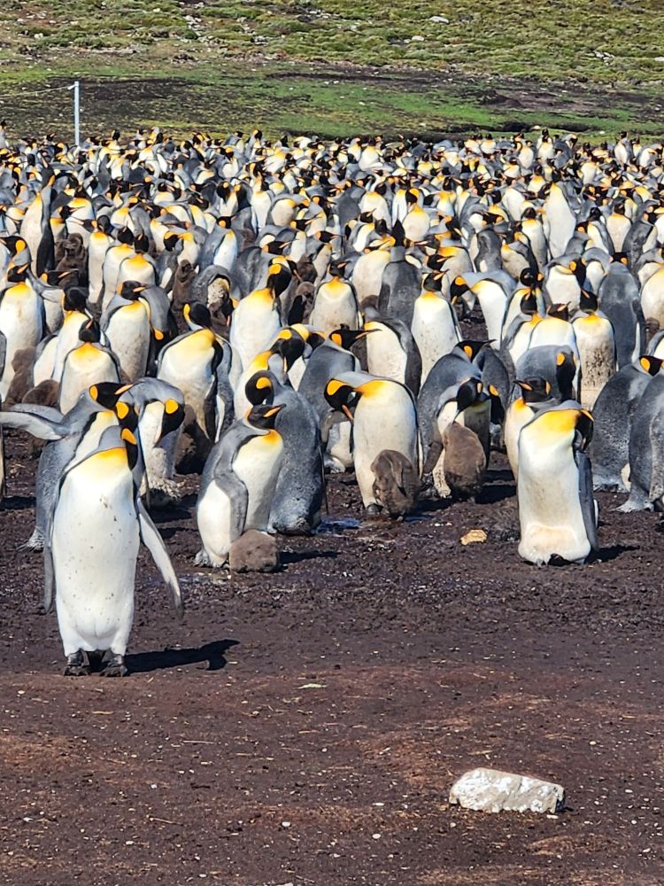 We have an hour and a half here, which in the beginning we are wondering how we are going to fill 90 minutes – but turns out that isn’t a problem! Immediately we head out to the King Penguins. They are almost all together in a big circle outlined by white rocks. Thousands! Along with baby chicks that are sort of hard to see, they are small and brown and furry, and mostly hiding behind or beside their parents.