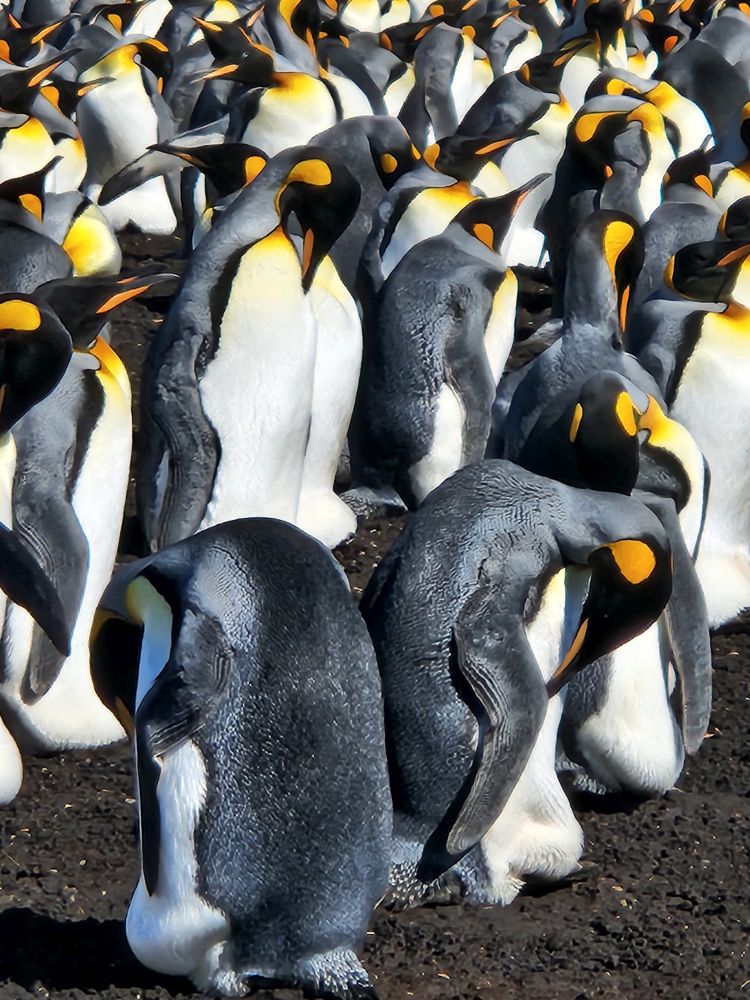 The Kings are the biggest penguins here, growing up to 3 feet tall and weighing as much as 33 pounds. They live for about 20 years and stay here year round, mating and raising their chicks. We’re here at the perfect time, the chicks are still around and growing, and most of the pairs are here protecting them as well.